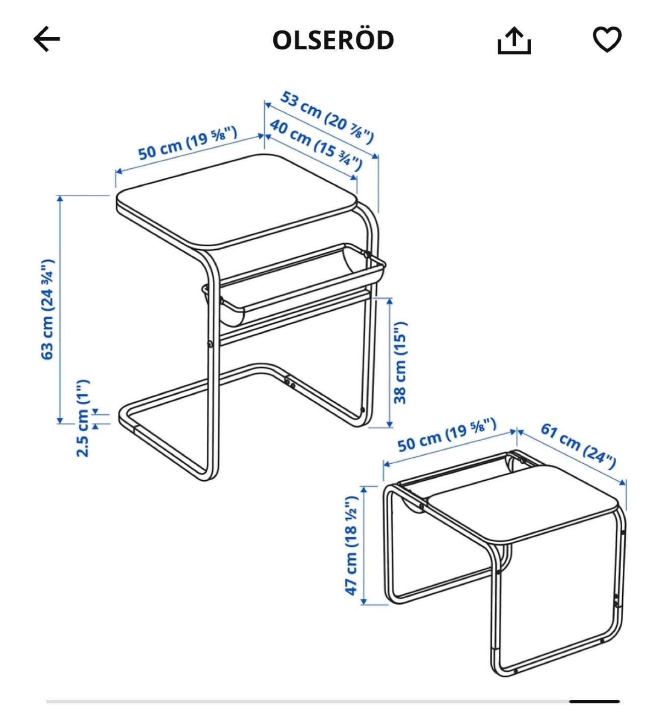 115Selling an IKEA OLSERÖD bedside table in great condition! It's perfect for small spaces and has a handy storage compartment for books or magazines. Dimensions are 53 cm (20 7/8") x 40 cm (15 3/4") on the tabletop, and it stands 63 cm (24 3/4") tall Cash and pick-up ONLY First come first serve