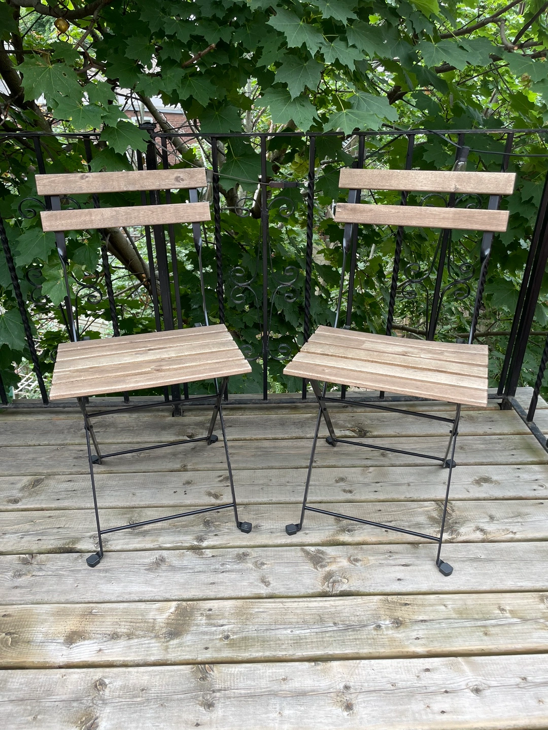 Two wooden outdoor patio chairs with black metal framing. Foldable. Great for balconies, backyards, front stoops pr anywhere outdoor or indoor.