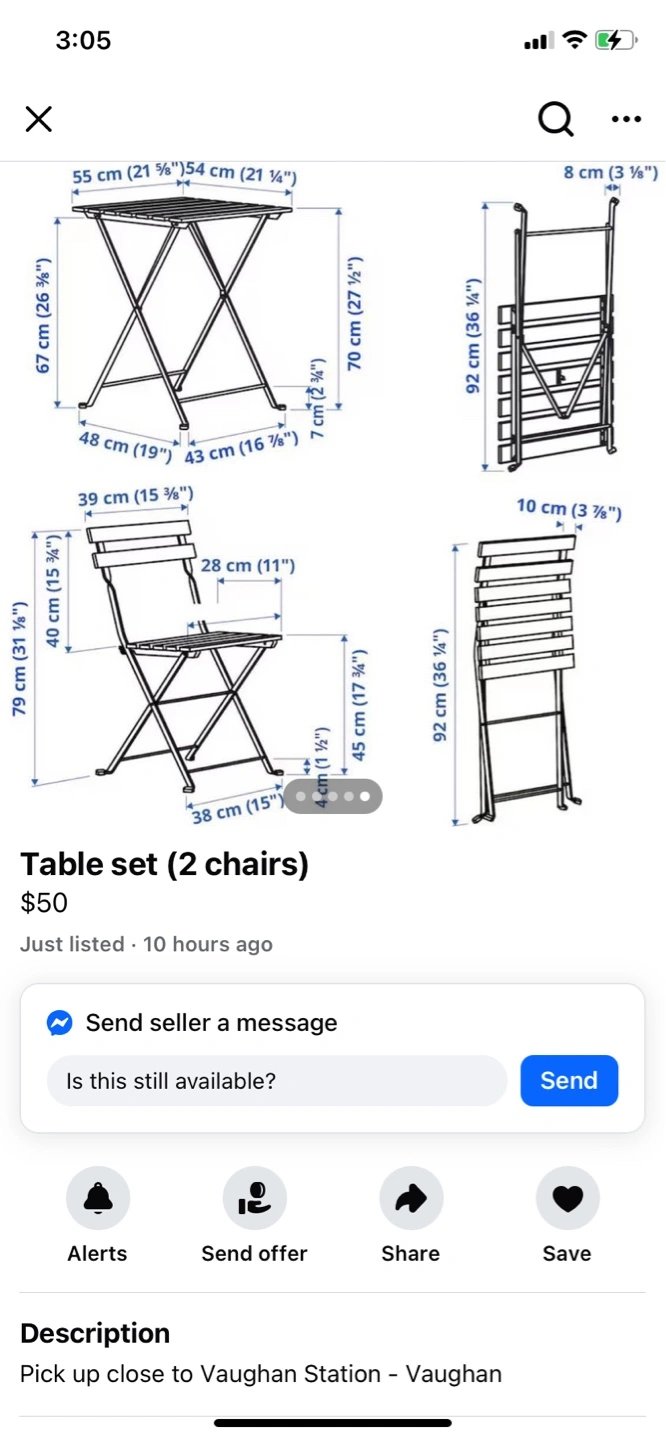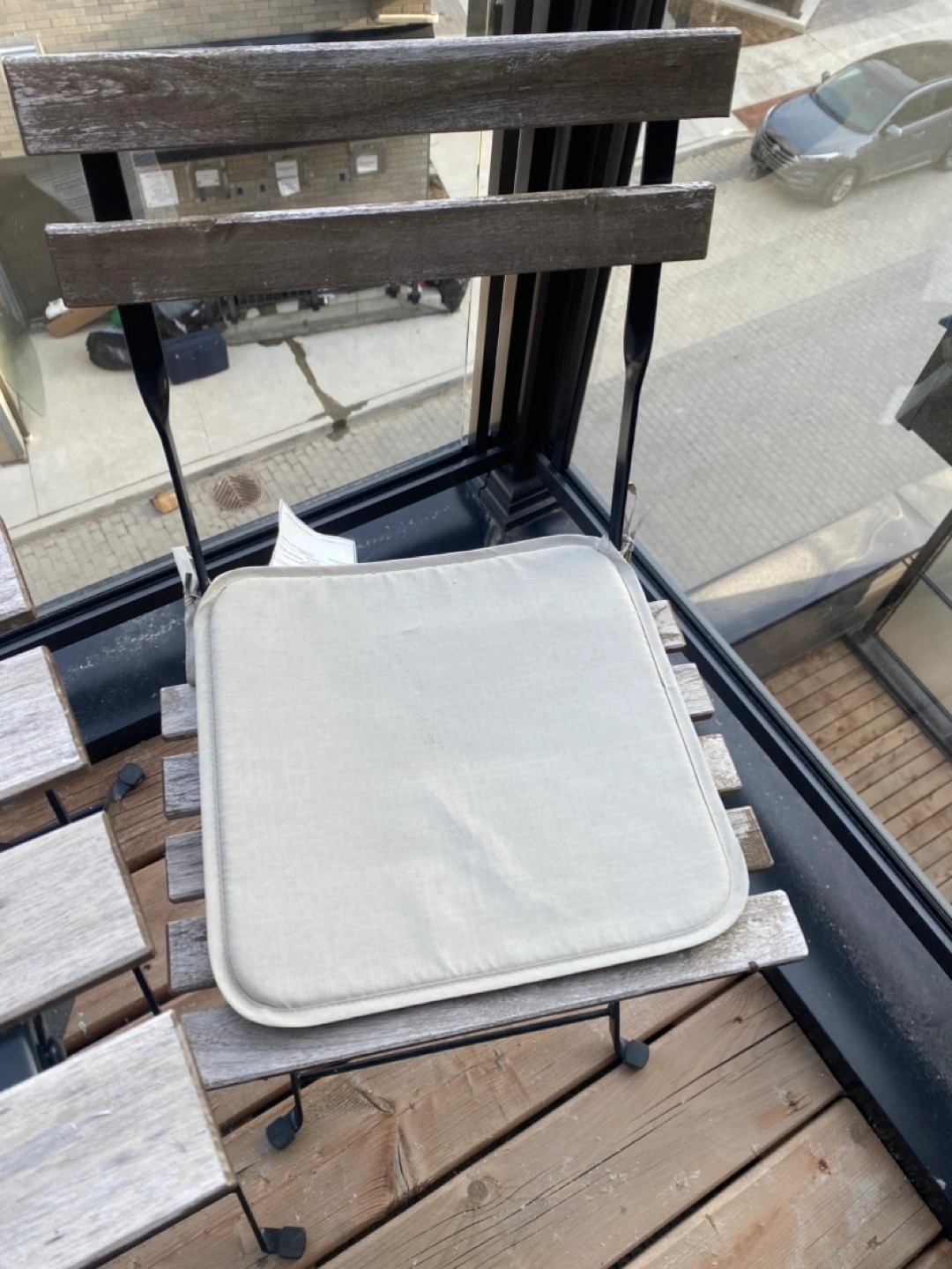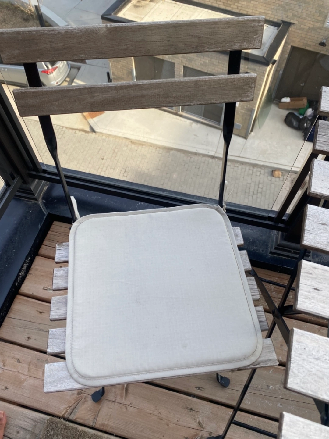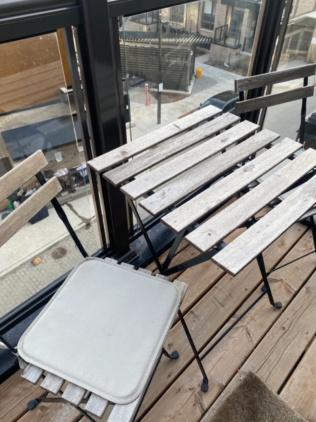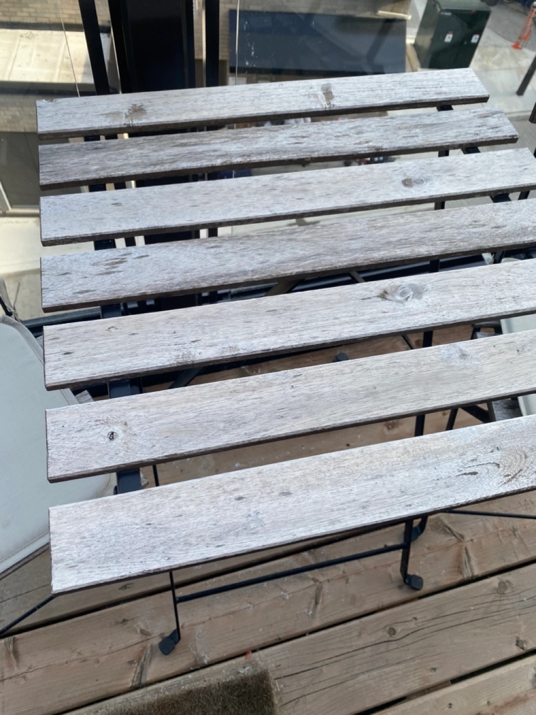 Foldable metal frame patio set. Grey-washed wooden slats. Includes two chairs with off-white cushions. Excellent for small spaces.