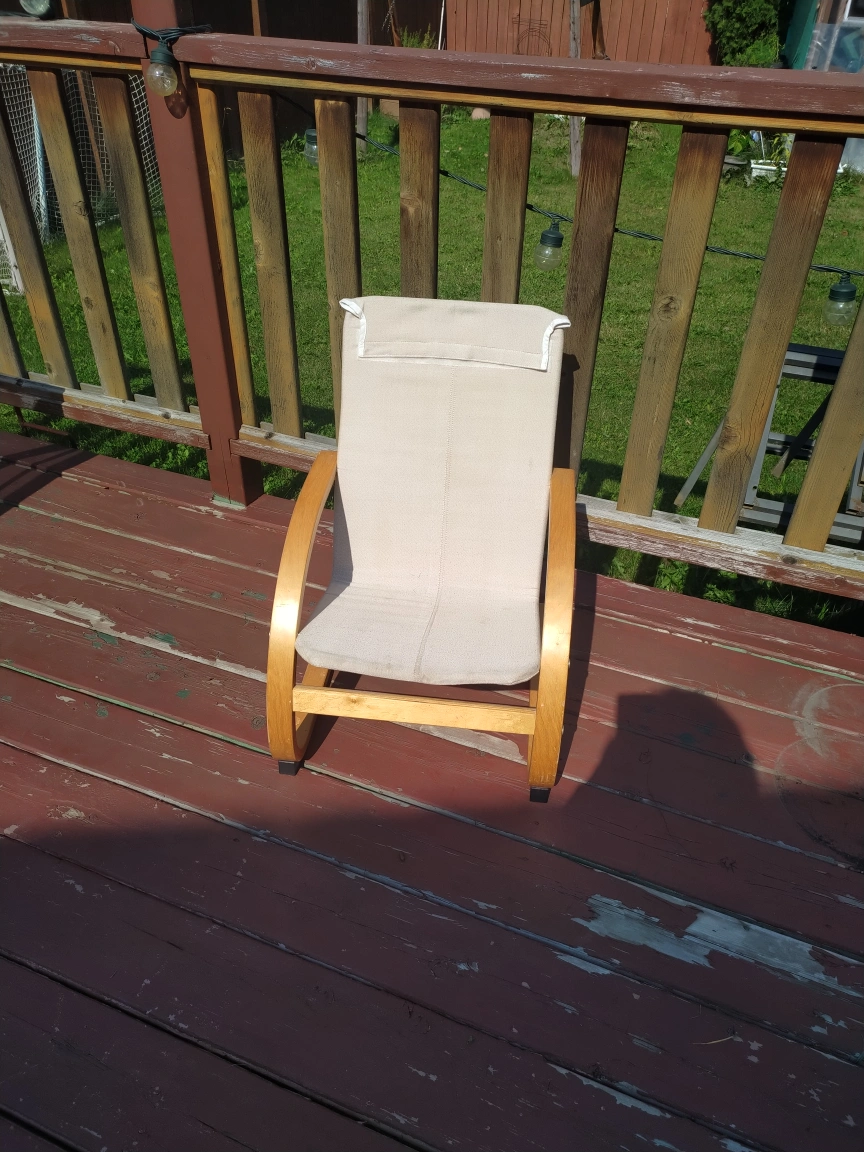 60Selling a gently used IKEA POÄNG rocking chair. It features a comfortable Almås beige frame cover and a sturdy birch veneer frame. Perfect for relaxing on the deck or in your living room! Just add your own cushion cover to personalize!