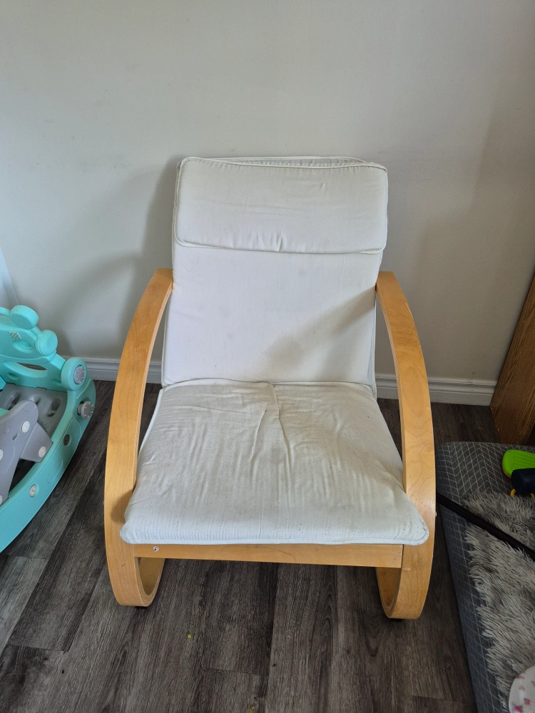 18Selling a gently used IKEA Poang rocking chair. It features a comfortable white cushion and a sturdy birch veneer frame. It's perfect for relaxing and adding a touch of style to any room!