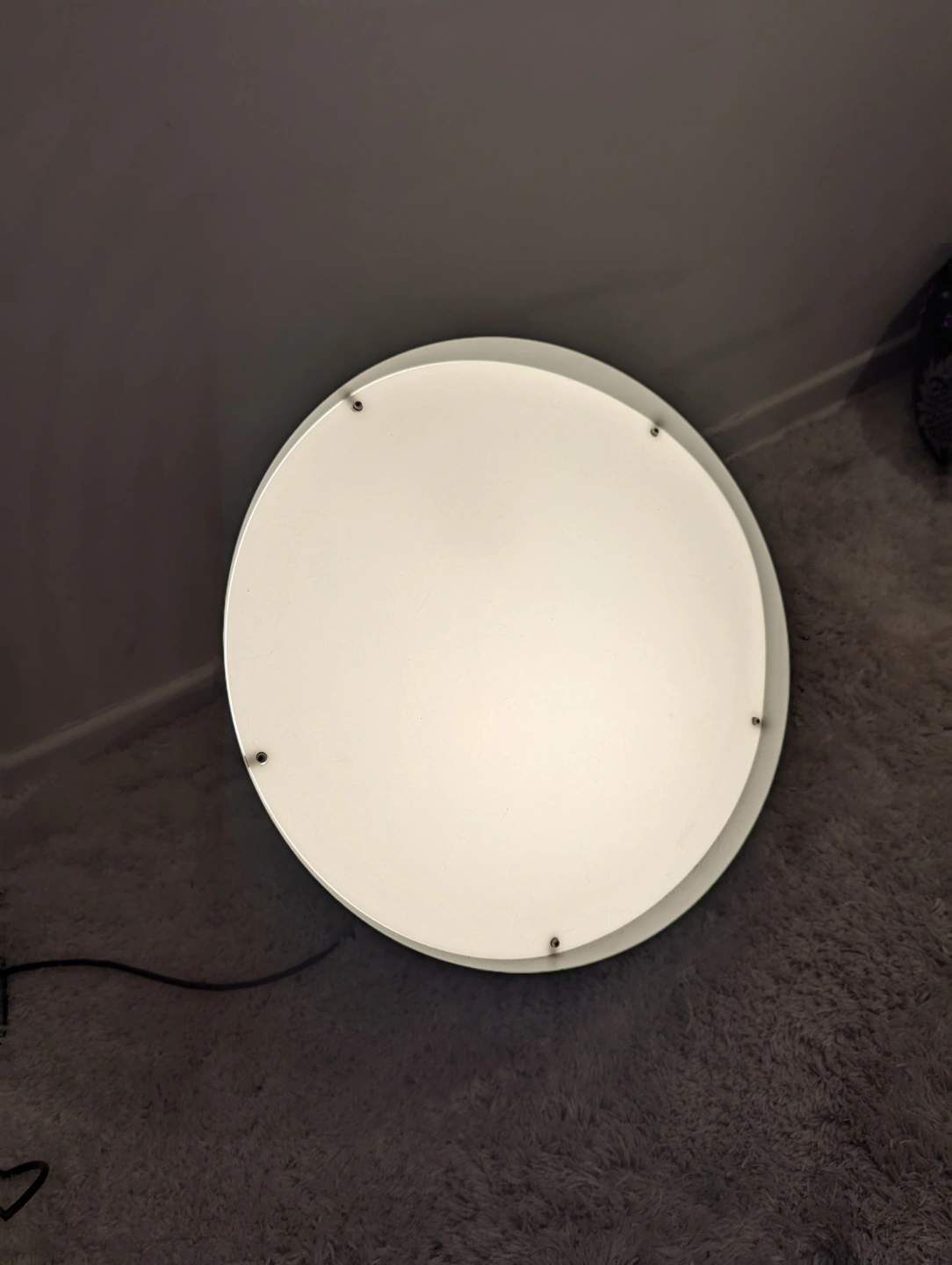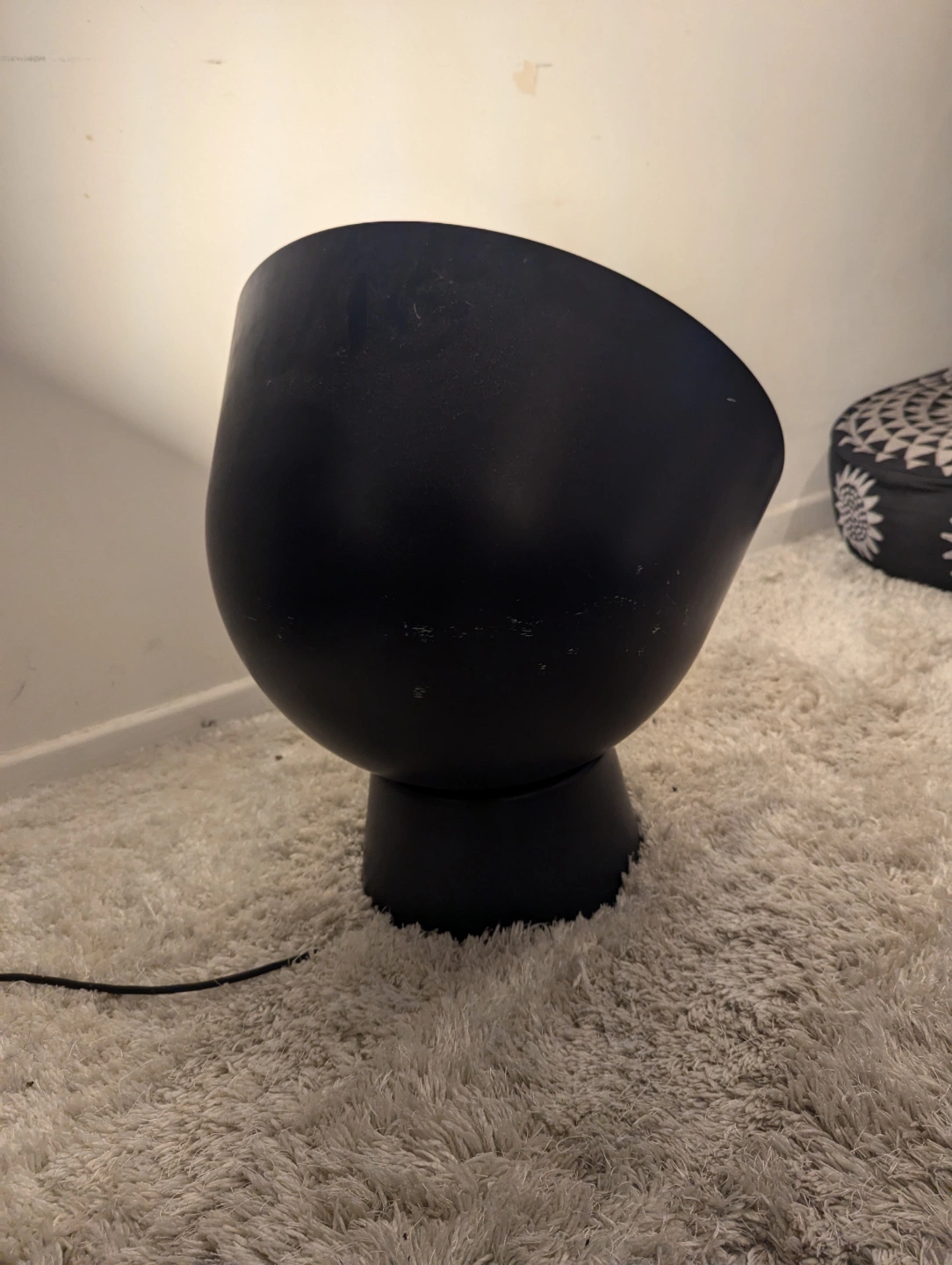 Stylish navy blue floor lamp. Features a curved shade and a wide, circular base. Minor cosmetic wear visible. Includes power cord and remote dimer with 3 color options.