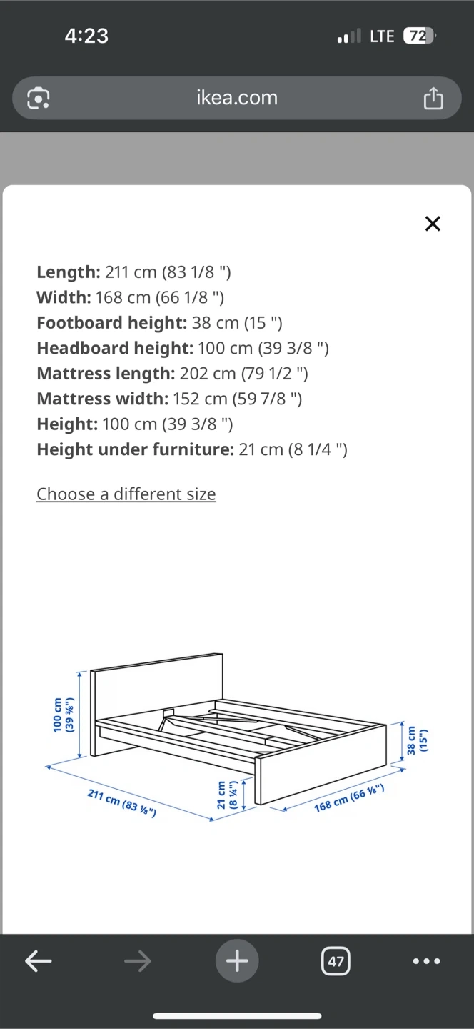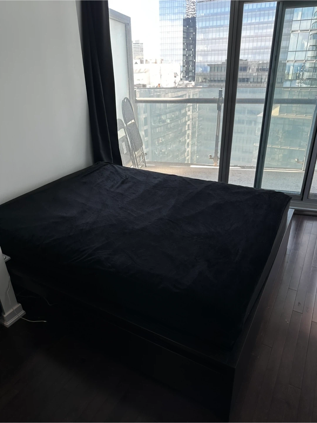 132IKEA MALM Bed in black but with no headboard. The Mattress is from IKEA as well, HAUGESUND medium firm queen size. Mattress has dustmite cover. You can take the black bedsheet if you want. Have to come disassemble & pick them up. (Sorry I don't have the tool, but I can help you disassembling it) Mattress are preferred to be picked up on Oct 3 I have another listing of drawers for this, buy all together and get discount