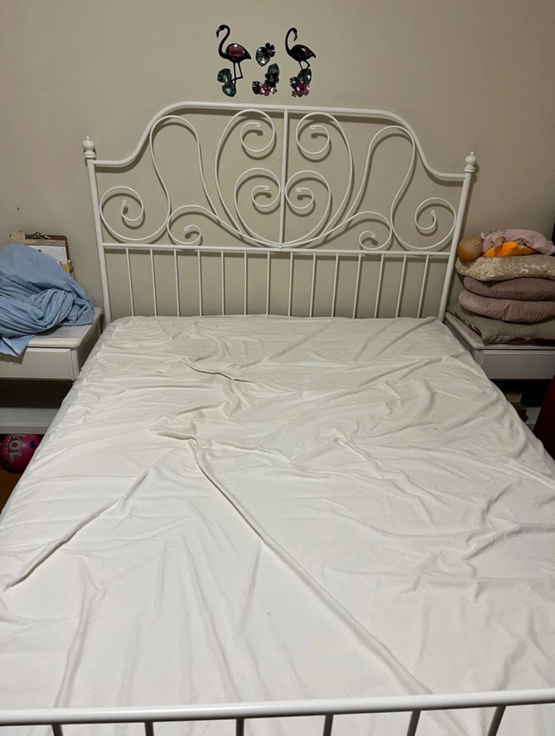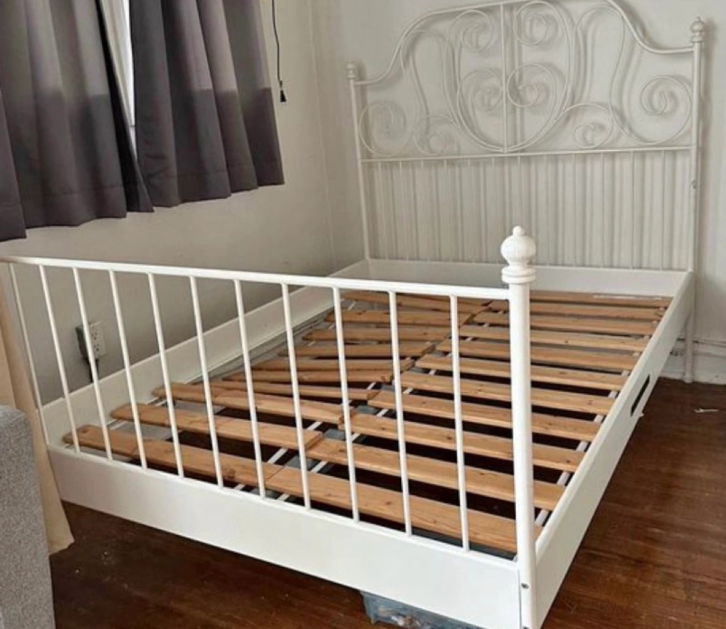 65Ikea queen bed frame and wood slatted bed base. The bed is in good condition. Sizing down my bedroom that's why I'm selling. Ready for pickup at 273 Pharmacy avenue M1L3E9 Please do not hesitate to ask any questions.