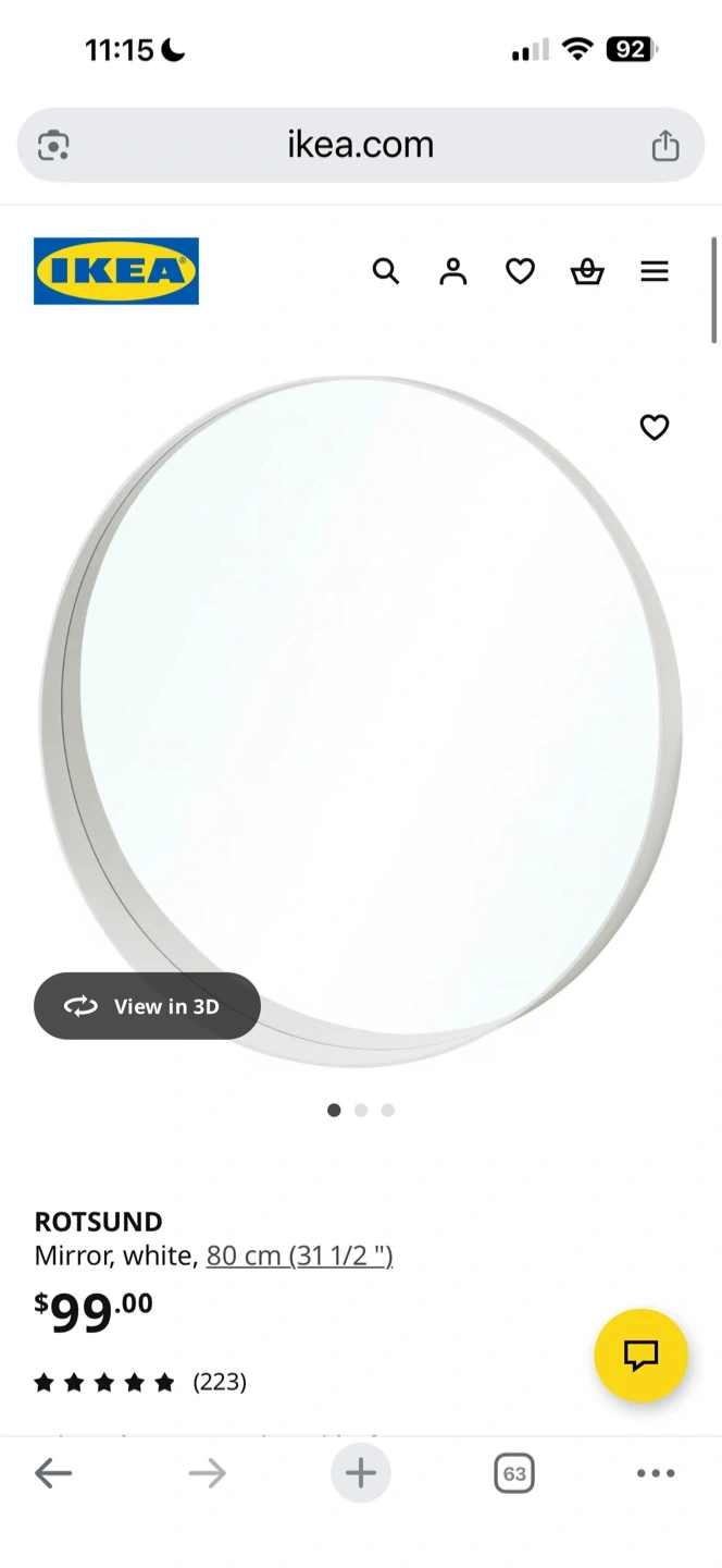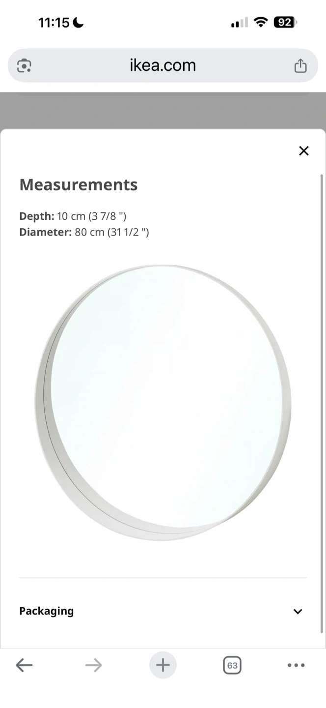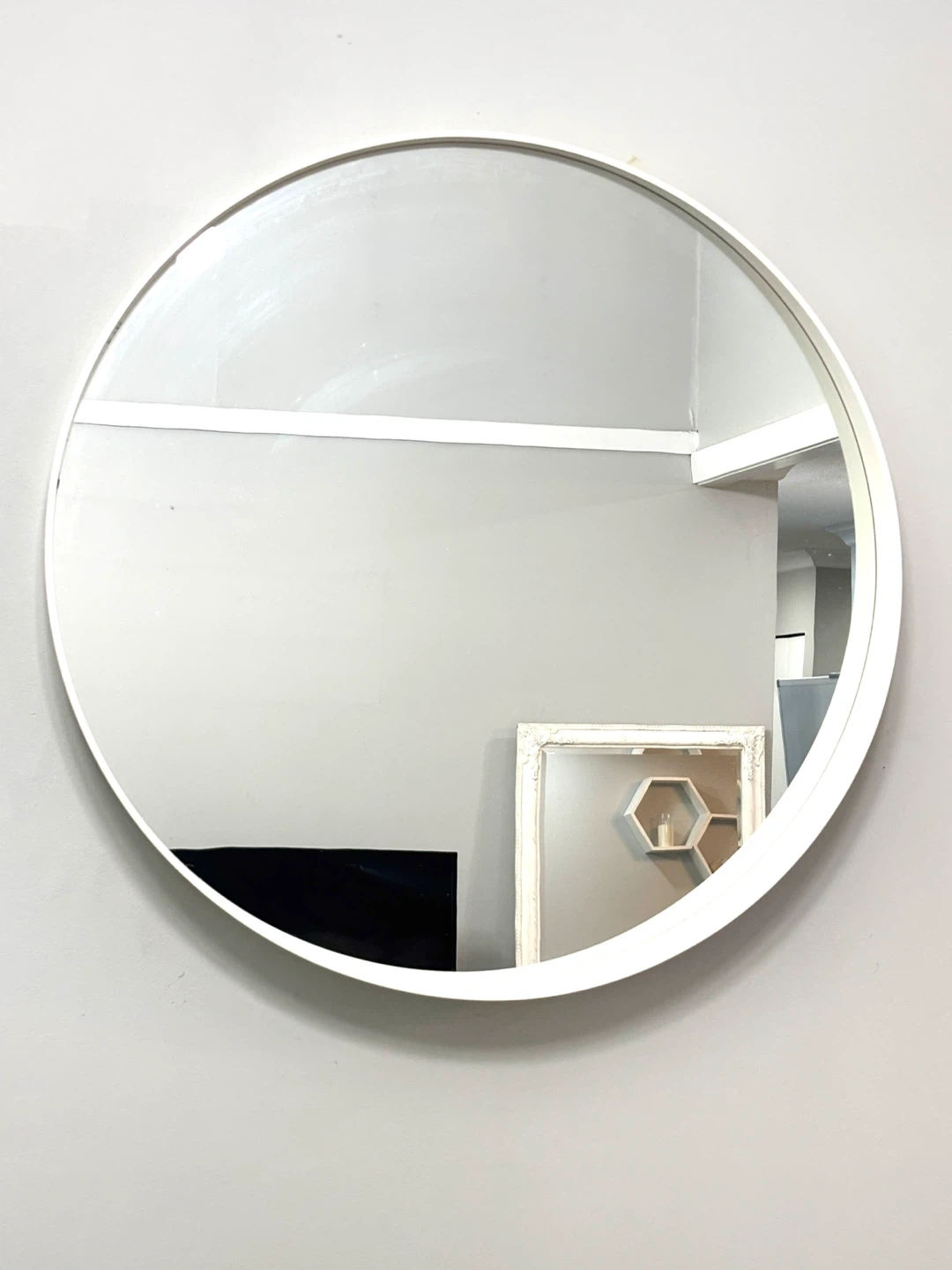 23Selling an IKEA Rotsund mirror in white. It's a great size at 80 cm (31 1/2 "). Measurements: - Depth: 10 cm (3 7/8 ") - Diameter: 80 cm (31 1/2 ") Originally bought for $99