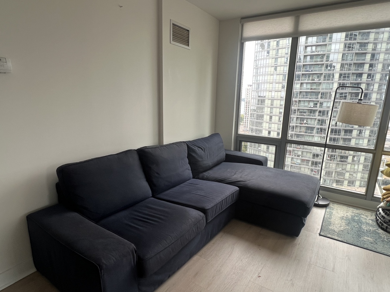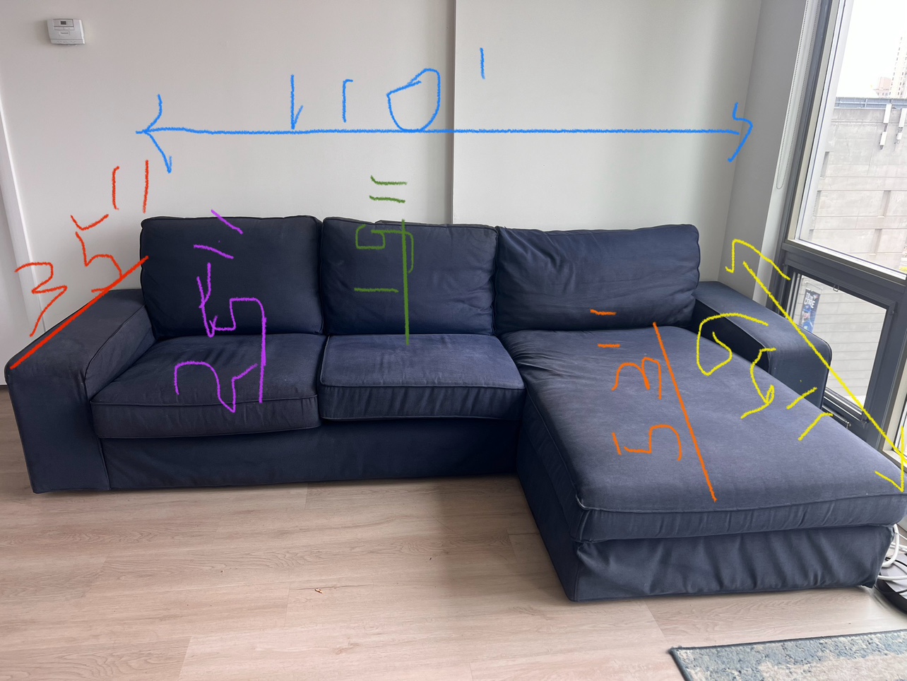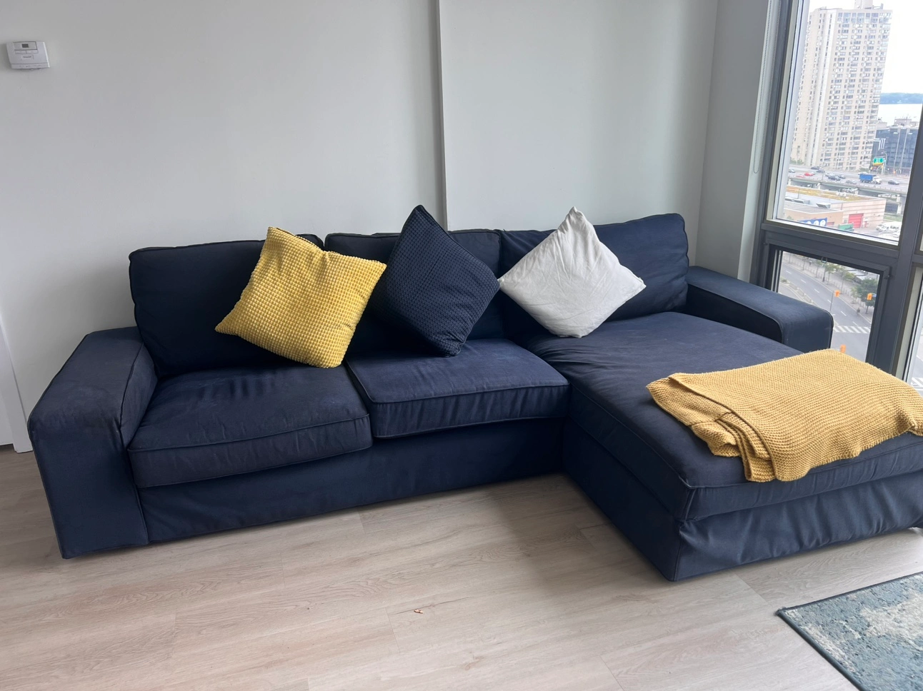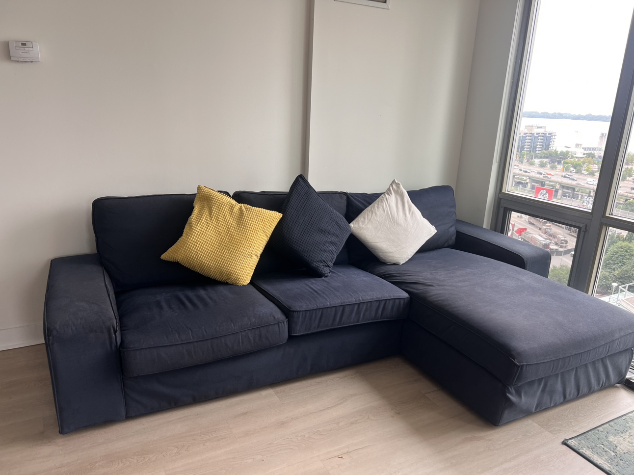 15A navy blue IKEA Söderhamn sectional sofa. The chaise is on the right side. The cover is removable. Includes three throw pillows. The cushions and chaise are in good condition but the cover has some wear and tear, as seen in the photos.