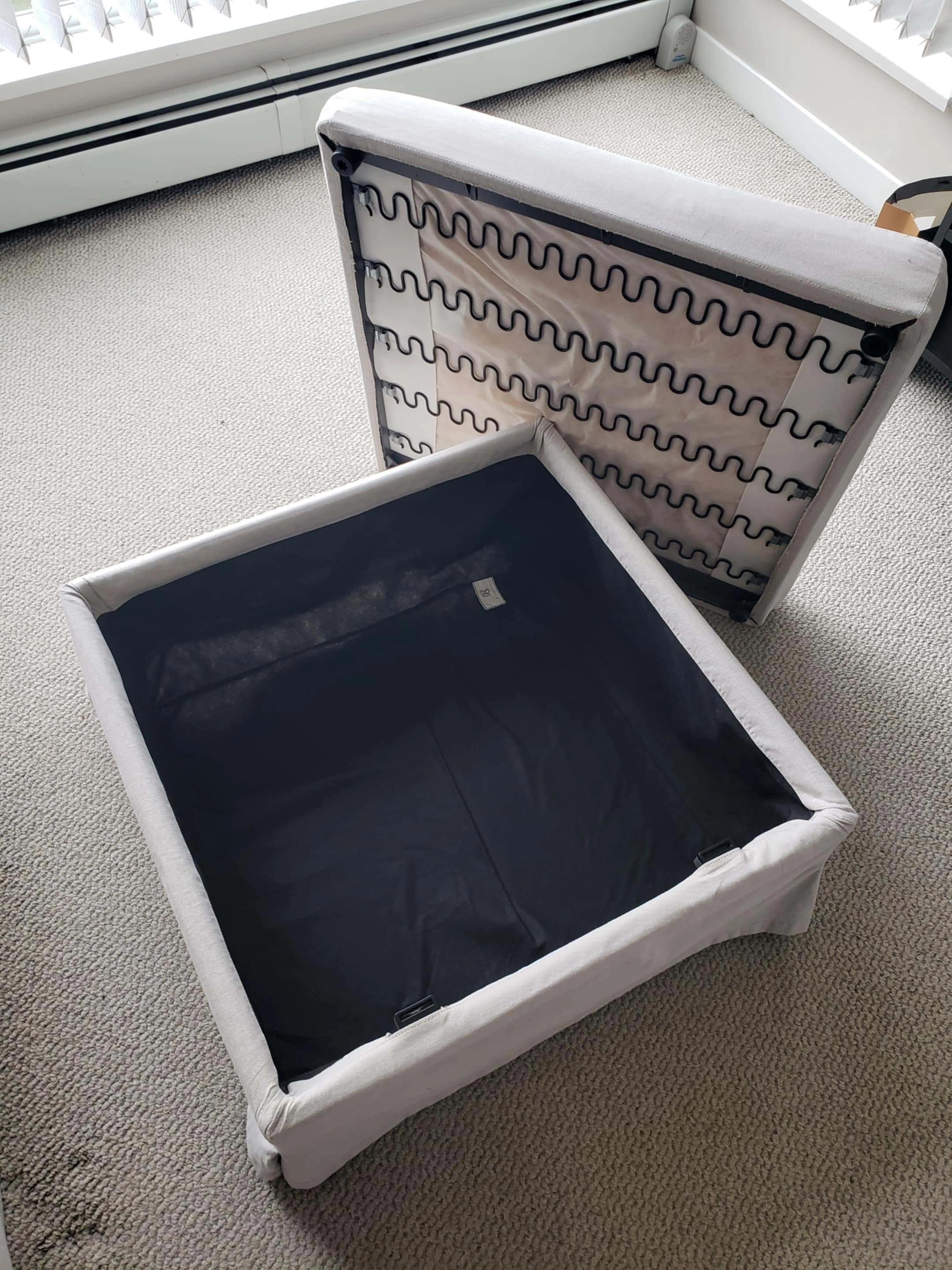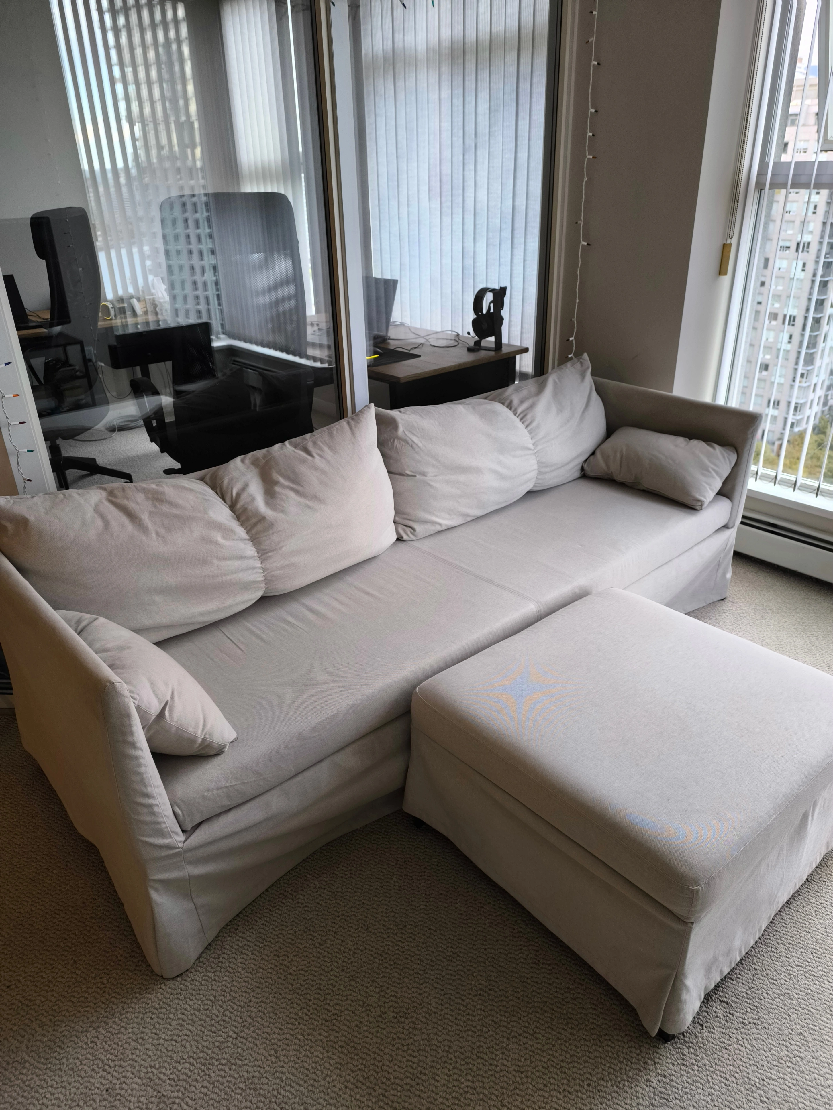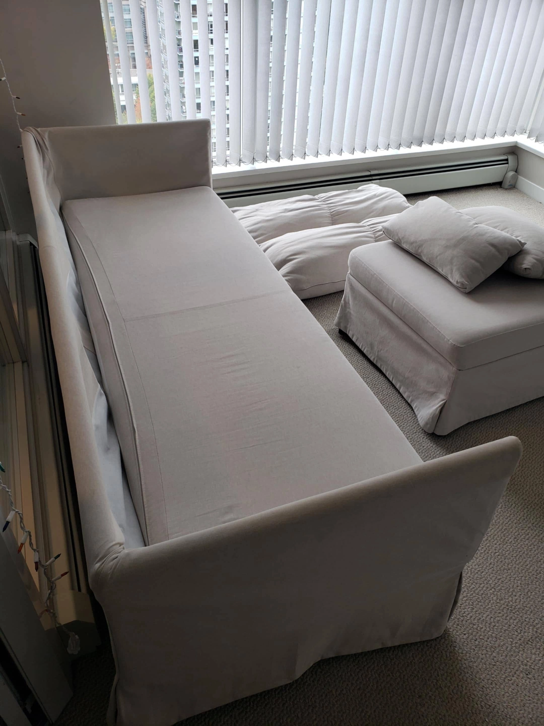 203IKEA Sandbacken sofa with ottoman in like new condition. Comfortably sleeps 1 person. The ottoman has a big storage space. Covers are washable. Sofa measurements: depth: 32.5 inches height: 16 inches / 27.5 inches (height until mattress / full height) width: 84 inches Can be disassembled.