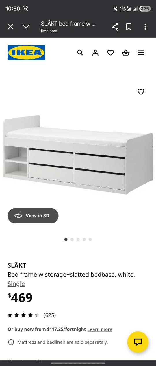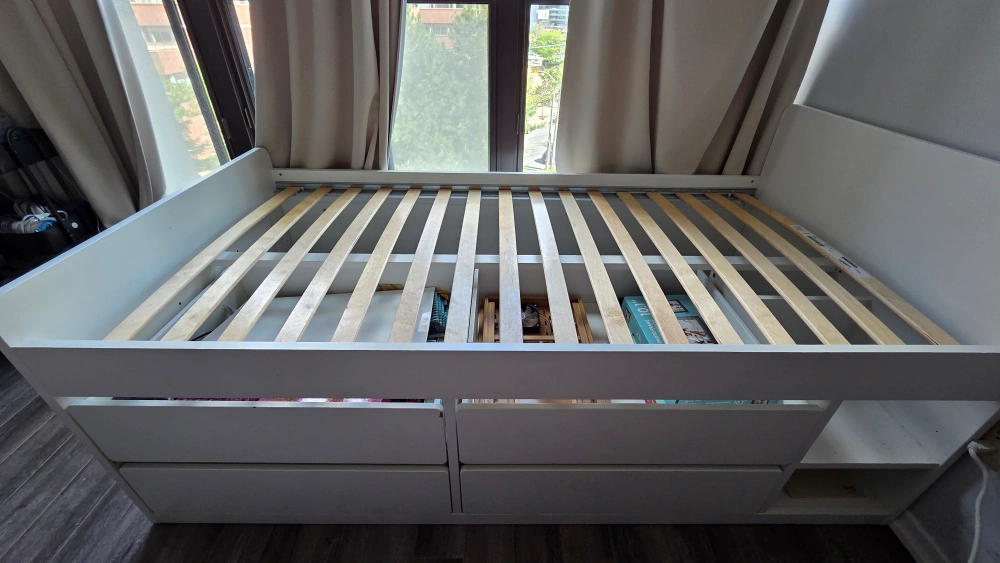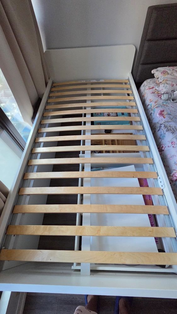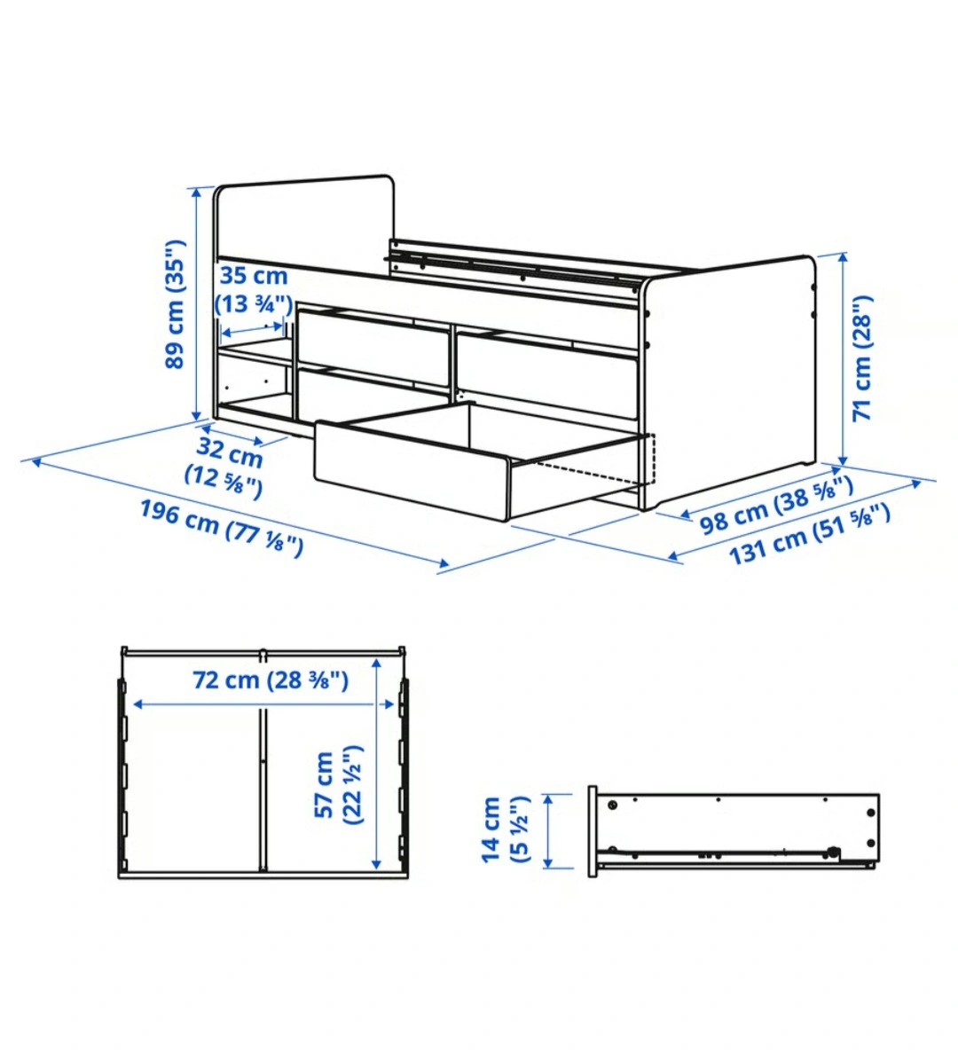 34Selling an IKEA SLÄKT bed frame with storage and slatted bed base in white! It's a single size and in great shape. The dimensions are approximately 196 cm (77 1/8") in length and 98 cm (38 5/8") in width. Perfect for adding some storage to a smaller space! selling for 250.