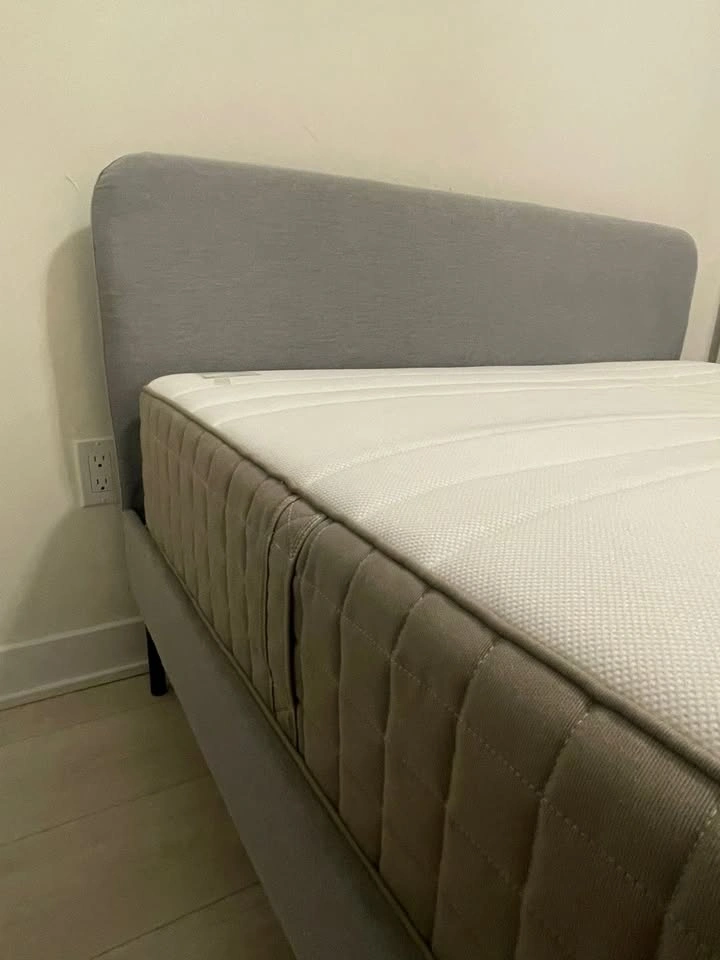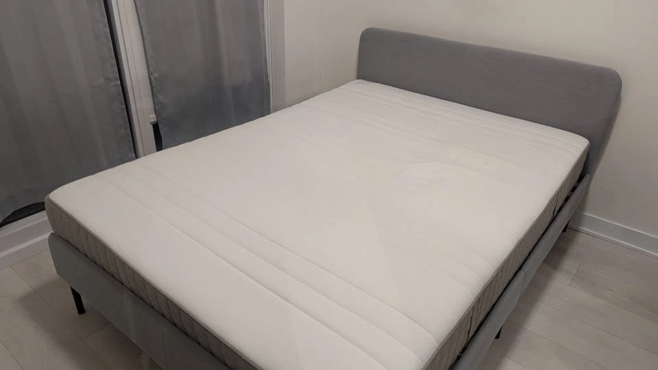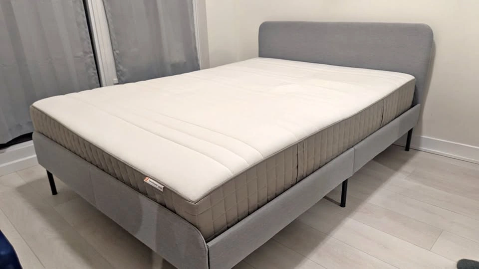 53π Pickup near Yonge & Eglinton Modern SLATTUM upholstered bed frame (KNISA light grey) with HAUGESUND spring mattress (Full/Double, medium-firm). Clean, comfy, and condo-friendly. Dimensions: Full/Double 54" x 75" (mattress height ~9β10") Features Soft rounded fabric headboard; low-profile sides Supportive spring mattress (medium-firm) Slatted base + hardware included Easy to disassemble/reassemble Condition Frame: very good Mattress: clean with a few faint marks visible in strong light (see photos) Pricing Mattress only: $50 (available morning of the 1st) Bed frame only: $100 (available from the 30th) Bundle both: $130 πͺ§ Moving sale β check my other listings. Flexible pickup times.
