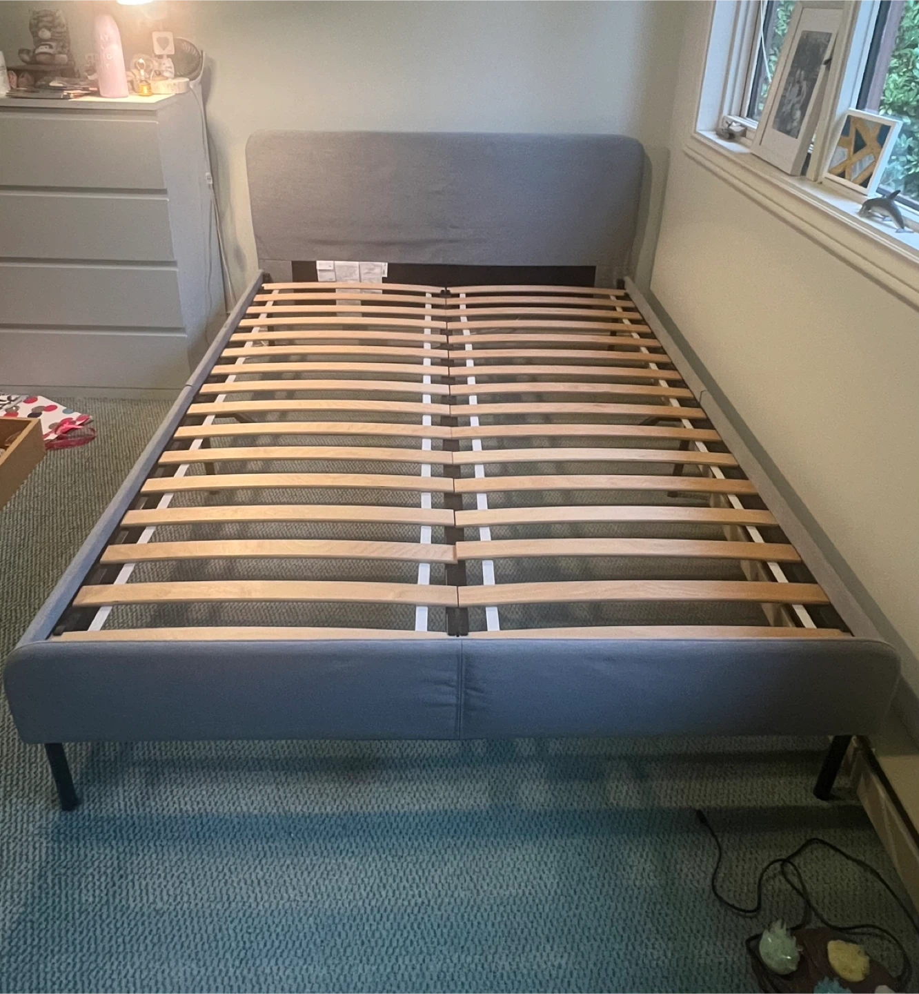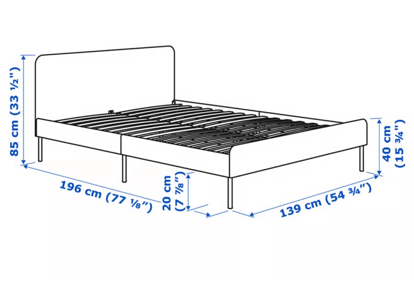 35Selling a full size IKEA SLATTUM bed frame. It's in great condition and ready for a new home! 196 cm (77 1/8") in length 139 cm (54 3/4") in width Headboard height is 85 cm (33 1/2") Height to the bottom of the frame is 40 cm (15 3/4")