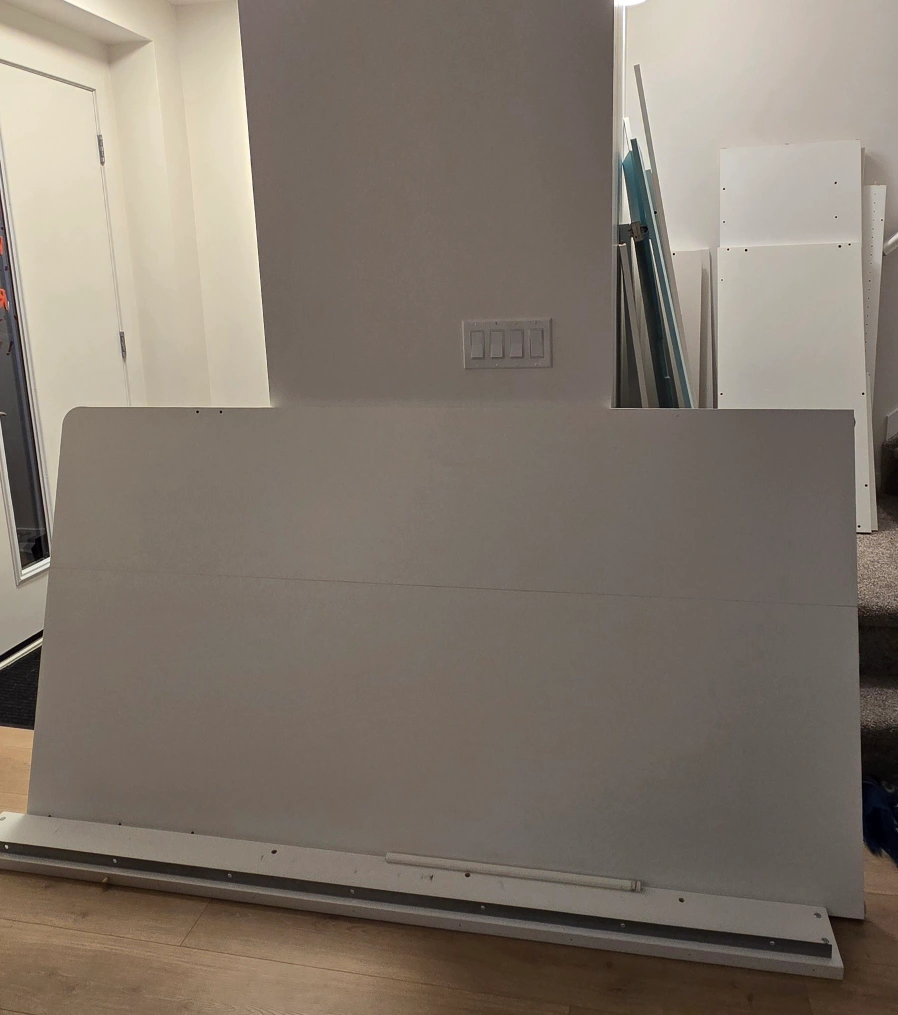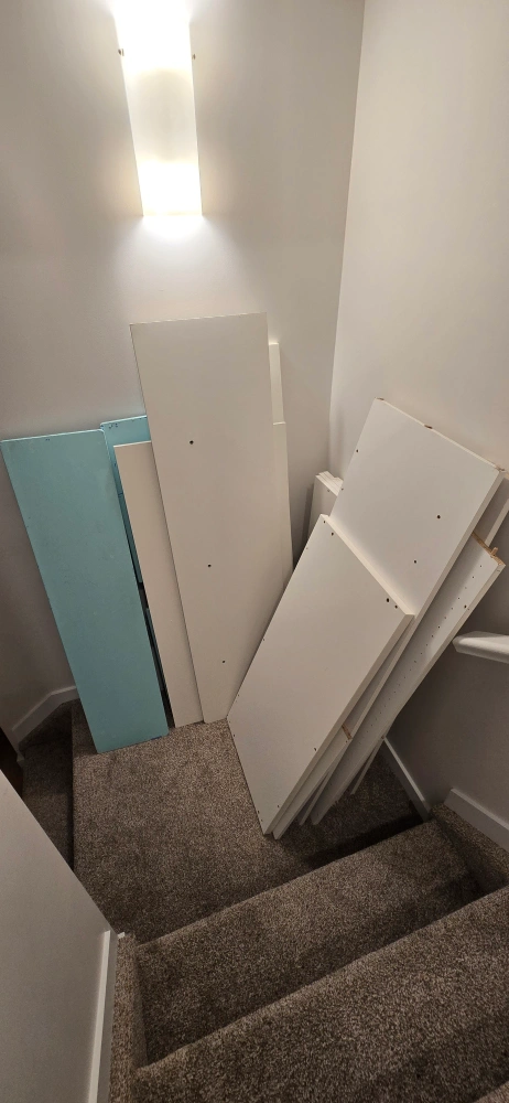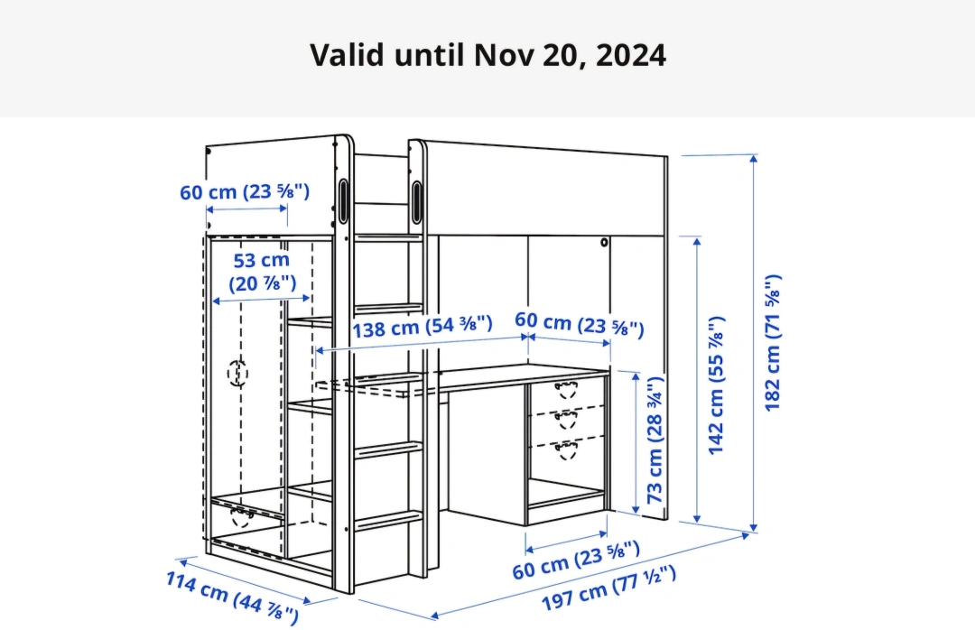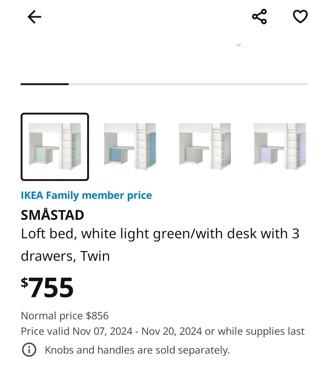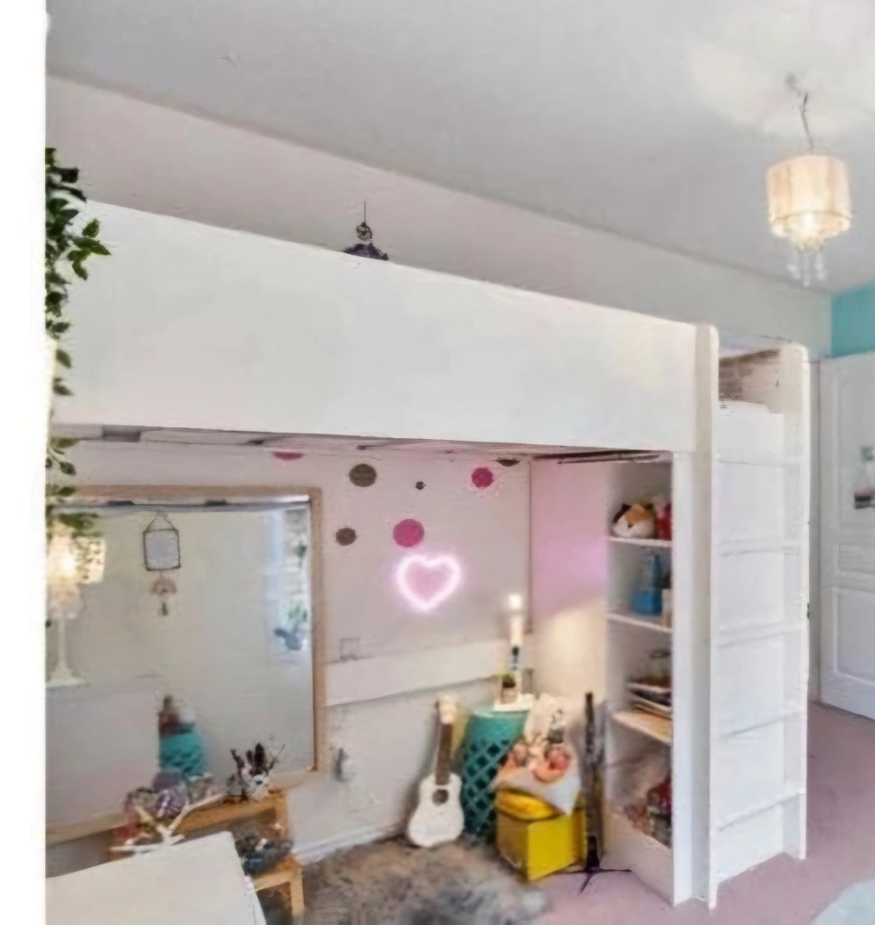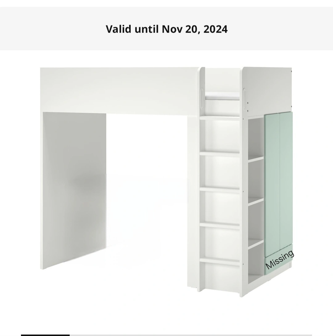 Twin loft bed with painted light green cabinet door. Includes all pieces except desk. It is in good condition. We are currently assembling and realized the beds didn't fit well in the room and have to get a different style of loft bed. There is no desk. The first photo is the actual bed. Disassembled and ready for pick up, it must be gone soon.