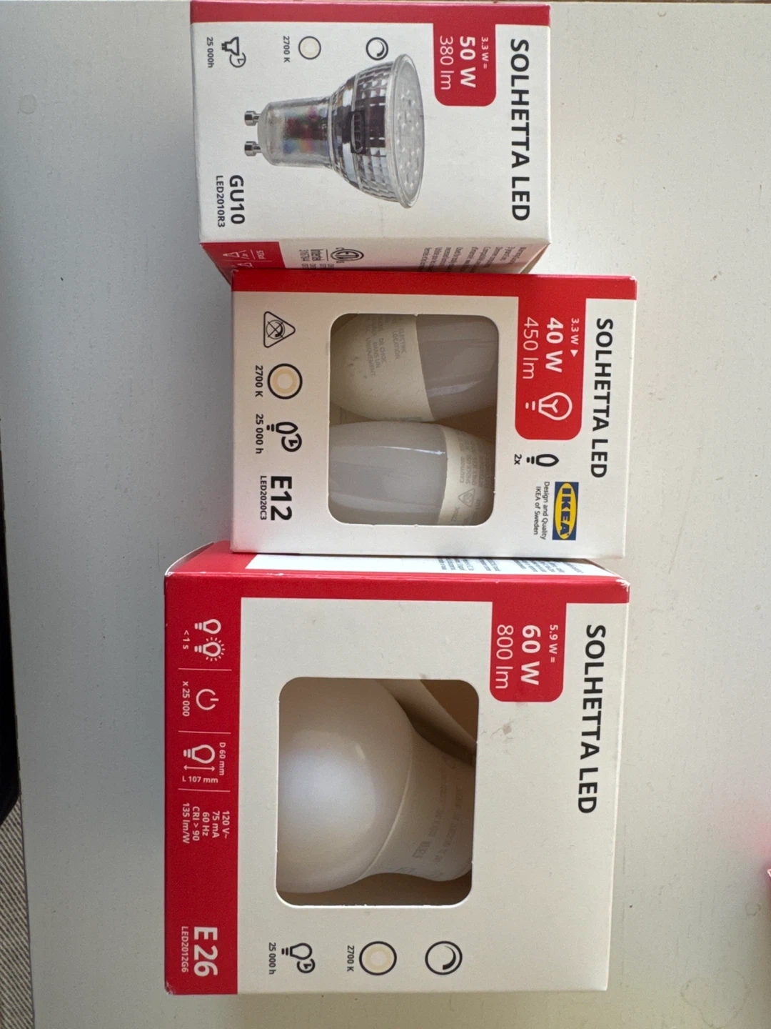 10Selling some IKEA Solhetta LED light bulbs. Here's what's available: - GU10, 50W, 380 lm - E12, 40W, 450 lm (2 bulbs) - E26, 60W, 800 lm