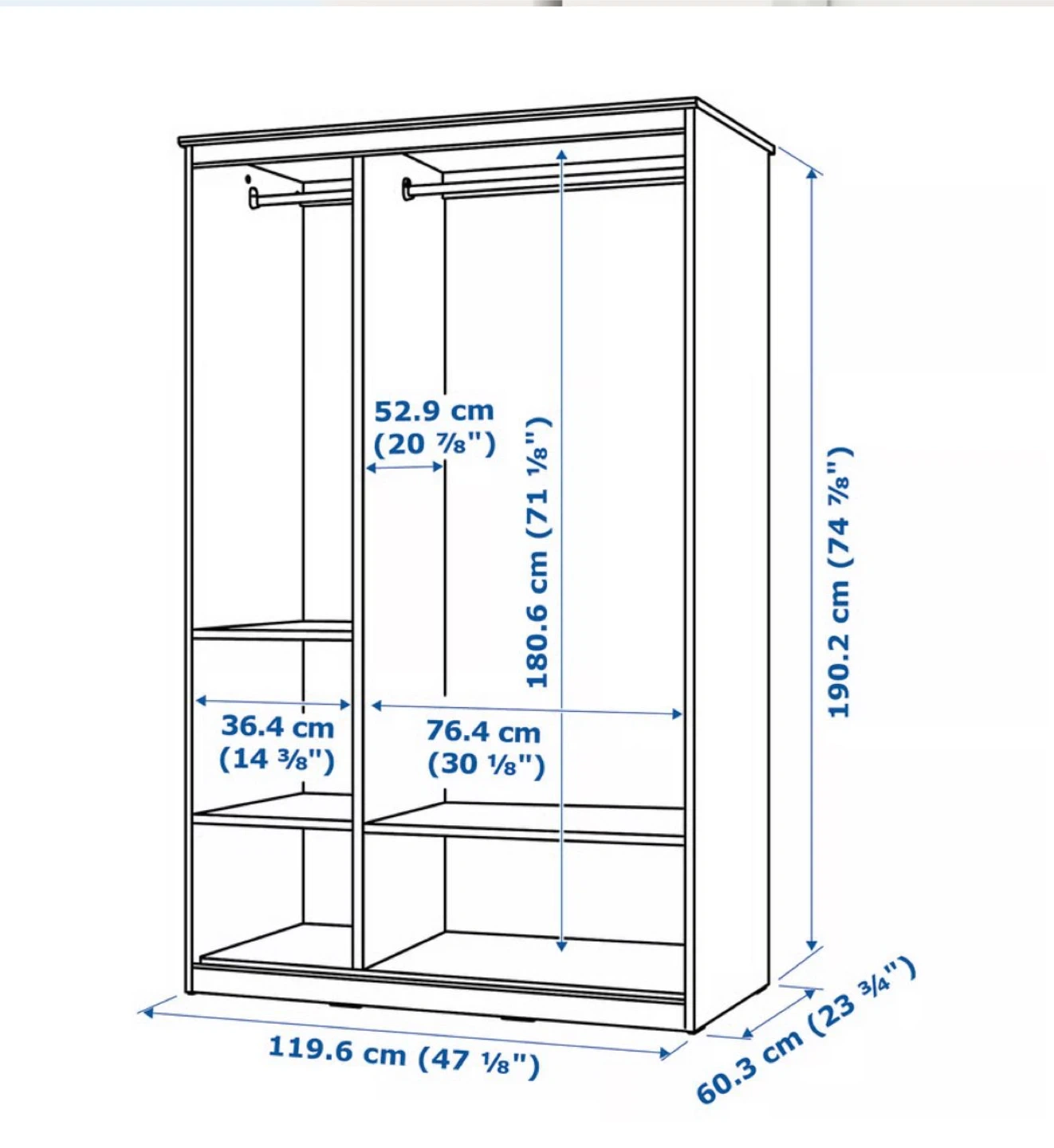 12Selling a white IKEA Songesand wardrobe in great condition! It measures approximately 120x60x191 cm (47 1/8x23 5/8x75 1/4 "). A great addition to any bedroom or closet space! Dimensions: 120x60x191 cm ⚠️ Important: The wardrobe will need to be taken apart to move out of the building (too large for the elevator/stairs). Pickup only – near Brentwood