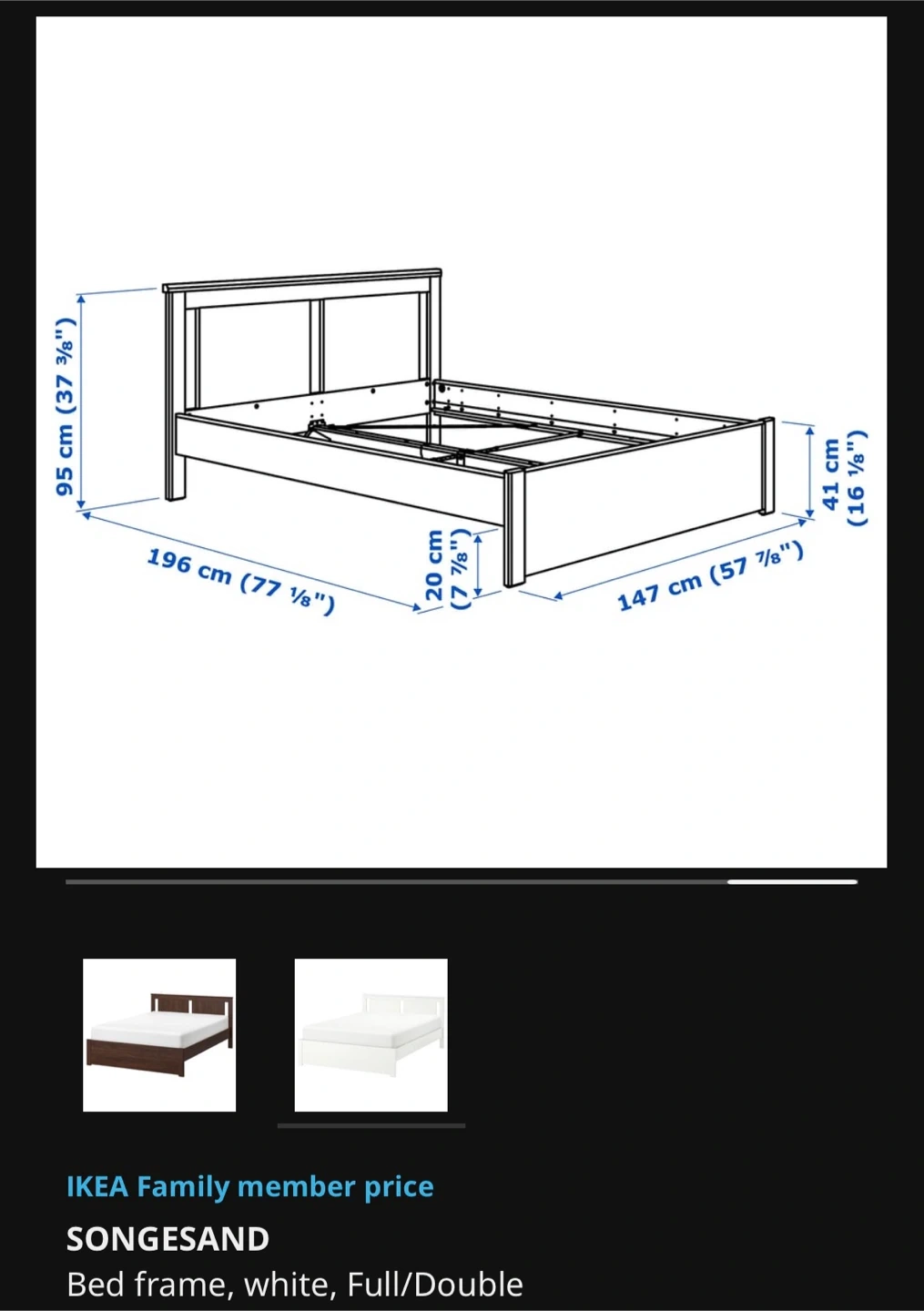 28Selling a white IKEA Songesand bed frame in queen size! It's in great shape and ready for a new home. The dimensions are approximately 196 cm (77 1/8") in length and 147 cm (57 7/8") in width. Perfect for a cozy bedroom setup