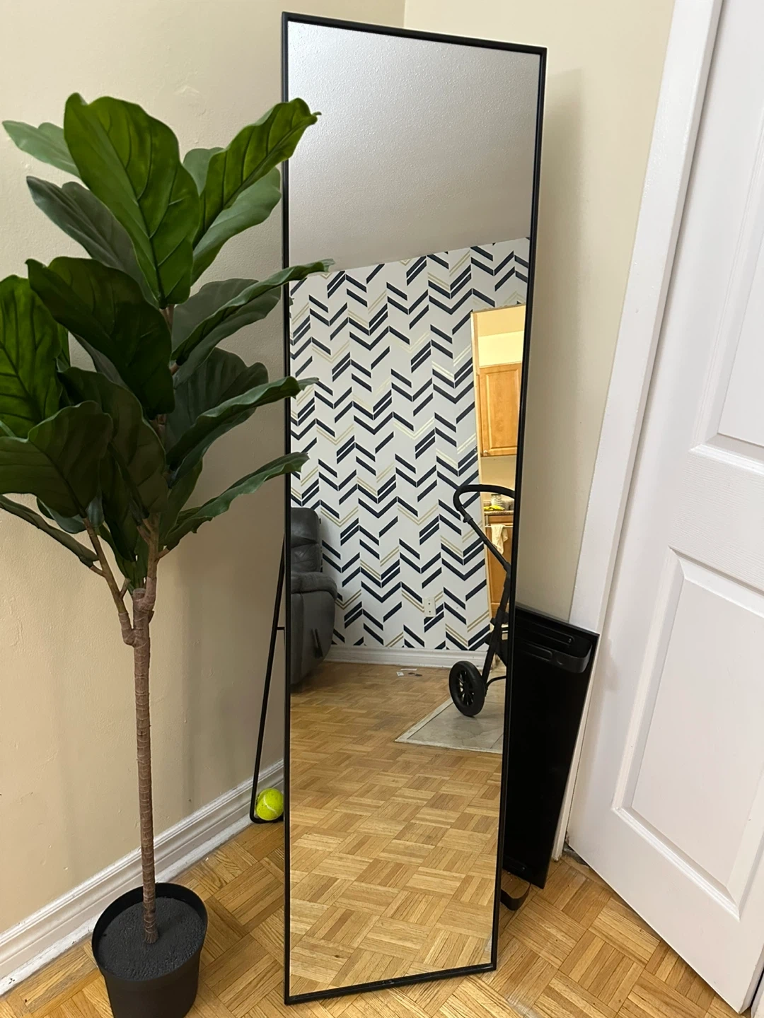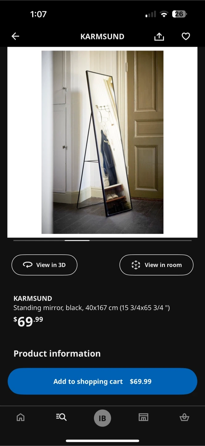 24IKEA KARMSUND Standing Mirror – Black Sleek and modern full-length standing mirror (40x167 cm). Perfect for bedrooms, entryways, or dressing areas. The adjustable stand makes it easy to place anywhere, and the minimalist black frame complements any decor. Excellent condition.