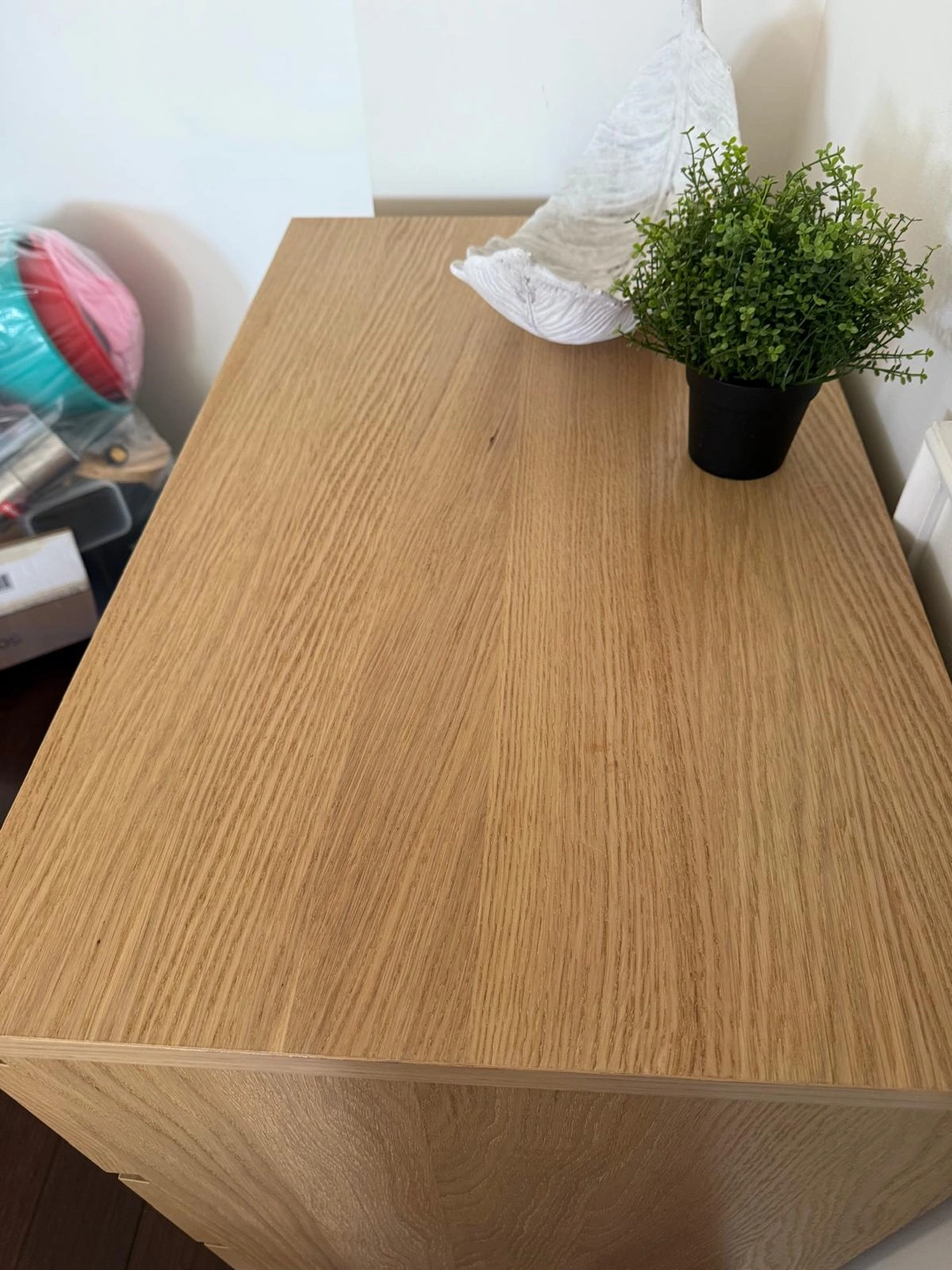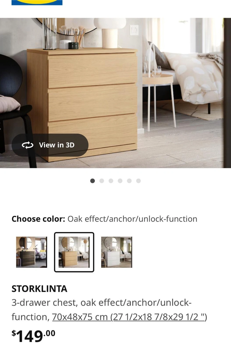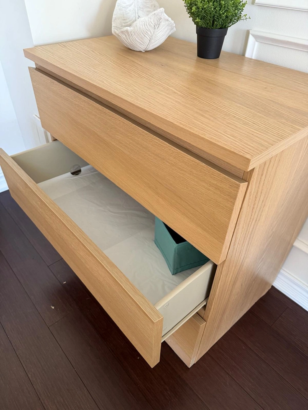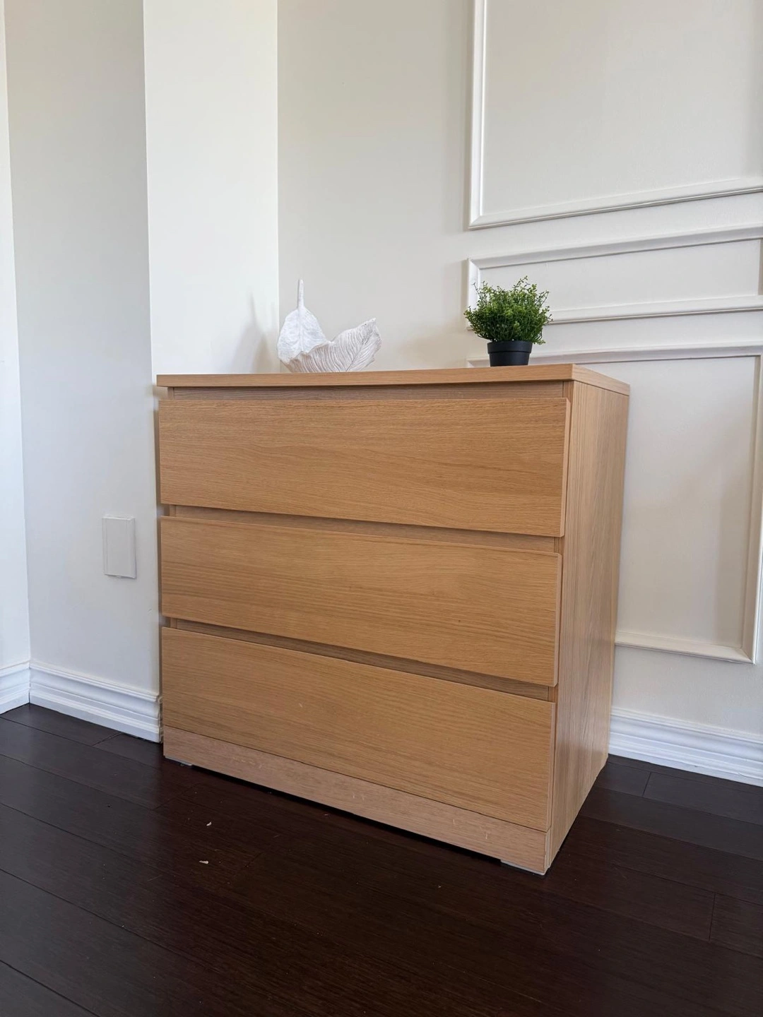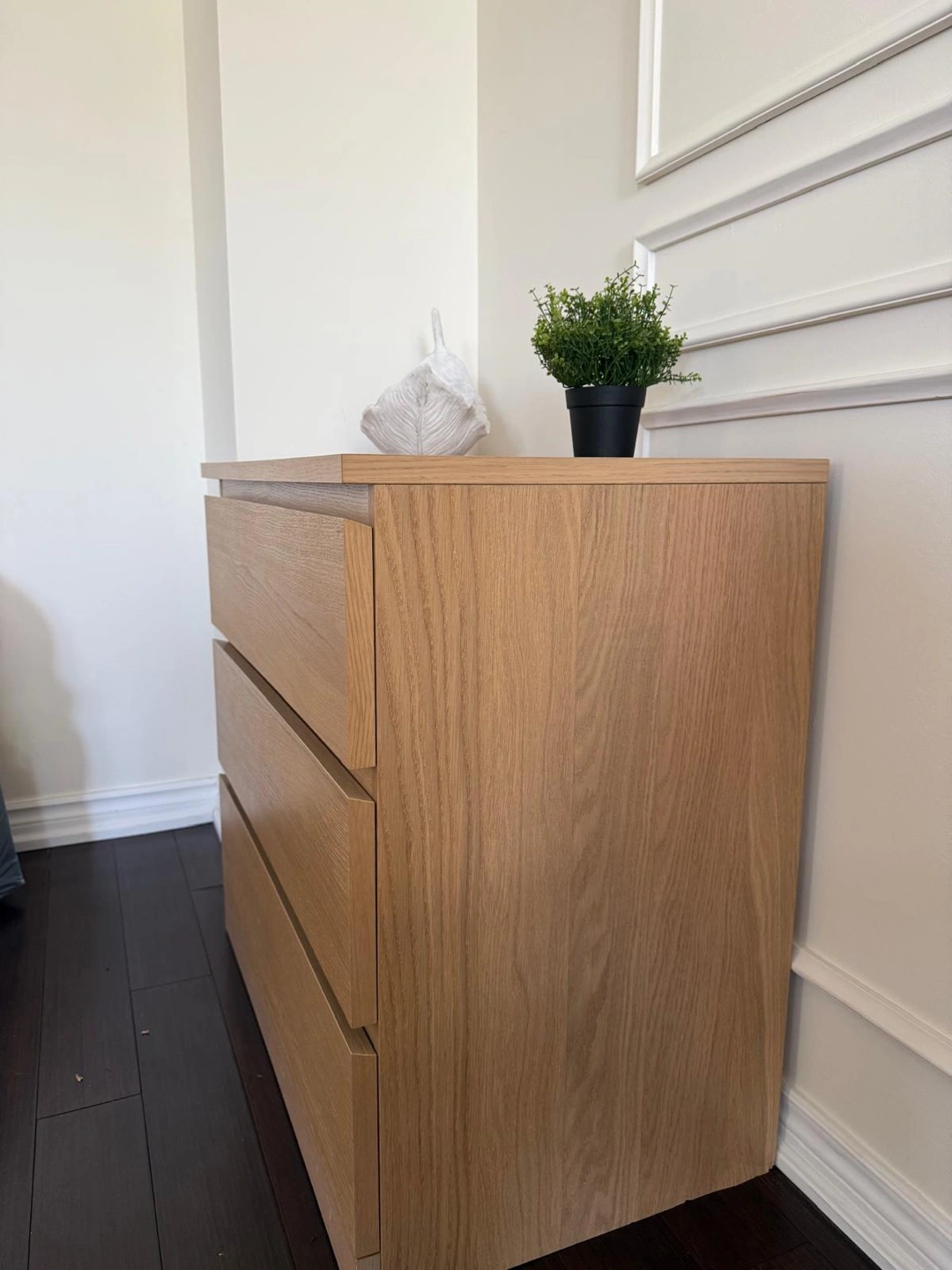 Three-drawer dresser. Oak effect finish. Good condition. Smooth-gliding drawers. Anchor/unlock function. Dimensions: 70x48x75 cm (27 1/2x18 7/8x29 1/2"). Moving sale- $40