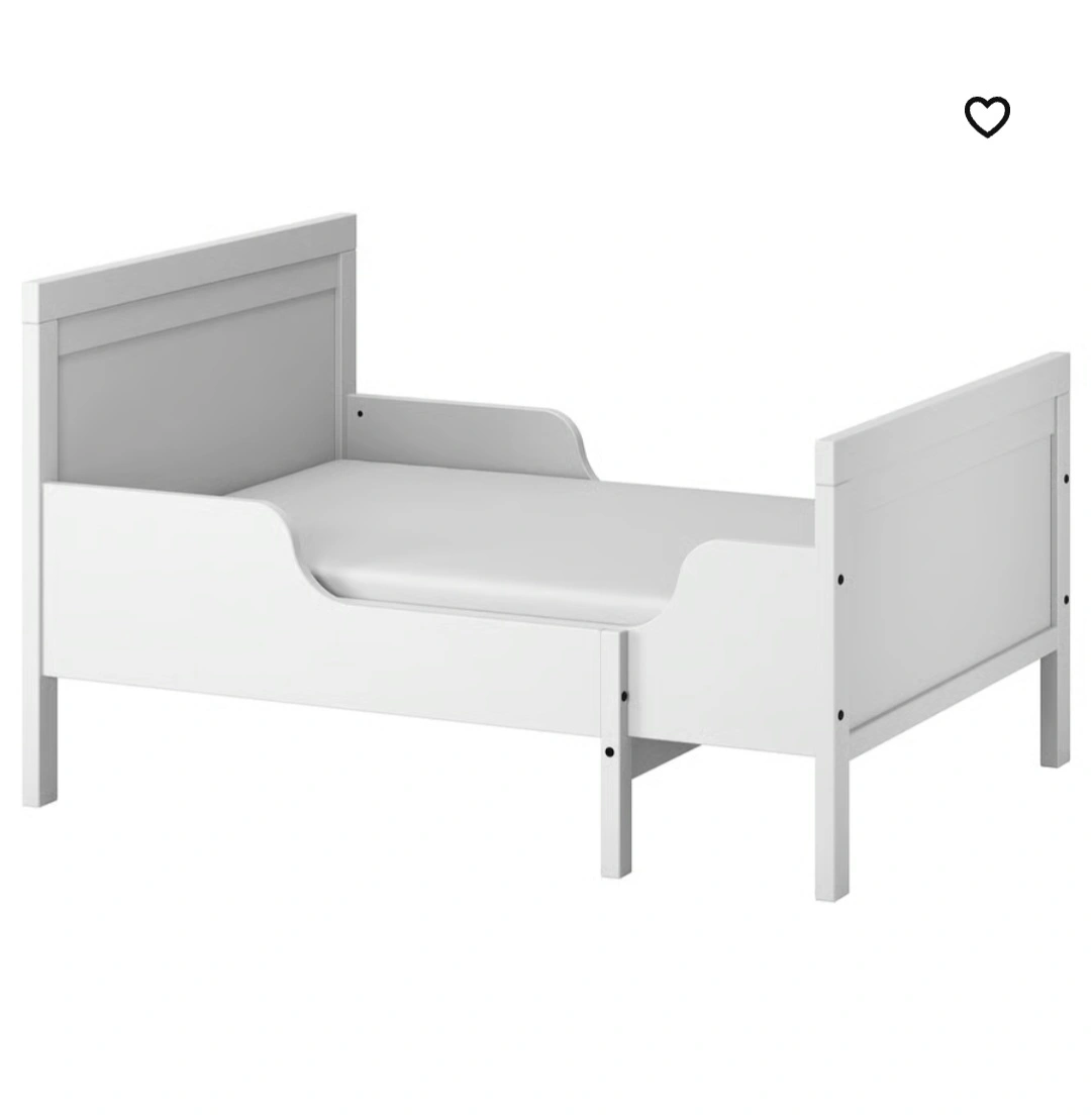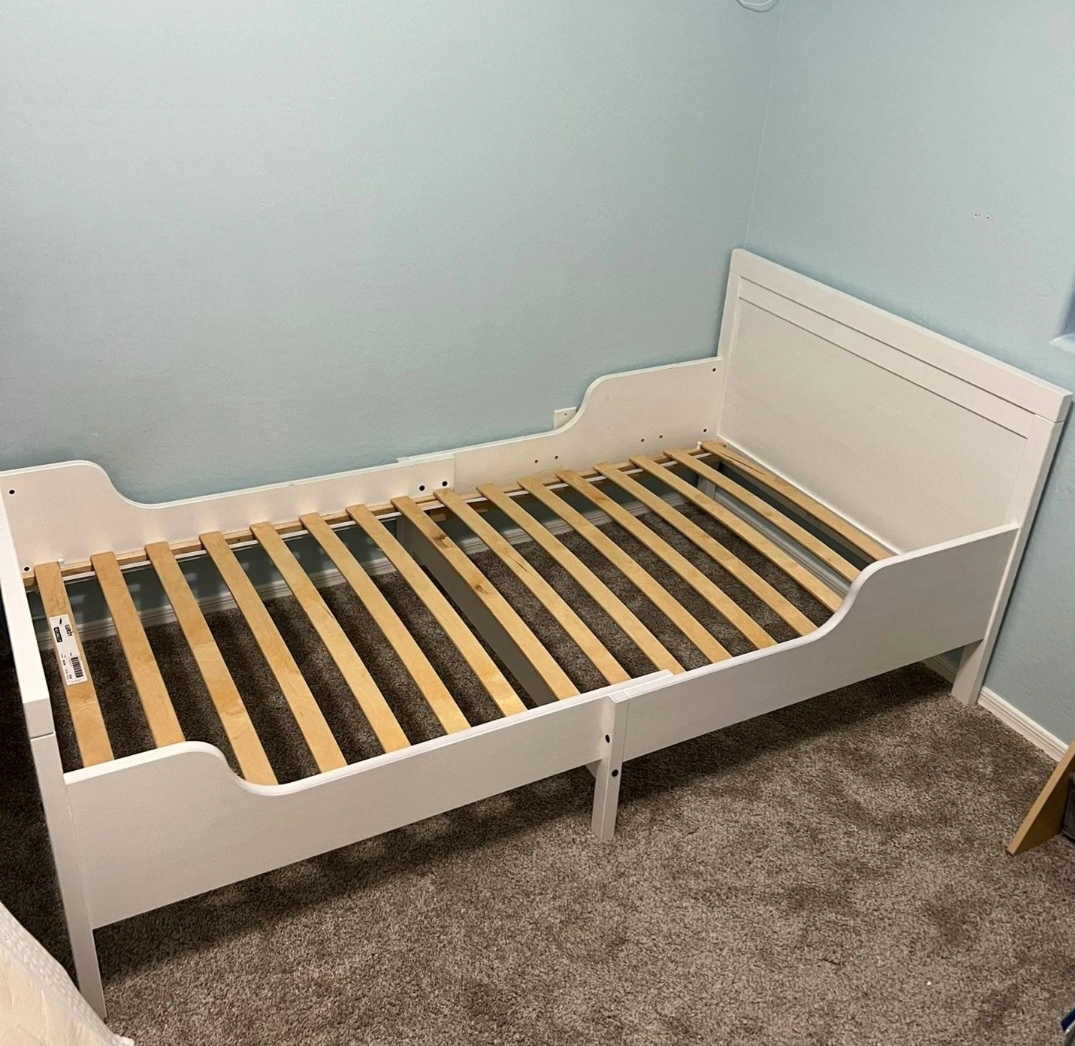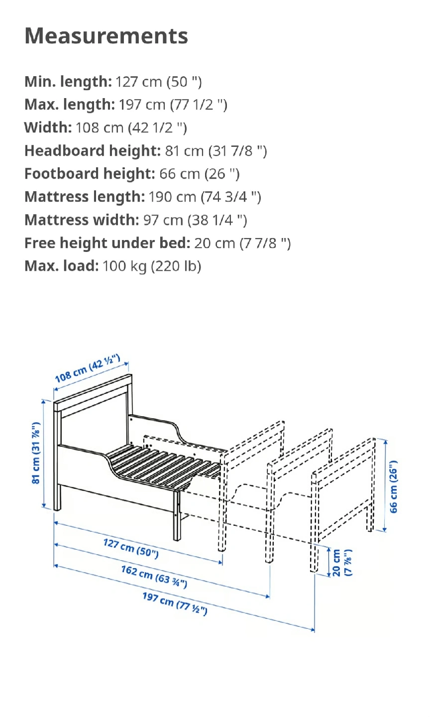 Ikea Sundvik extendable kids bed. Durable and comfortable. The bed is extendable and can be adjusted for three different length. it is very flexible as the little one grow bigger. I have purchased a bed rail and can be included with the purchase of this bed. please note mattress is not included. The price is for the bed only. color is white and has a traditional and timeless design that goes with most furniture.