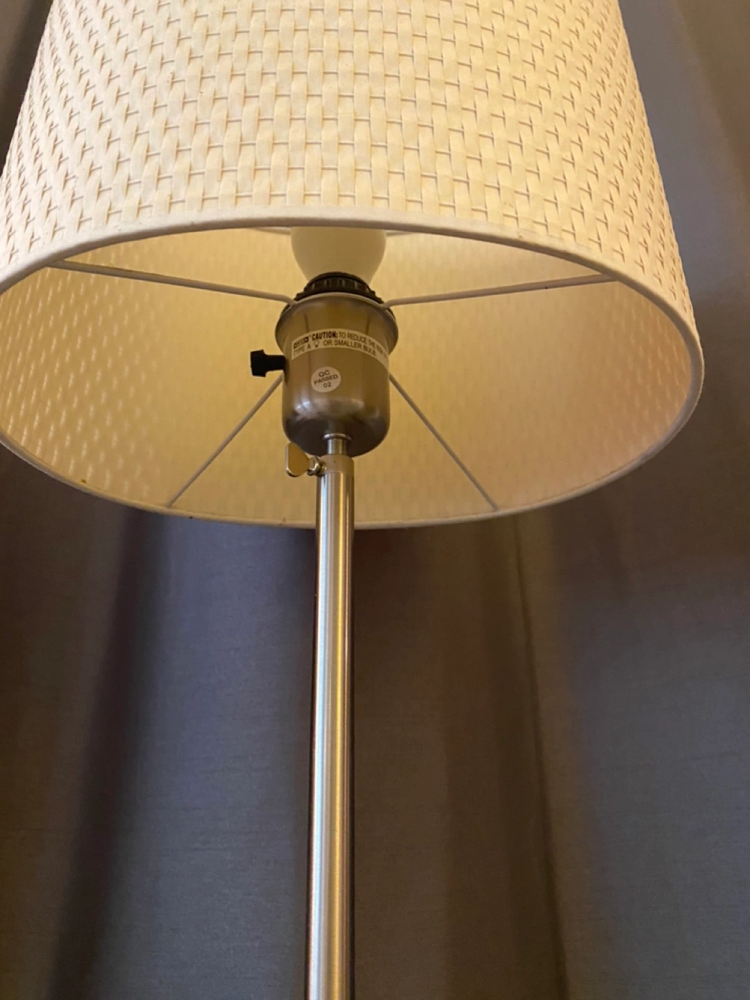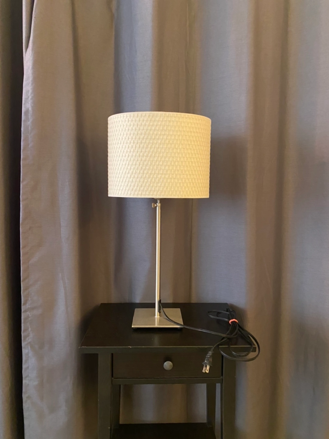 Silver table lamp with white shade. Includes cord and switch. Porch pick up preferred at Kingston Rd. & Dundas St. E. Cash or e-transfer accepted.