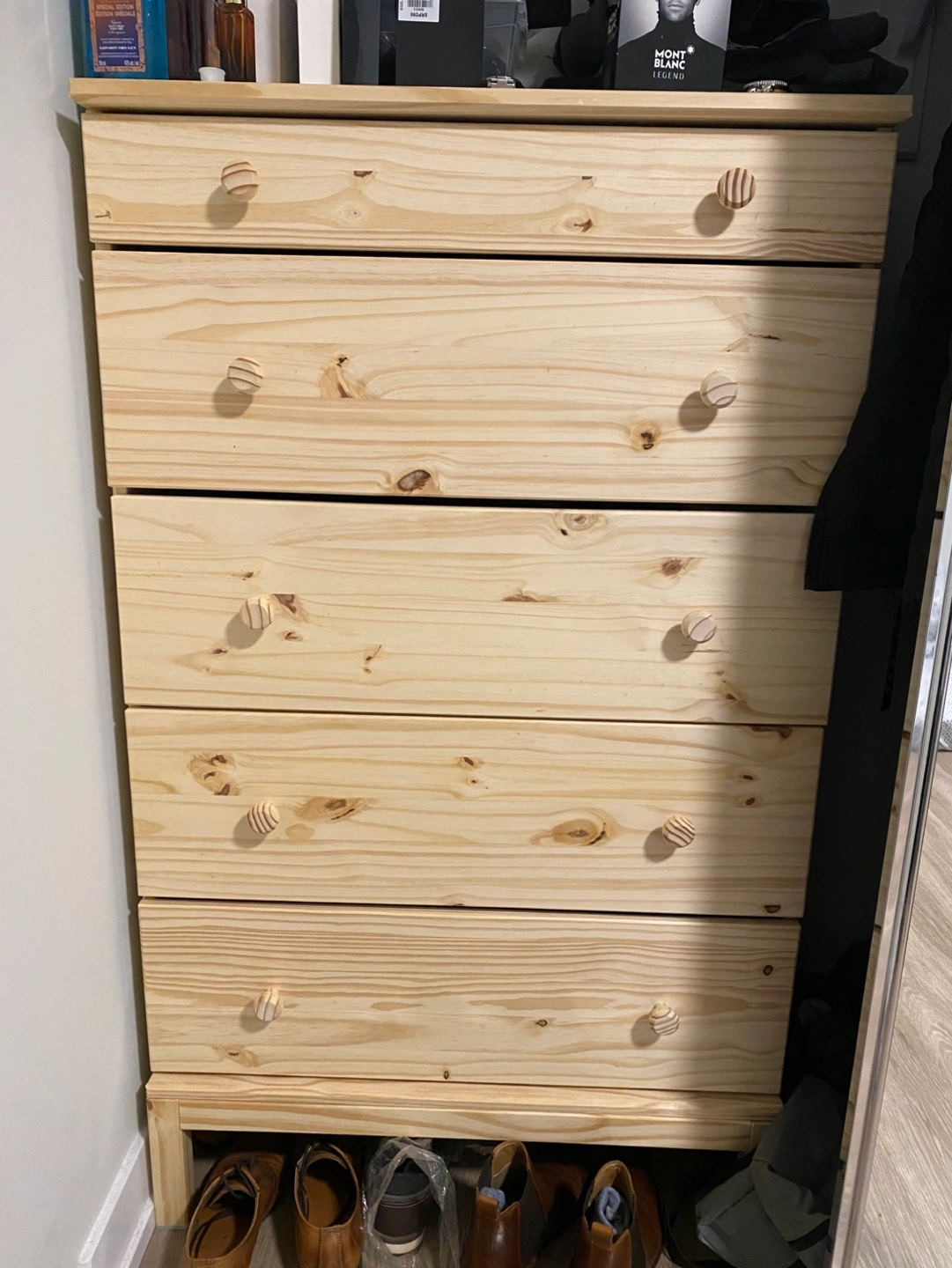 Simple design in untreated solid wood. It’s beautiful as it is or you can stain, paint or wax it the way you like! Article number 705.898.69 in IKEA. Not used for even 3 months and is almost new condition. Fits snugly in my closet not taking any of my bedroom space