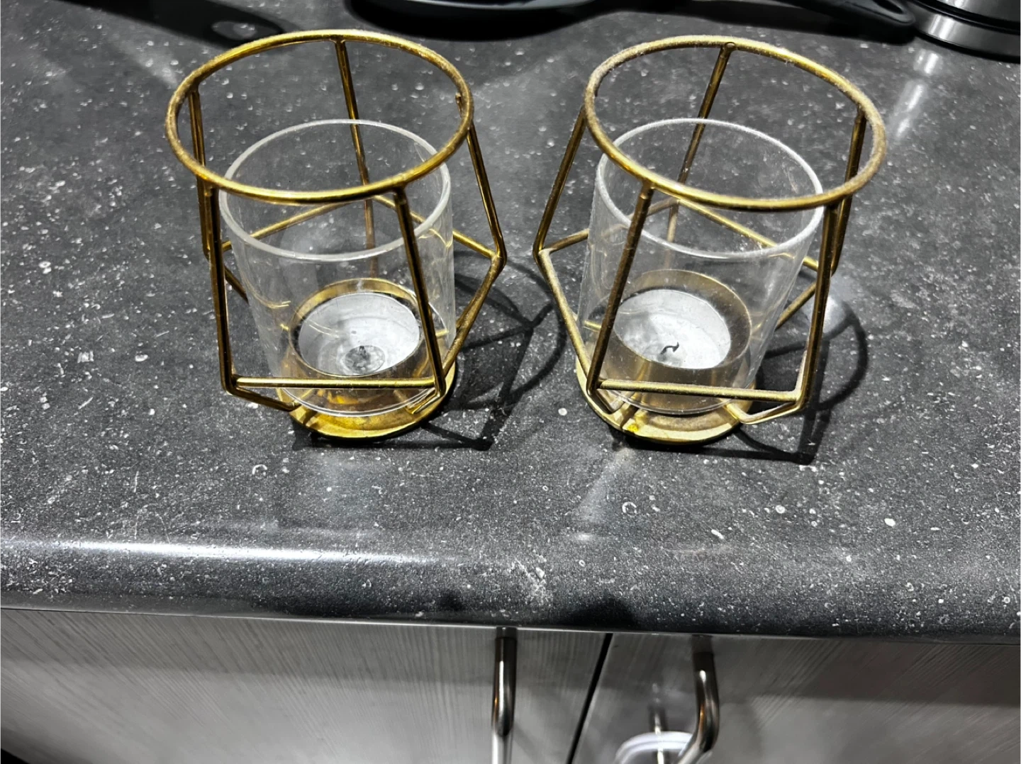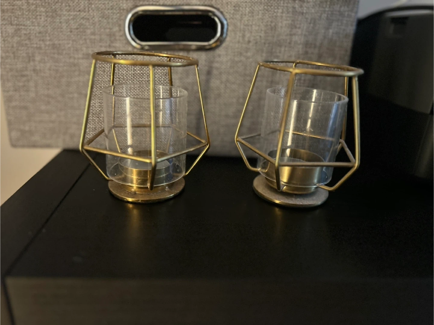 70Selling a set of two gold-coloured metal candle holders with clear glass inserts, along with a bunch of Ikea tealight candles. There are 70 candles