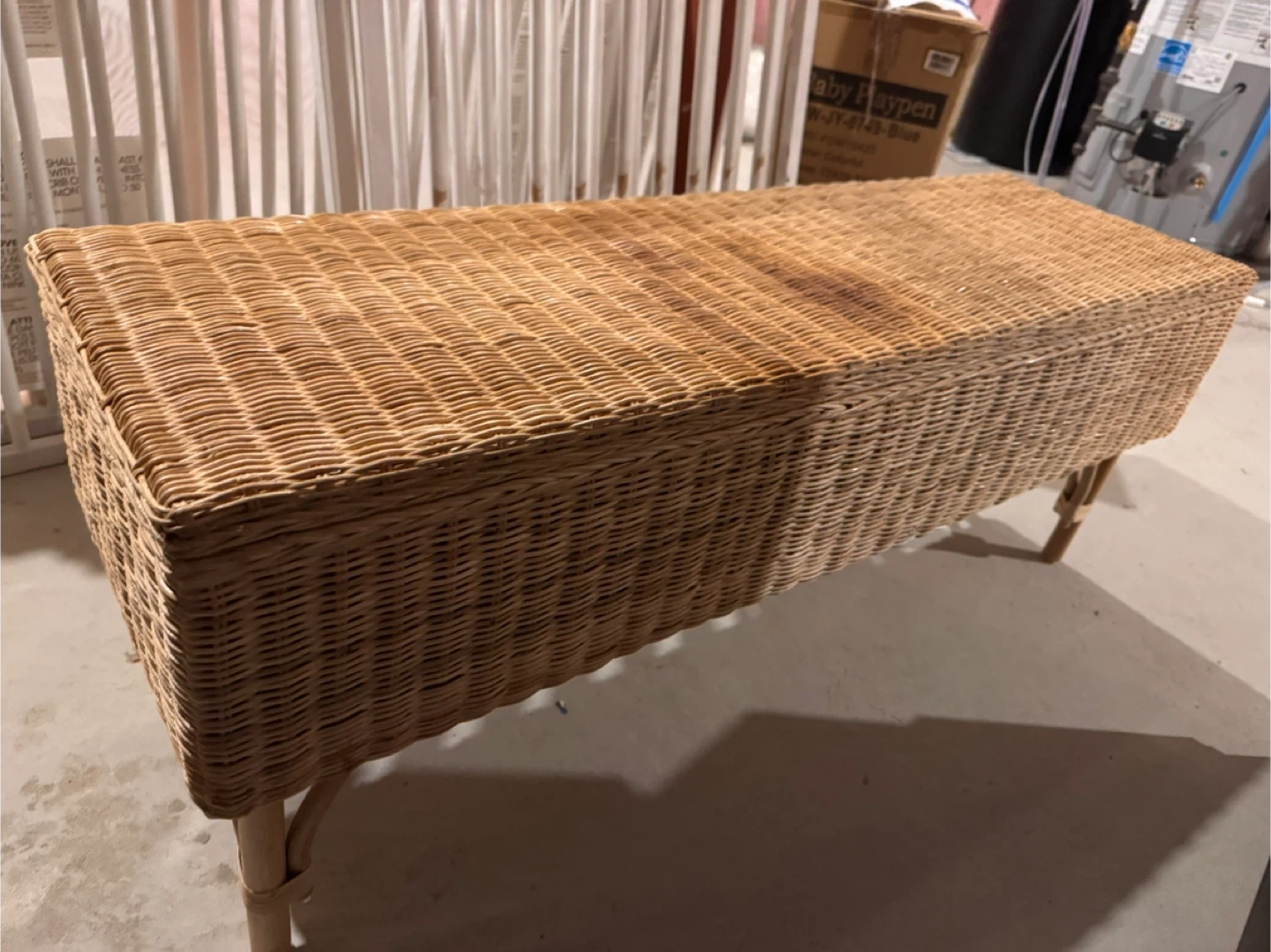 Wicker storage bench in good condition! It's perfect for storing toys, blankets, or anything else you want to keep out of sight. The bench is made of sturdy wicker and has a hinged lid for easy access.