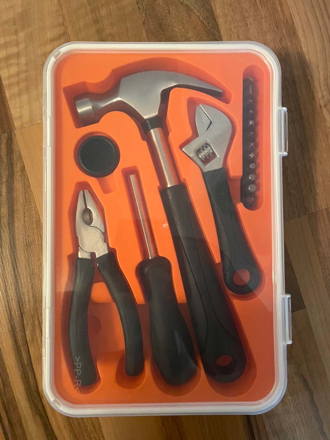 Set of tools including a hammer, screwdriver, pliers, wrench, and bits. All tools are in a plastic case.