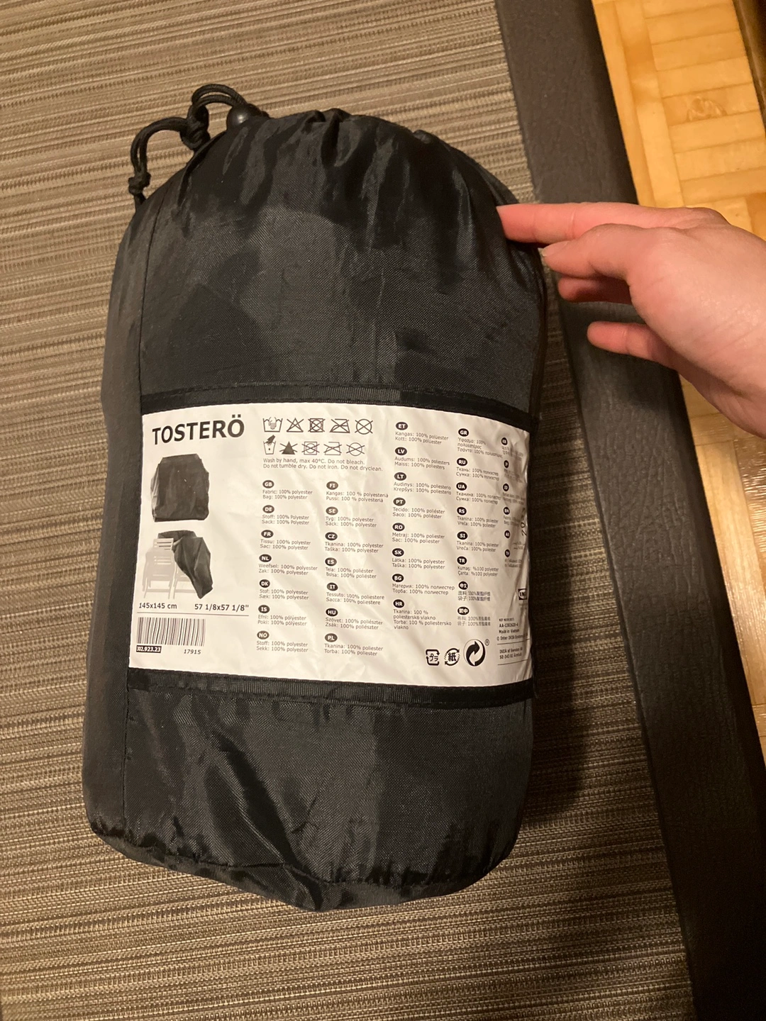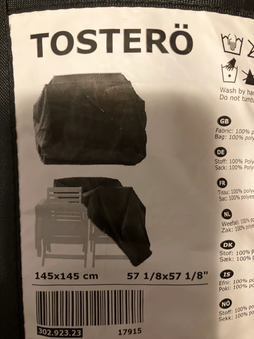 A black outdoor furniture cover. Made to protect outdoor furniture. Perfect for those rainy days. Includes some informational text in different languages. Made in polyester.