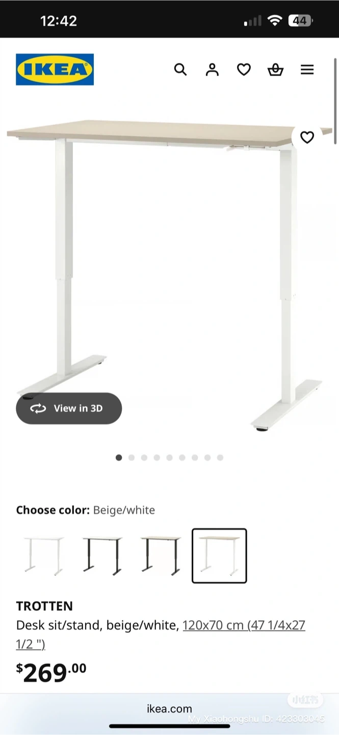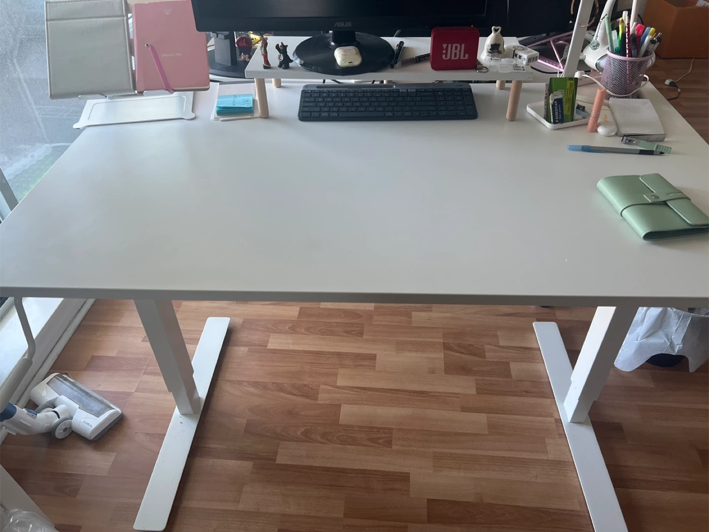 Selling an IKEA Trotten desk in beige/white. It's a sit/stand model, perfect for adjusting to your comfort level while working from home! The dimensions are 120x70 cm (47 1/4x27 1/2 "). Originally bought for $269.