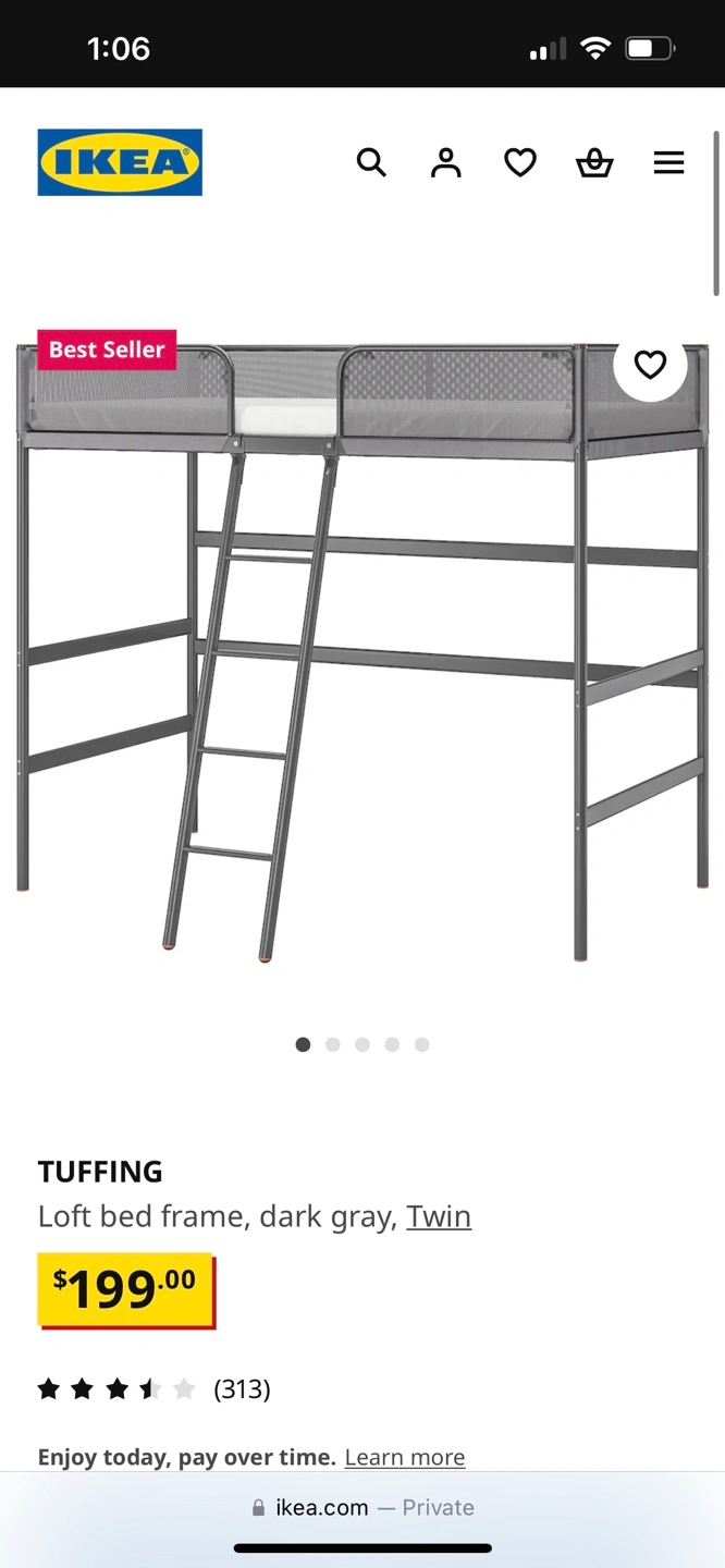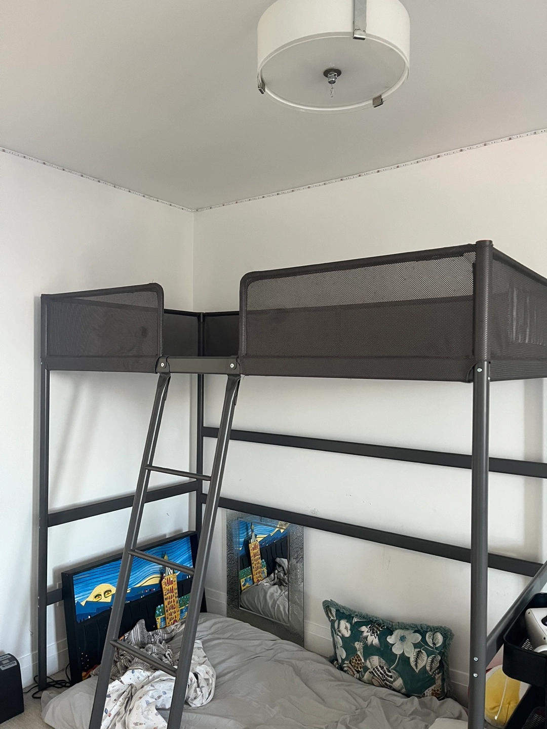 Dark gray twin loft bed frame. Includes ladder. Good condition. 8/10 condition as there are some minor scratches/stains on netting. But 0 holes and 0 stains that cannot be removed.