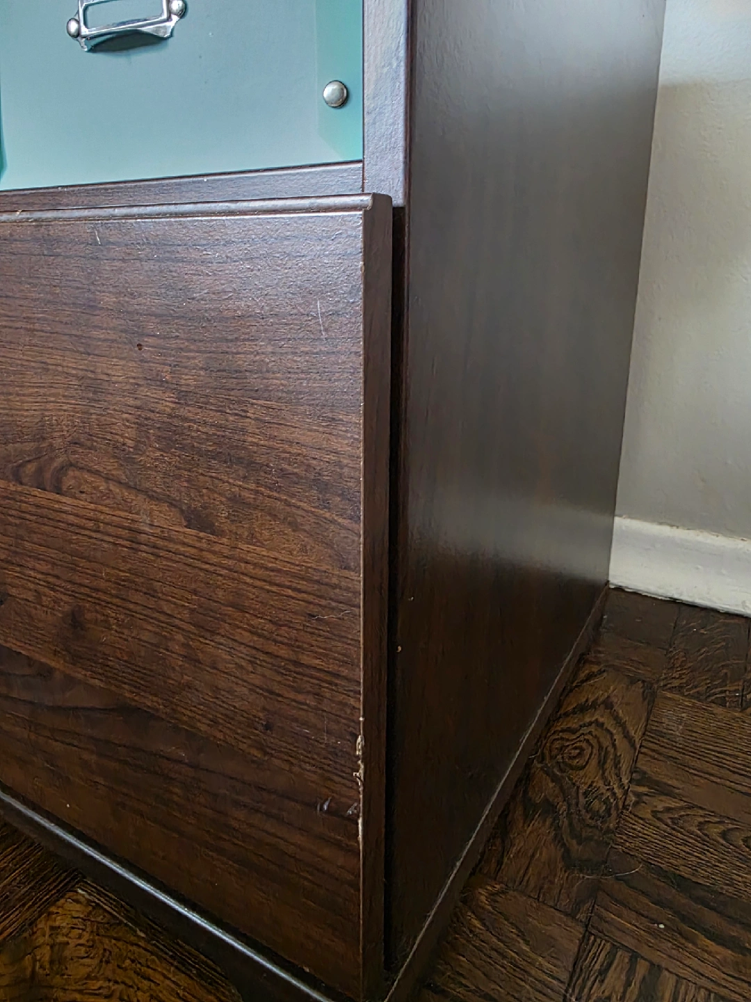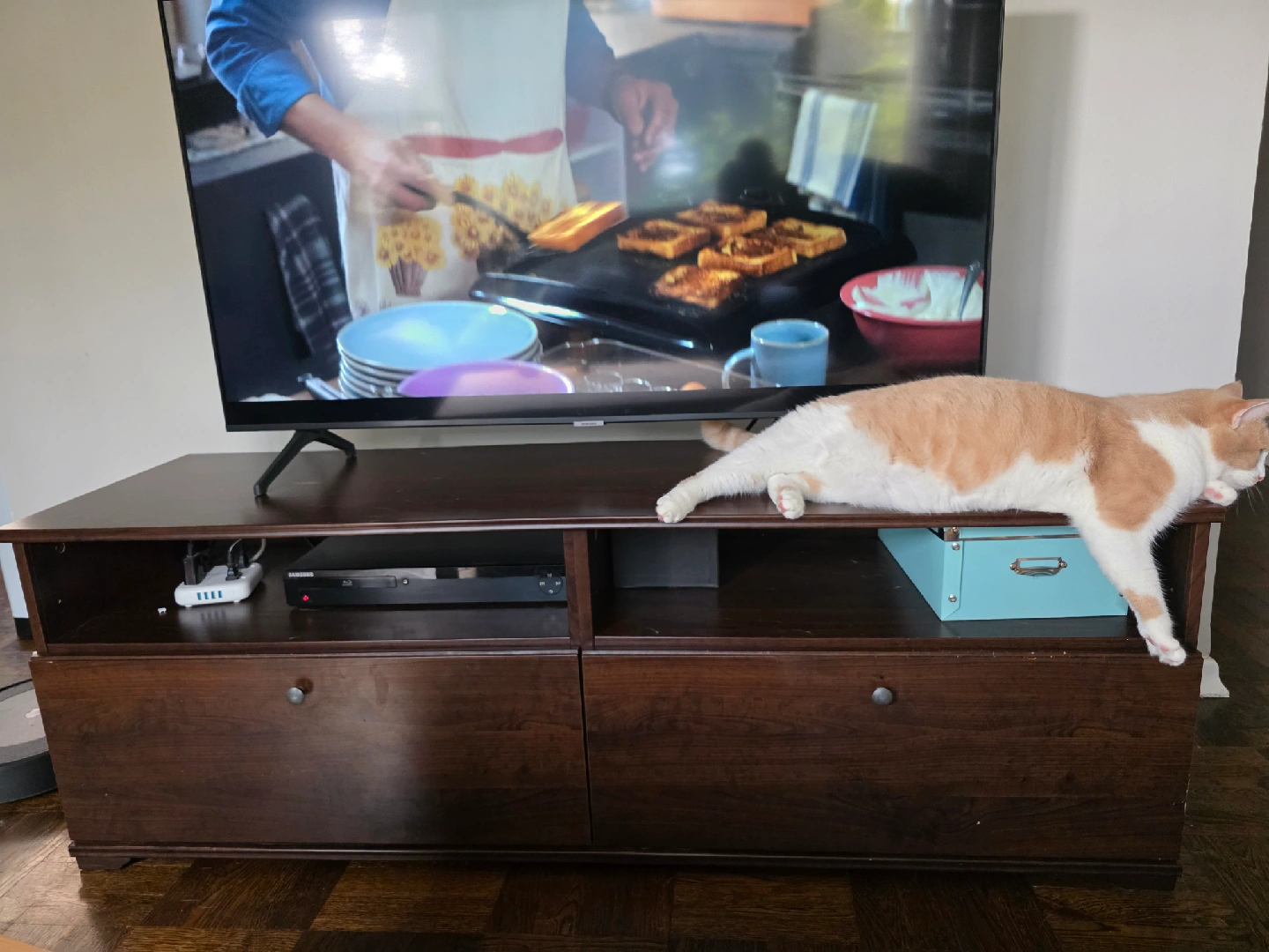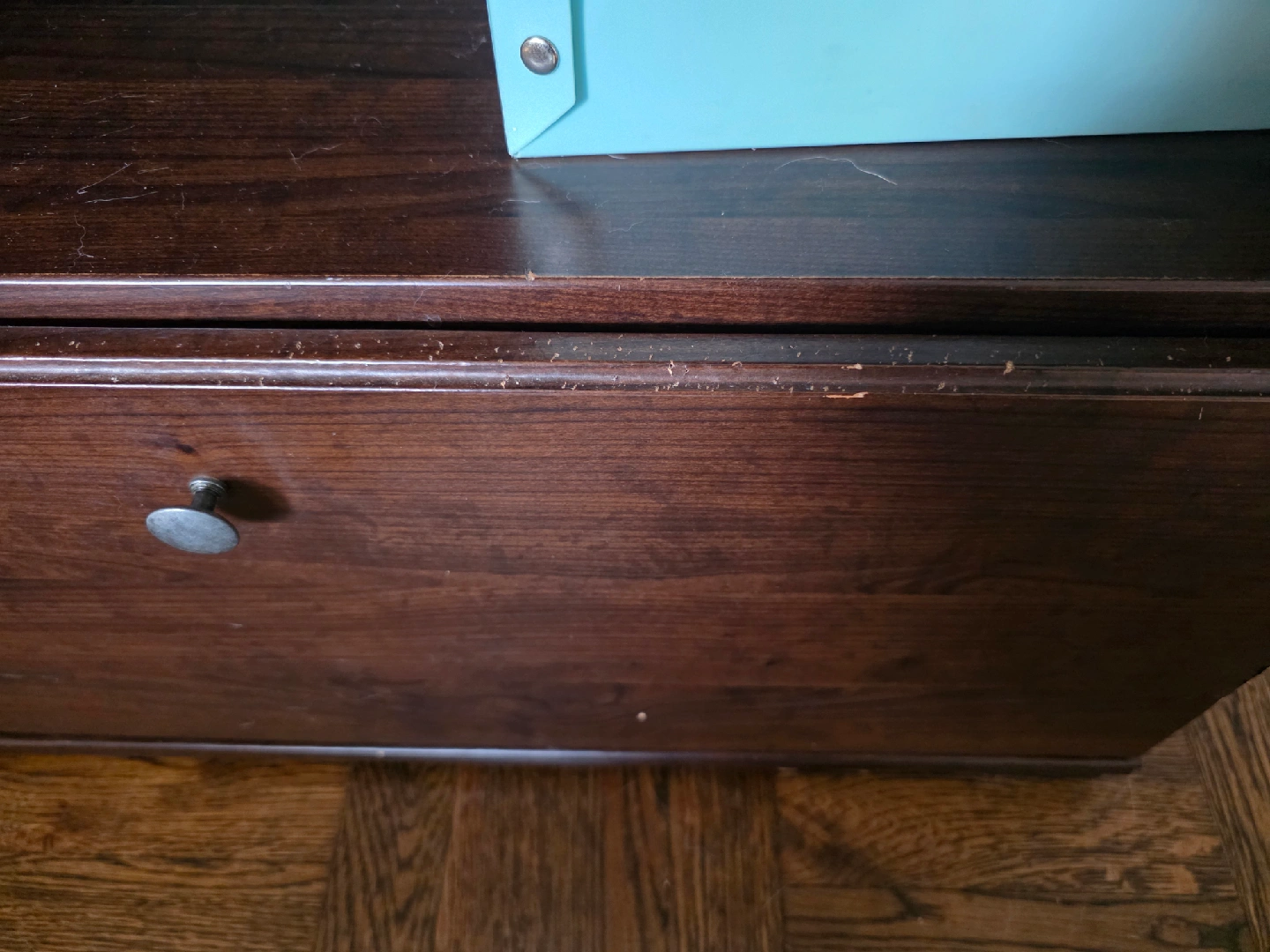 82Selling a used TV stand or media console. It has some scratches and signs of wear, as shown in the photos. It features large drawers and open shelving for storage. Cat not included!