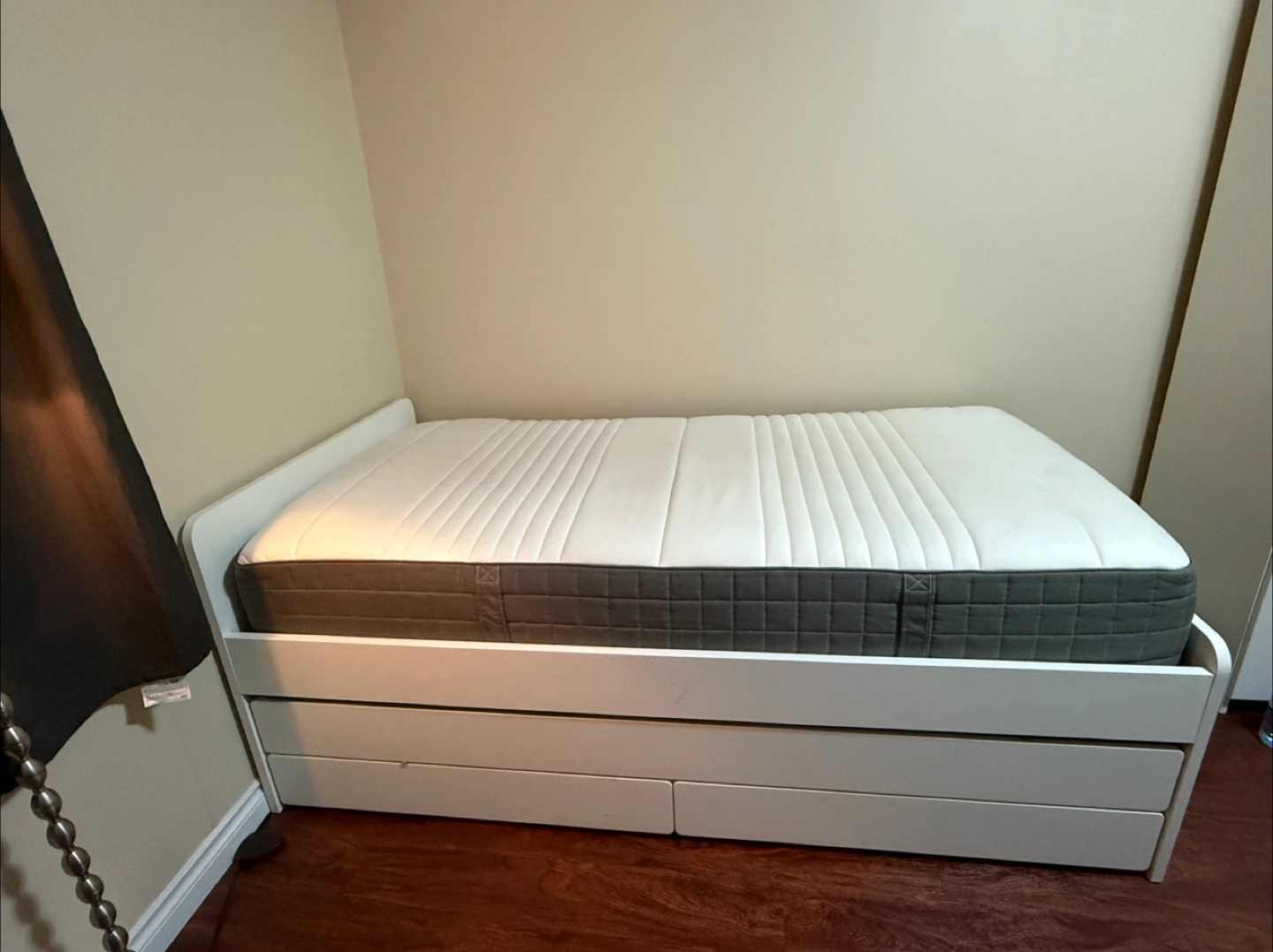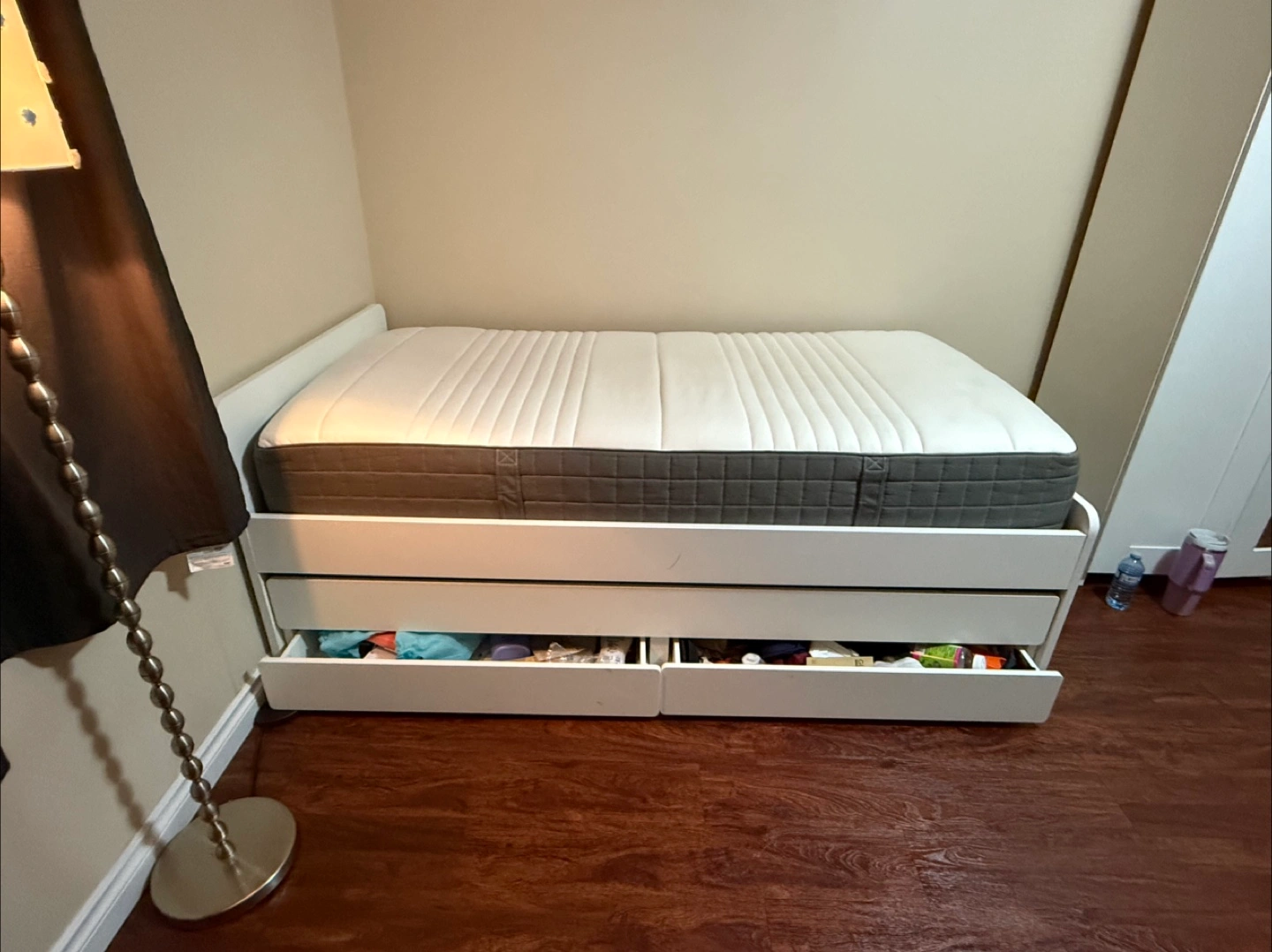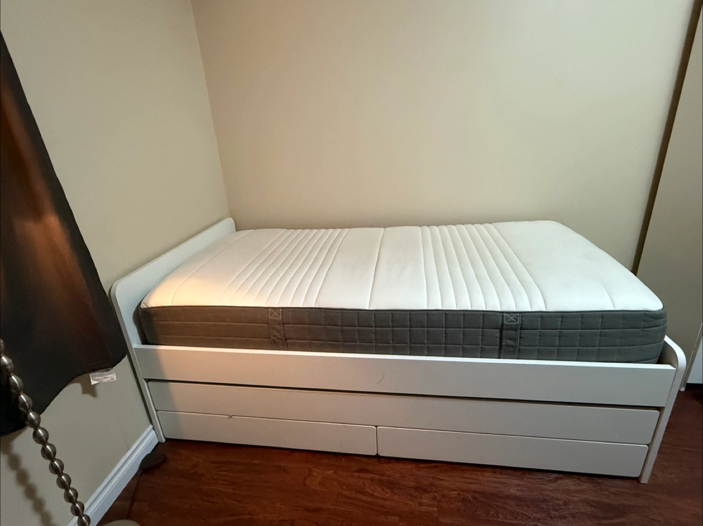 Selling a like-new IKEA twin bed frame complete with a comfortable mattress. This bed is perfect for kids, guest rooms, or small spaces and includes two built-in drawers for extra storage. Features: • Twin-size platform bed • Mattress included, lightly used and very comfortable • Two spacious drawers for storage • Modern, minimalistic design • Sturdy and durable frame • Easy to assemble/disassemble • Smoke-free, pet-free home • Excellent condition, no scratches or damage