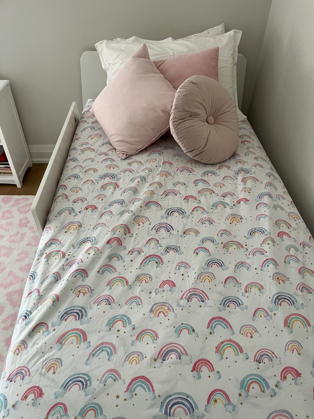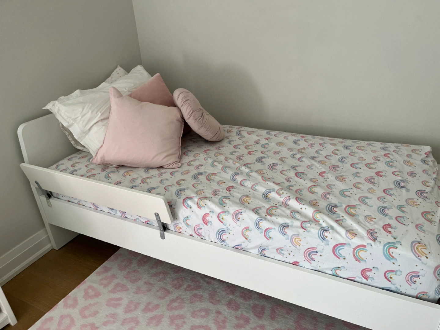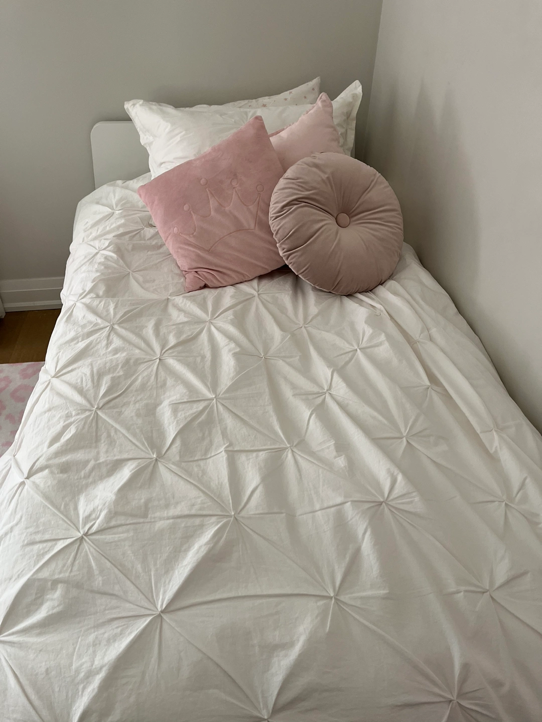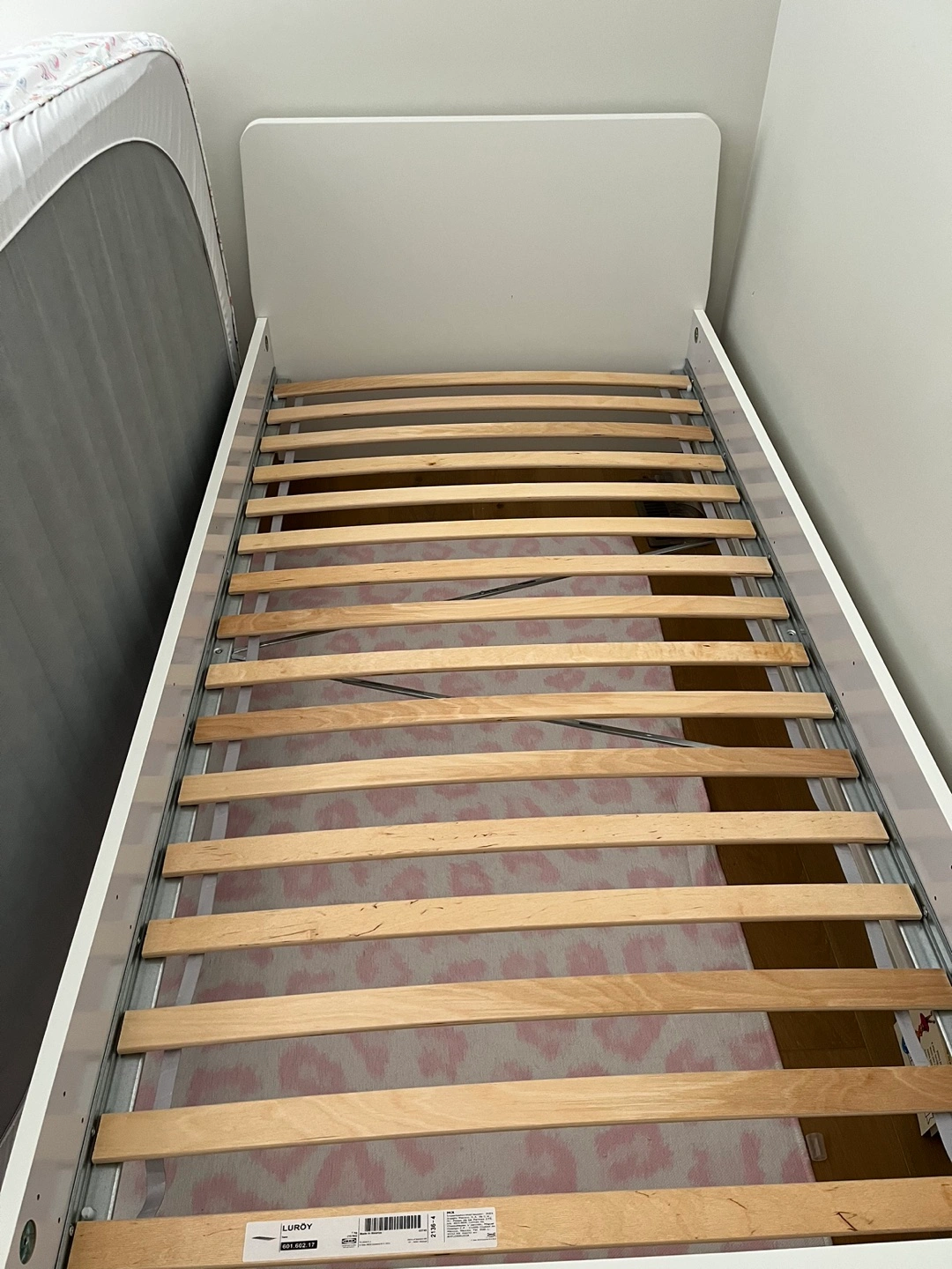 Ikea Bed Frame, guard rail, mattress and duvet. Purchased in December 2021 used by a 25 pound toddler. No accidents on mattress! Smoke free pet free home. Items can be purchased separately or altogether for $250. Bed frame (Slakt) - $75 ( slight damage from guard rail that can be touched up) Guard rail - free Mattress (Haugsvar) - $150 Duvet (light/warm) - $50