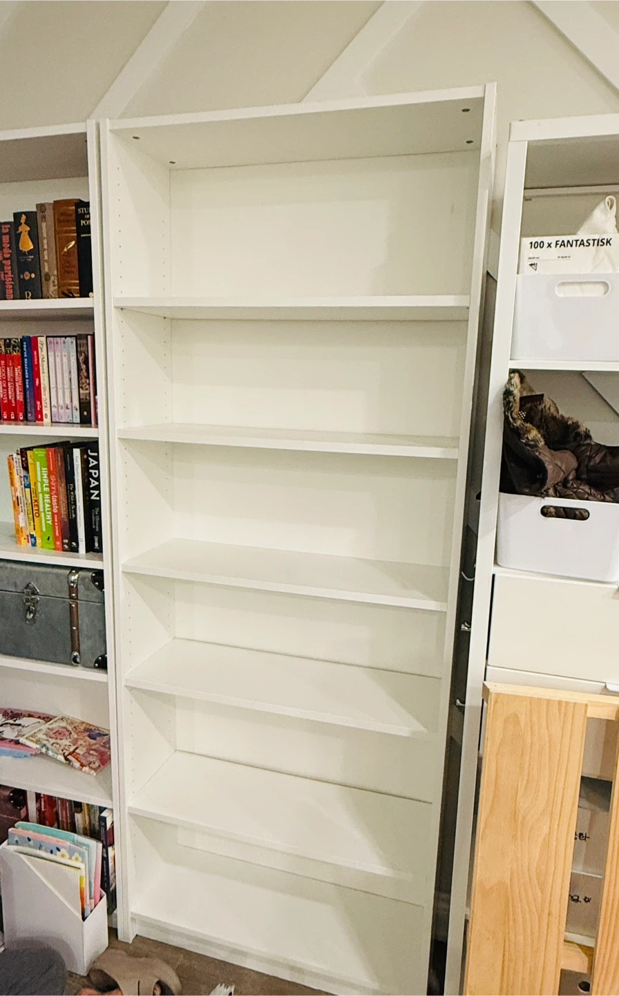 135Selling a white IKEA Billy bookcase. Great for books, decor, or storage! Only sell two, not separately!! It is 2018 product so sturdy compared to latest one. But some of shelf is a little warped due to old (plz see photos)