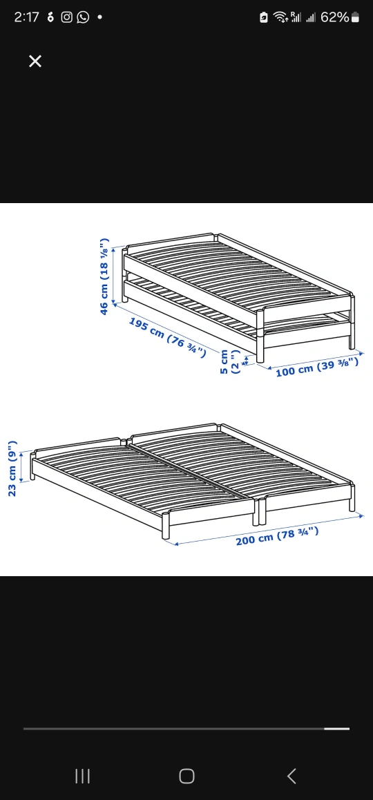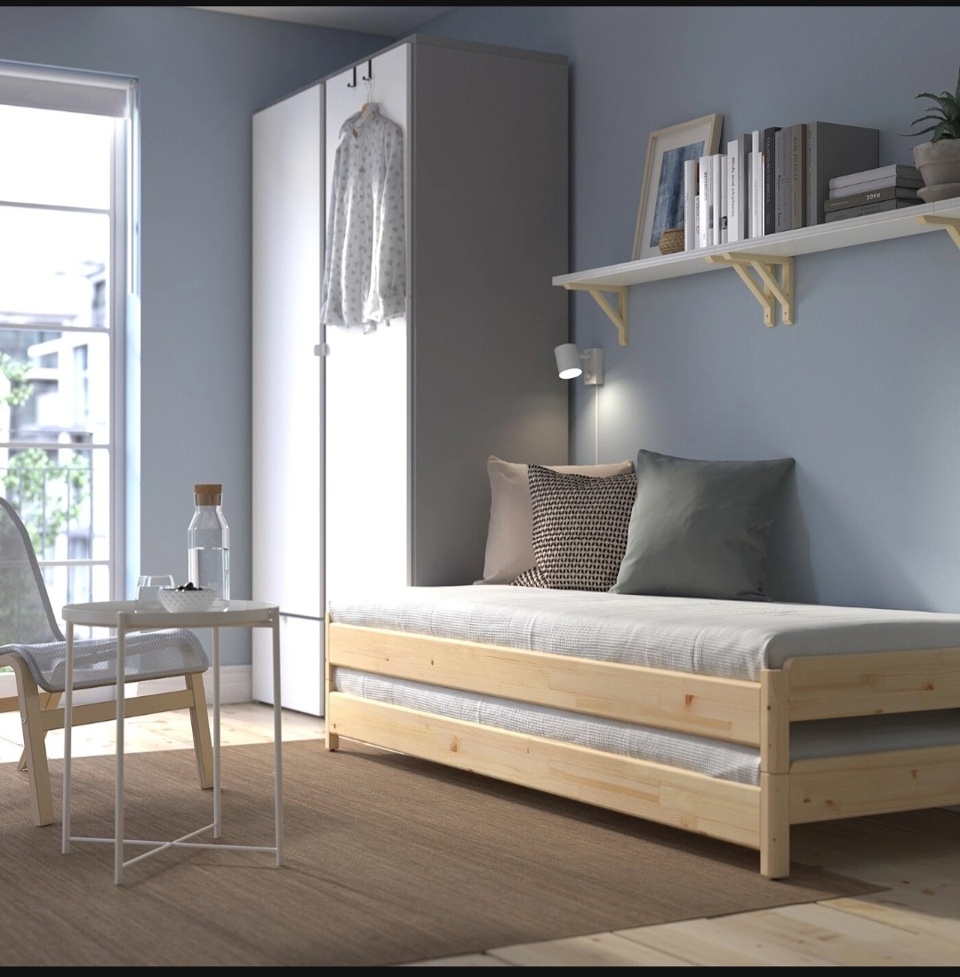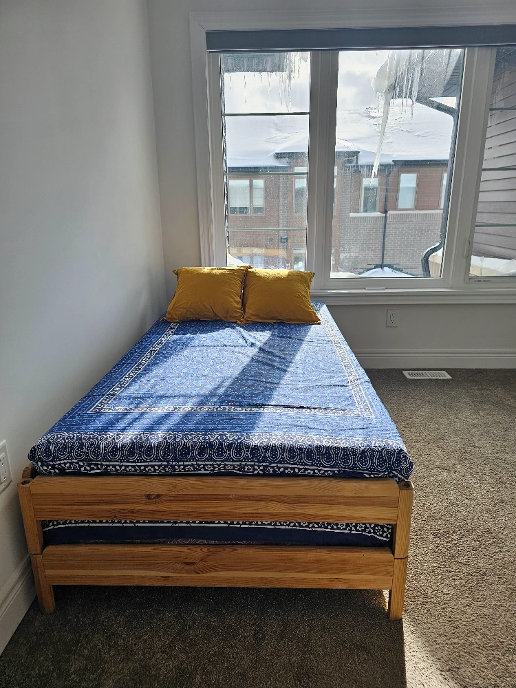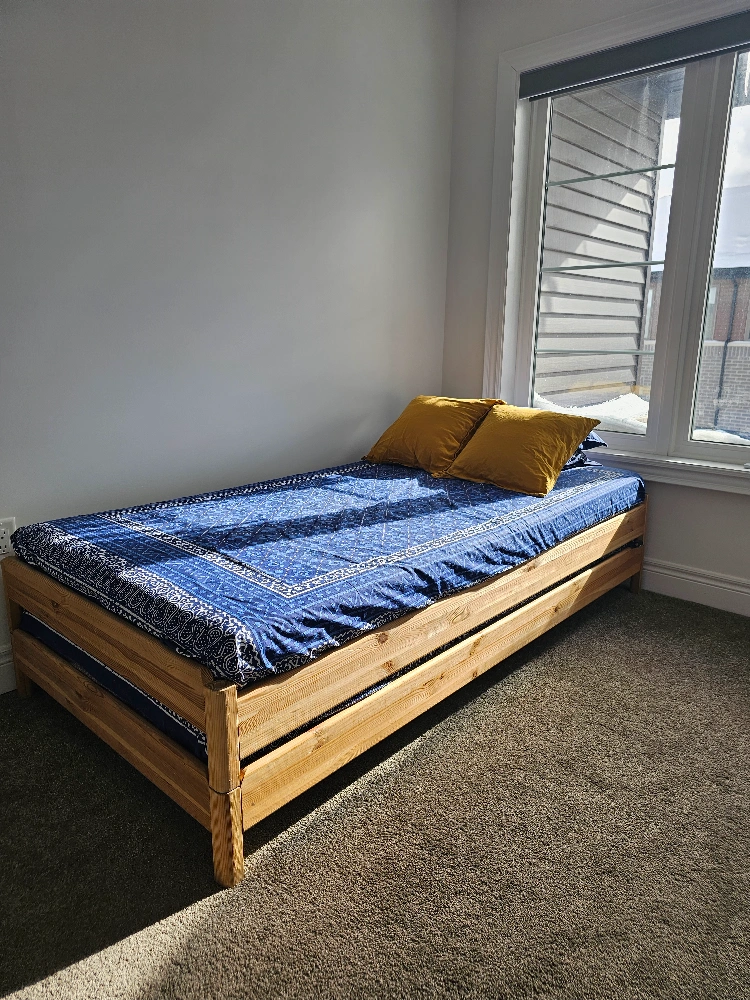Solid pine wood bed frame. Sleek and simple design. Mattresses included. New one sells for $577 + taxes. Pull-out trundle included. Great for kids' rooms, small spaces or guest room. Dimensions shown in images. Can be easily converted to twin bed, corner sofa , double bed. Lightweight, easy to lift and move.