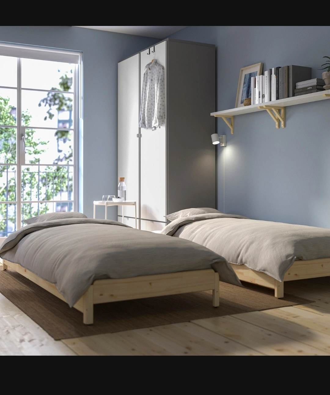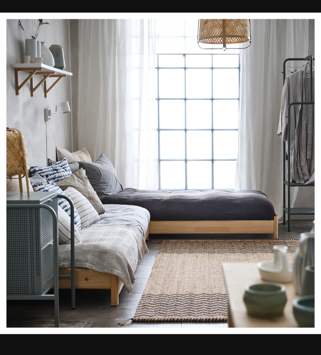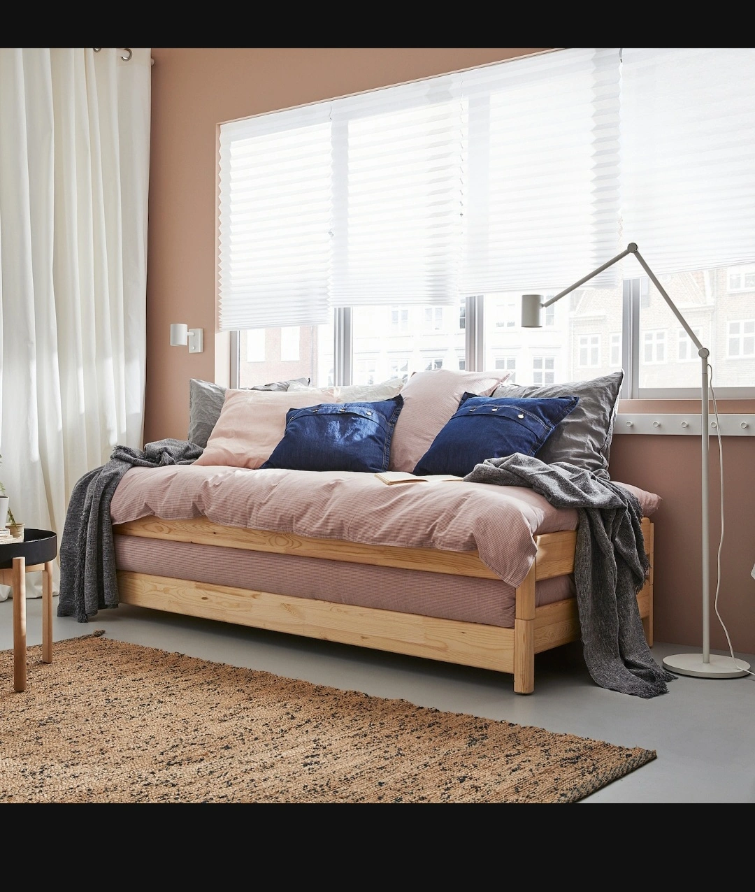 Solid pine wood bed frame. Sleek and simple design. Mattresses included. New one sells for $577 + taxes. Pull-out trundle included. Great for kids' rooms, small spaces or guest room. Dimensions shown in images. Can be easily converted to twin bed, corner sofa , double bed. Lightweight, easy to lift and move.