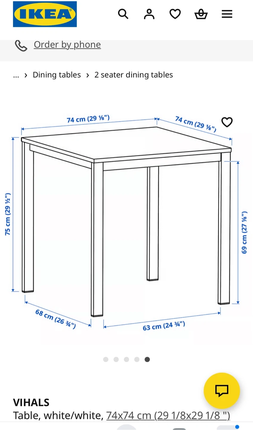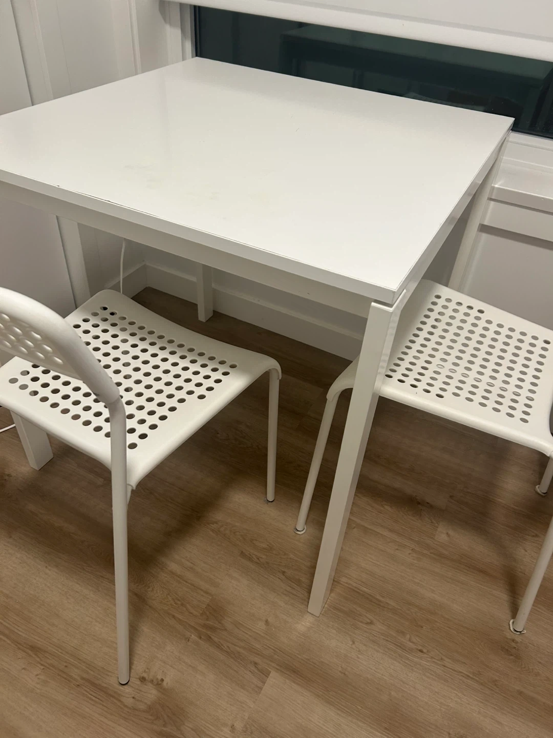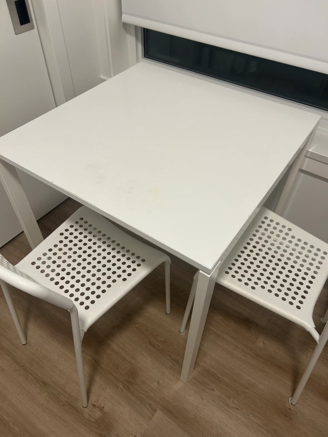53Selling an IKEA VIHALS table with two matching chairs. The set is in great condition and perfect for a small dining area or kitchen. The table is 74x74 cm (29 1/8x29 1/8 ") and the chairs are a comfortable height. All pieces are white, creating a clean and modern look for your space