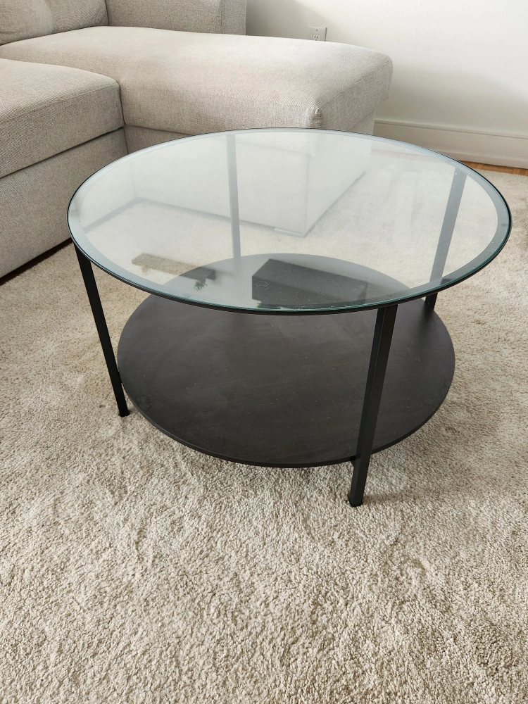Selling my IKEA VITTSJÖ round coffee table (black-brown/glass, 75 cm), purchased 3 months ago. Stylish black-brown frame with tempered glass top Extra storage shelf at the bottom for books, décor, or essentials Compact, modern design that fits well in living rooms or small spaces Condition: Like new, no cracks or damage From a smoke-free, pet-free home