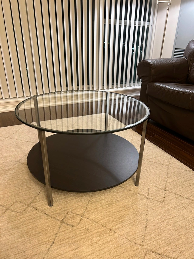 70The VITTSJÖ coffee table is made of durable, high-quality materials that are easy to maintain. It also offers extra storage space on the lower shelf. Note: This particular table has been sprayed with metallic aluminum paint, which explains the reduced price, as it is no longer fully black, but rather metallic aluminum and black. Measurements: Height: 45 cm (17 3/4") Diameter: 75 cm (29 1/2") Price (New): $69.99 Price (Used): $20 More details can be found here: https://www.ikea.com/ca/en/p/vittsjoe-coffee-table-black-brown-glass-80213309