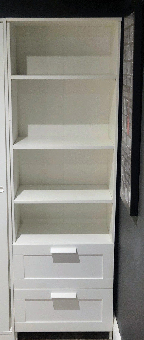 Selling a white bookcase that’s in great shape! It features several shelves and two handy drawers at the bottom for extra storage. Perfect for organizing your books or displaying your favourite items in a tidy way