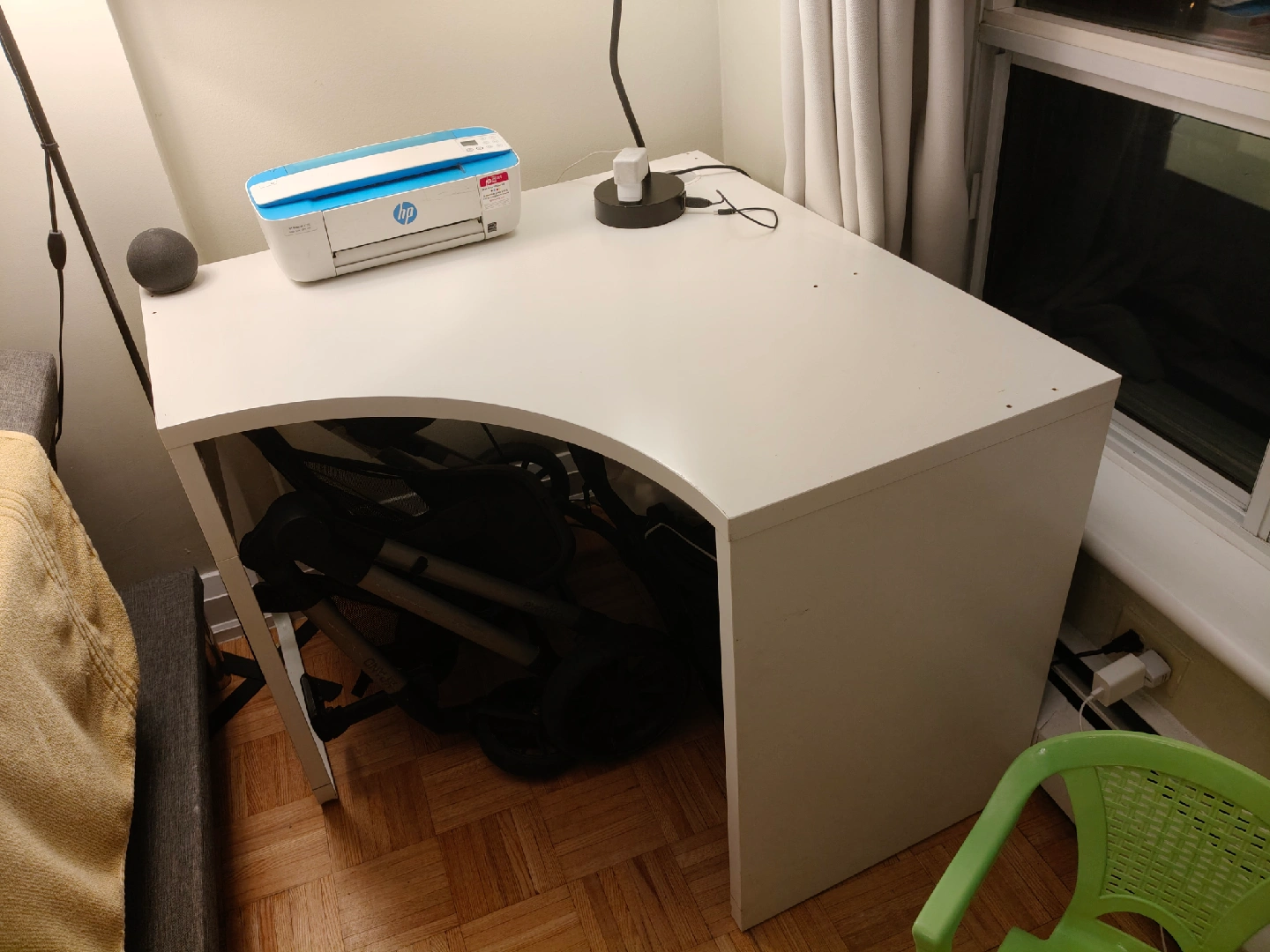 91Selling a white corner desk (only the desk). It's in good condition (not like new) apart from few scratches and perfect for a home office or study space! It has a unique curved design, providing ample workspace while fitting nicely into a corner. It's sturdy and ready to use!