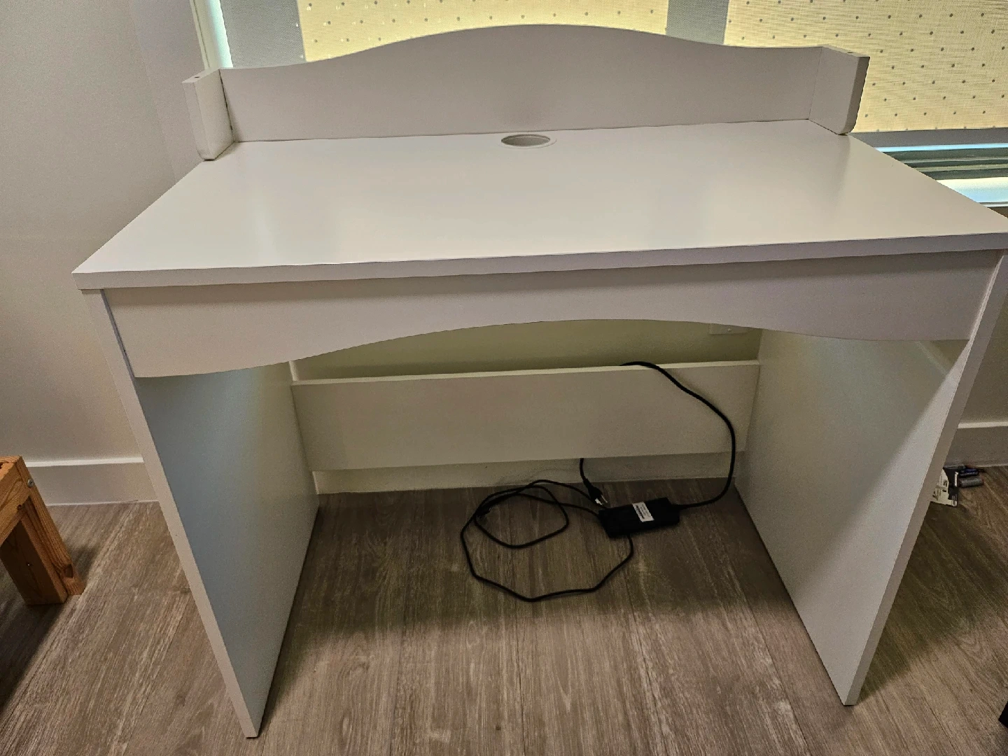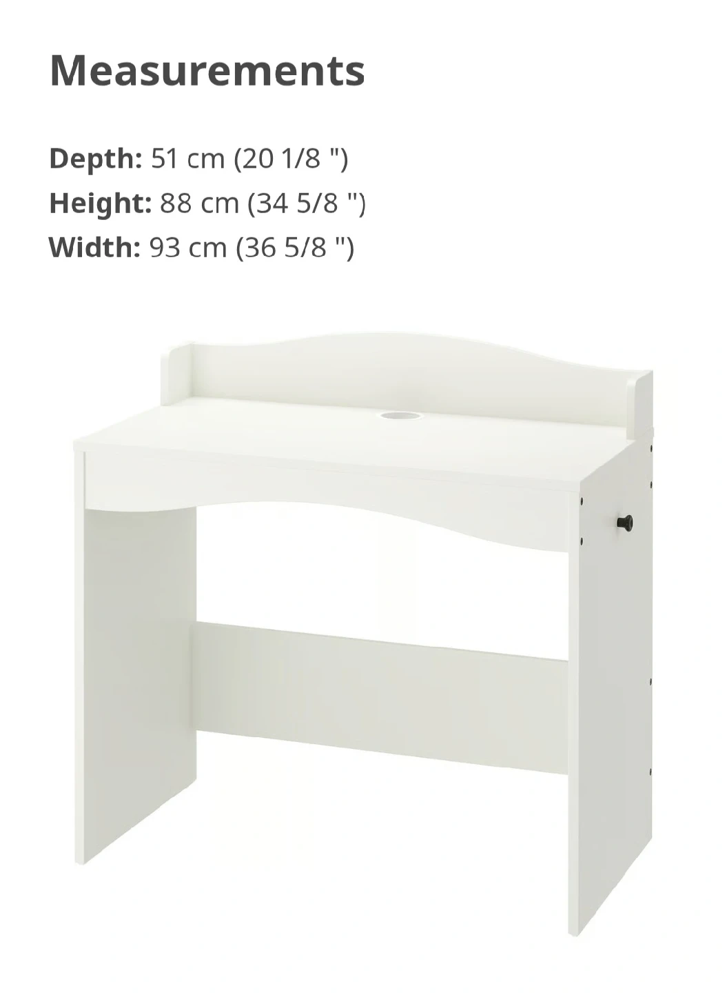 26Hi! I’m selling my white IKEA desk — it’s in excellent condition, almost like new. Perfect for small spaces! I used it for work, but it would also be great for a student or a child. Feel free to contact me if you’re interested 😊 Bonjour ! Je vends mon bureau blanc IKEA, en excellent état, presque comme neuf. Idéal pour les petits espaces ! Je l’ai utilisé pour le travail, mais il conviendrait aussi très bien à un étudiant ou à un enfant. N’hésitez pas à me contacter si vous êtes intéressé(e) 😊 Dimensions: - Depth: 51 cm (20 1/8 ") - Height: 88 cm (34 5/8 ") - Width: 93 cm (36 5/8 ")