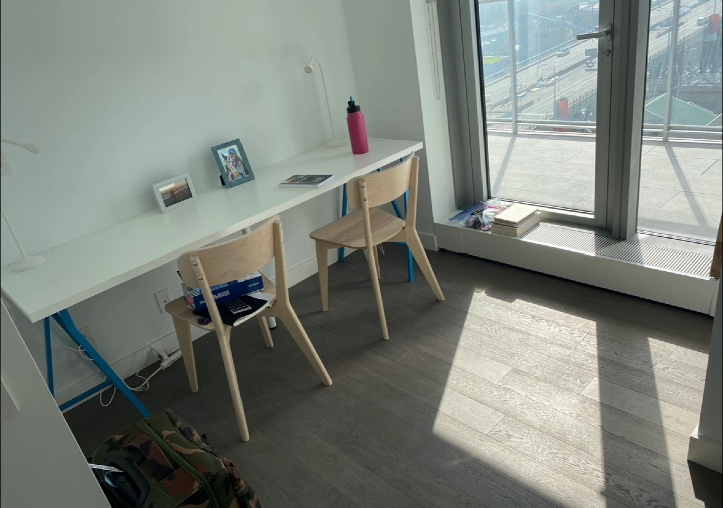 For sale: IKEA white desk with a modern design, featuring blue metal legs. Good condition, perfect for a home office or study space. Selling for $70. Pickup only in Downtown Vancouver. Message me for more pics or details!