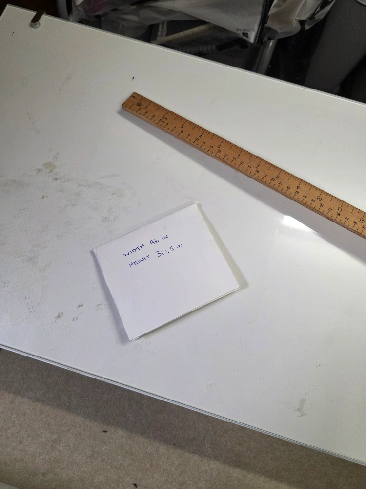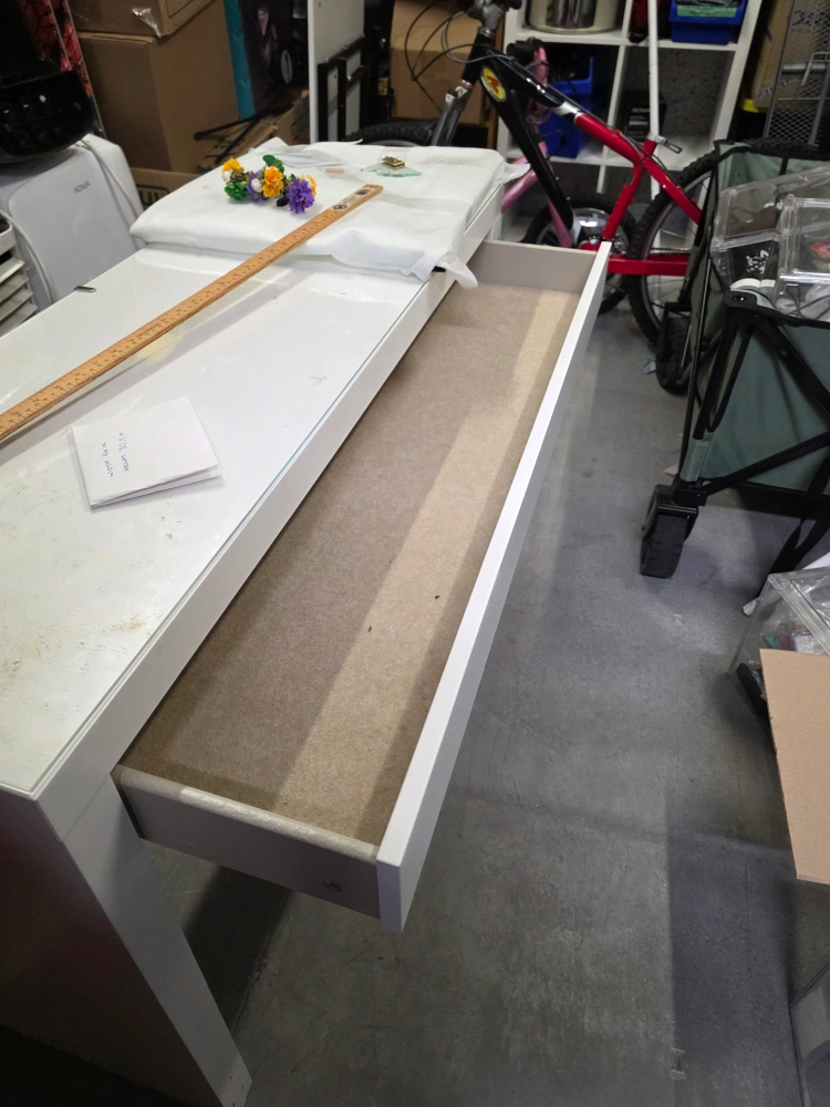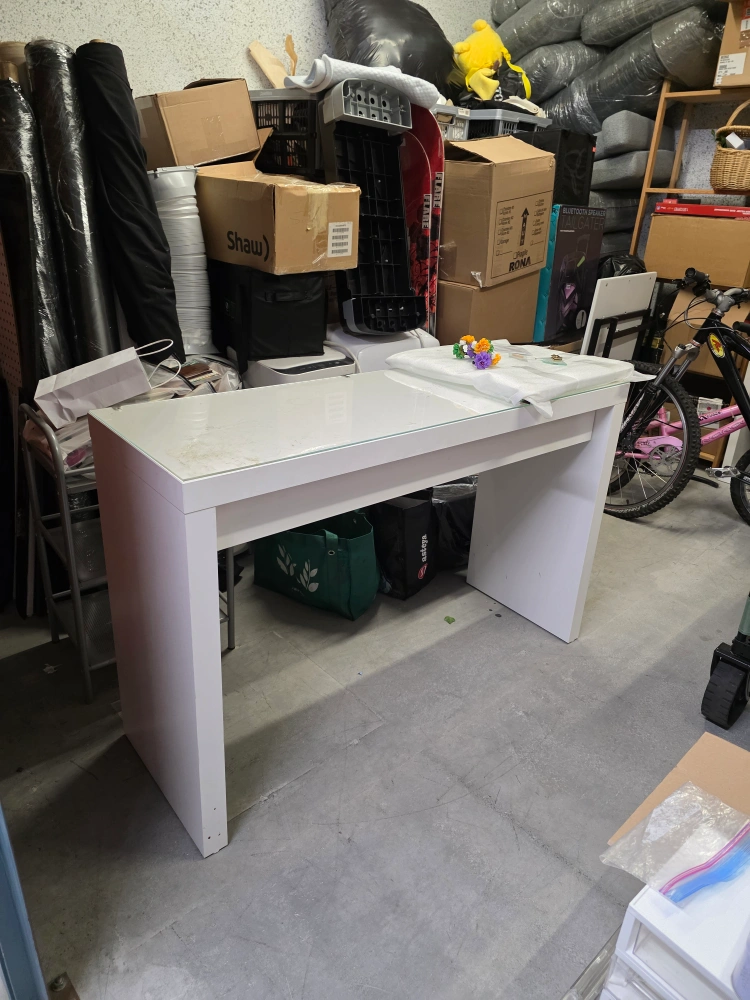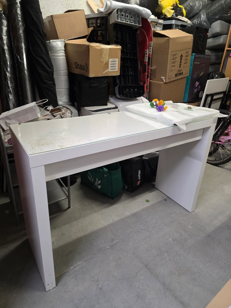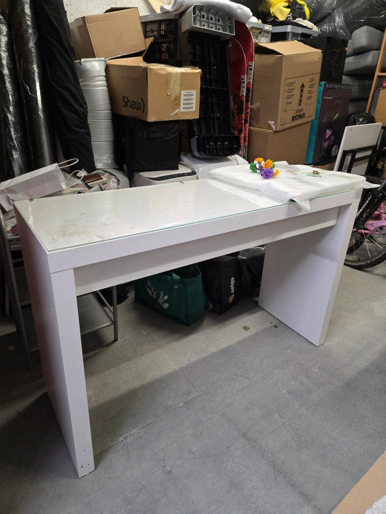 Selling a white desk with a glass top. It has a clean and simple design. The dimensions are 46 inches in width and 30.5 inches in height. I will clean up the glass on top before you pick-up.