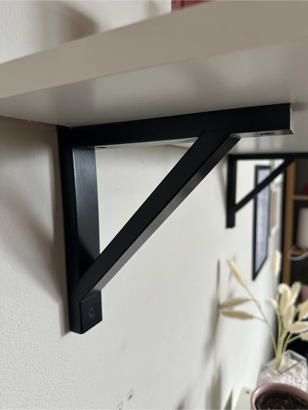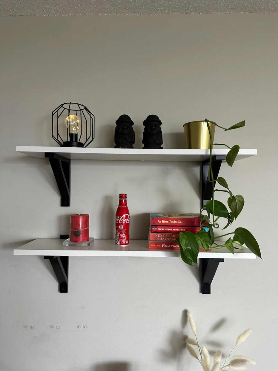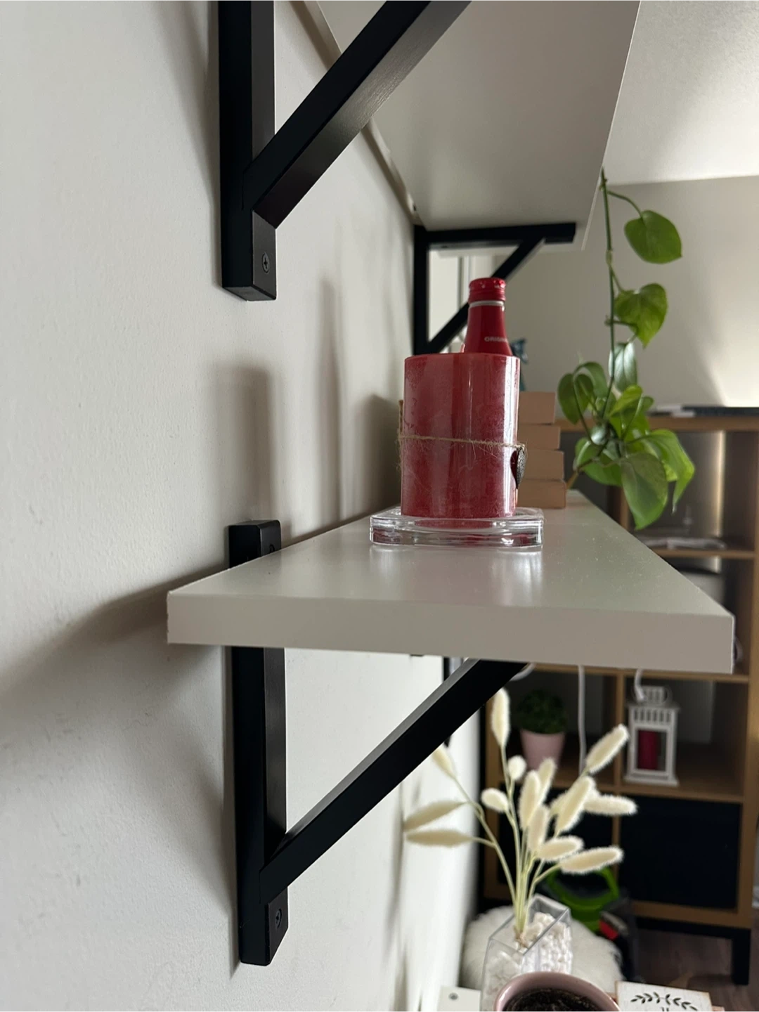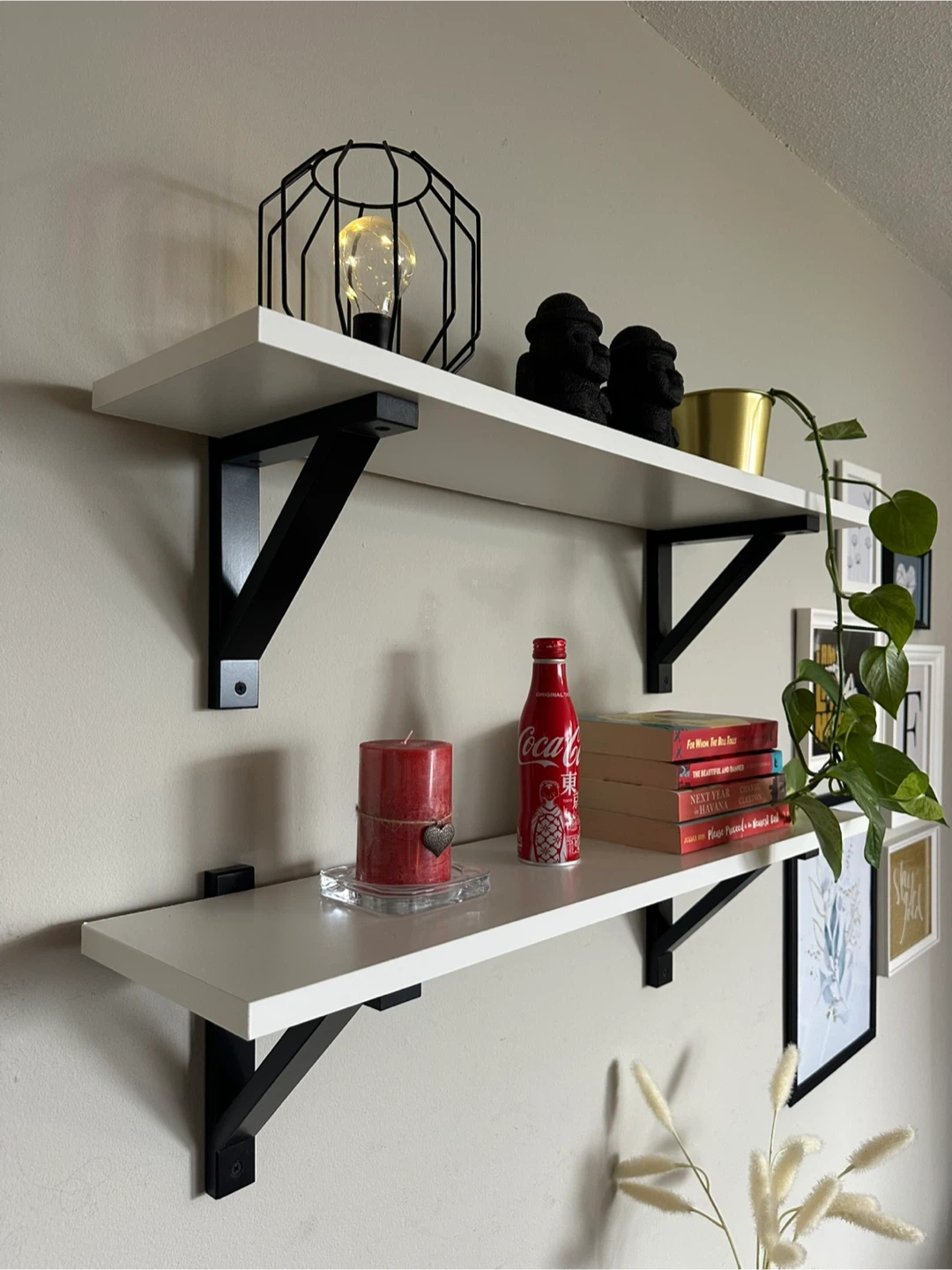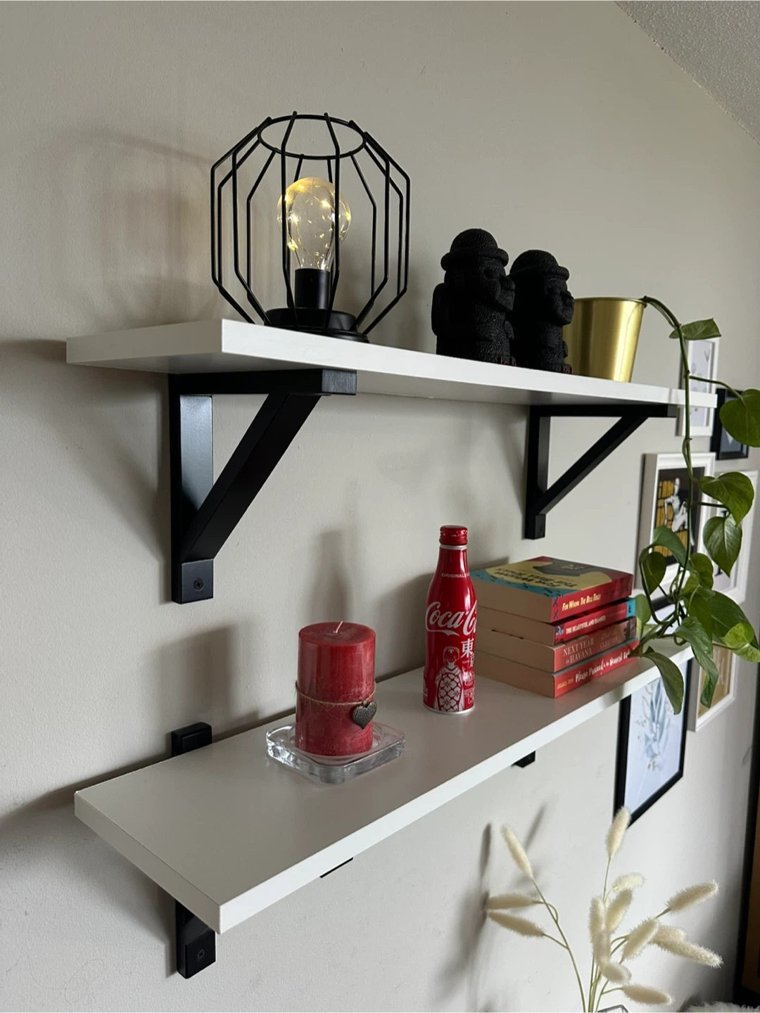 Selling a 2-set of white shelves with black brackets. They're perfect for adding some extra storage and style to any room. The shelves are in great condition and ready to be installed. Two sets of shelf tops, brackets and screws included. Decoration is NOT included. Size: 31 in x 7.5 in Brand: IKEA