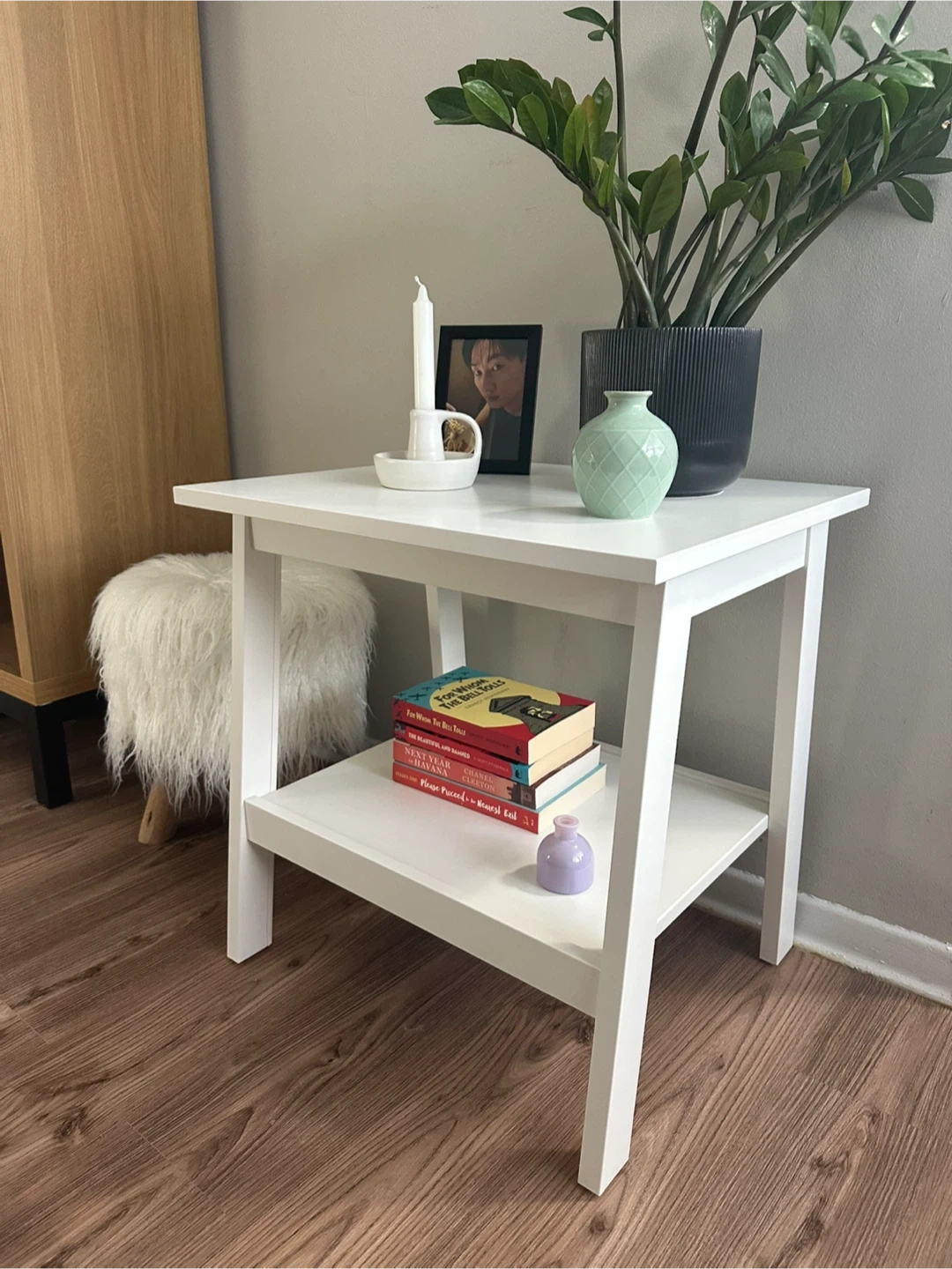 Selling a simple white side table. Great for small spaces or as a bedside table. In good condition and ready for a new home. On the top part, close to the edge, there are two small parts where the wood got wet (from glasses and drinks being placed without a coaster) and formed a bump. See the photos. Other than that, is looks like new. No scratches or damage to the legs. Brand: IKEA Not available at stores anymore.