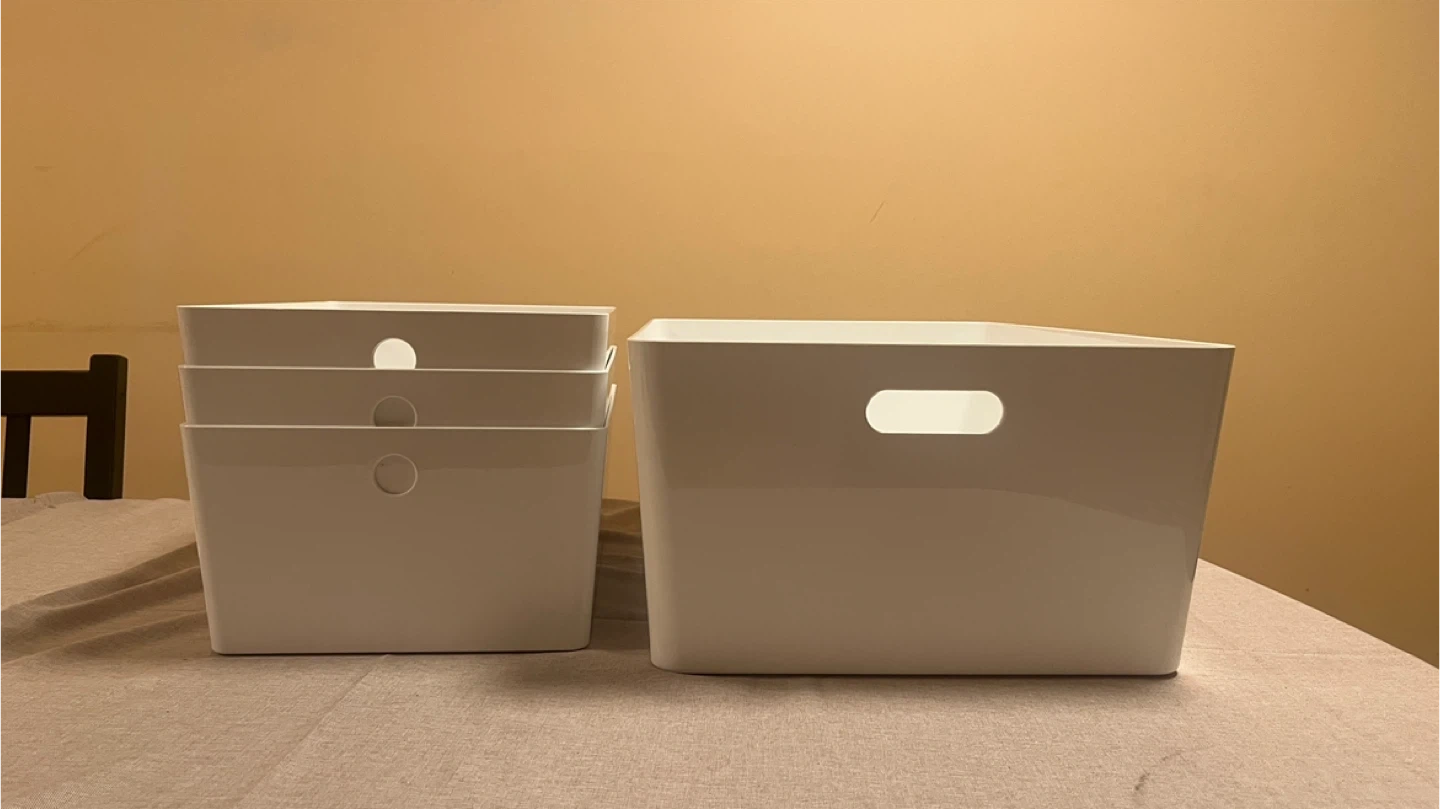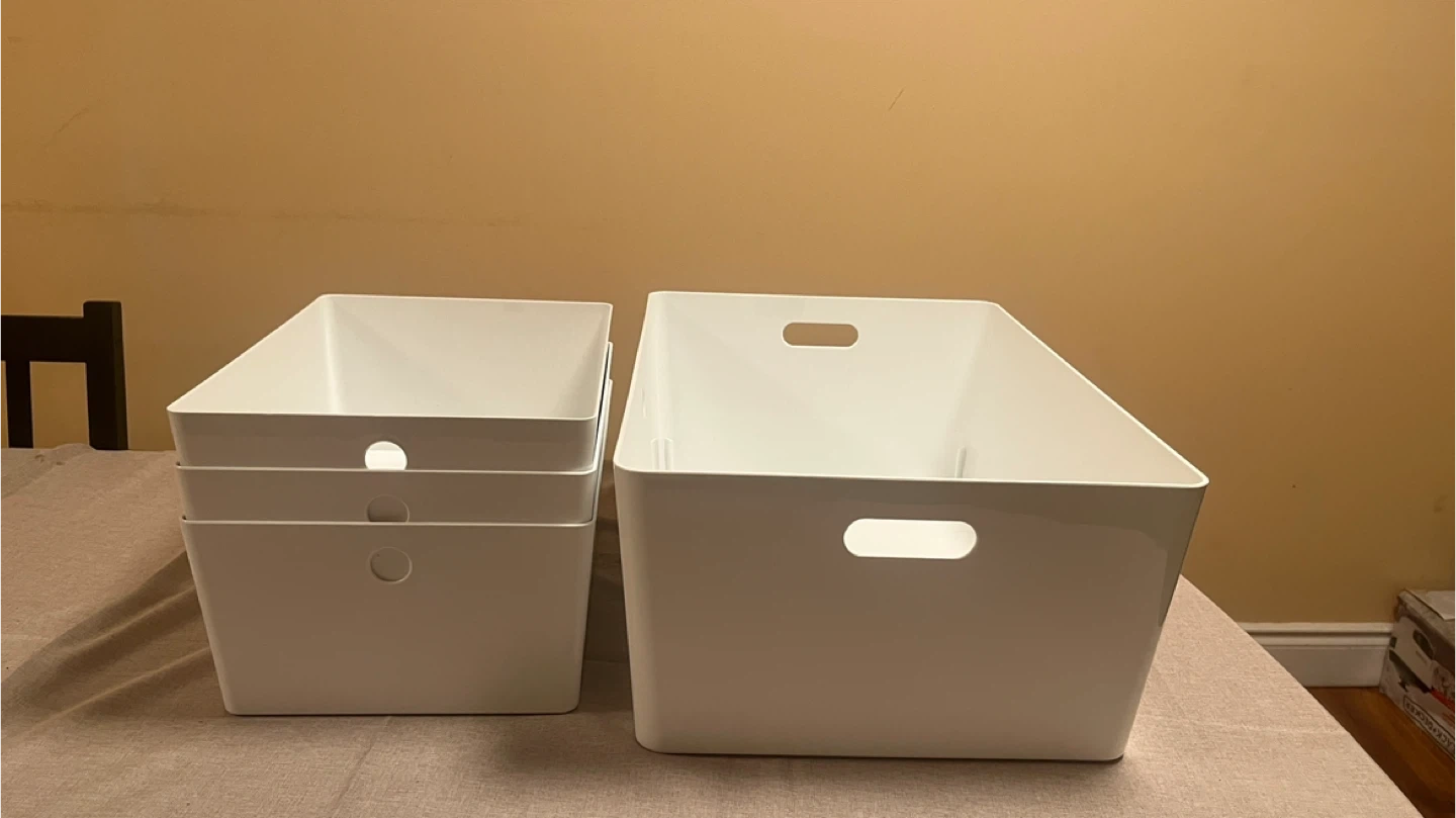 81Selling some handy IKEA storage bins! They're great for organizing just about anything around the house. Perfect for decluttering and keeping things tidy Includes: • 1 Large Bin • 53 cm (L) × 36 cm (W) × 21 cm (H) • Built-in side handles for easy carrying • 3 Small Bins • 35 cm (L) × 26 cm (W) × 15 cm (H) • Round grip holes at the front