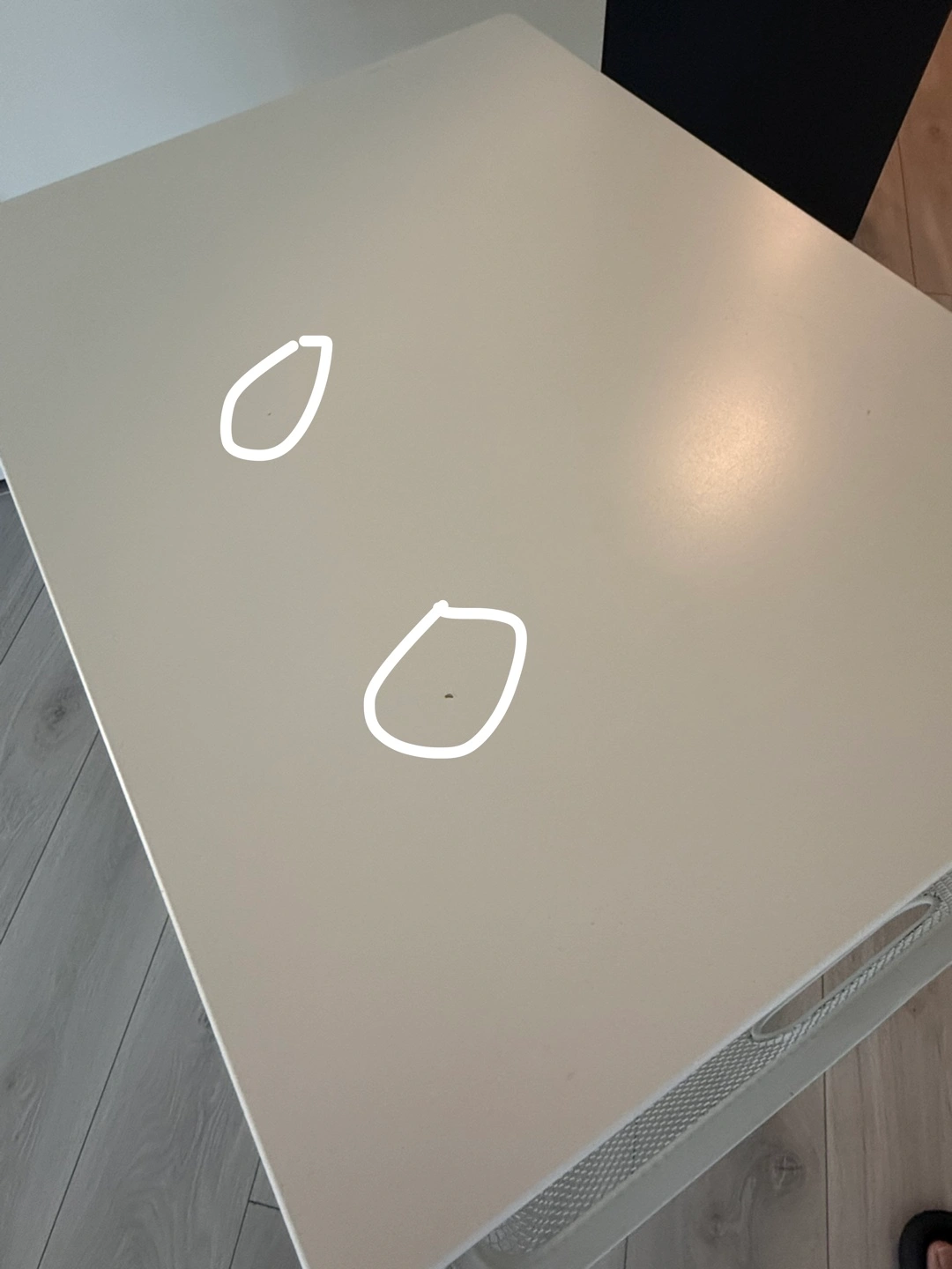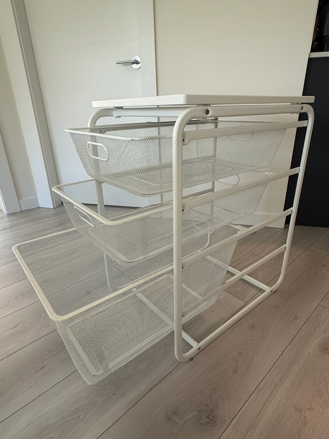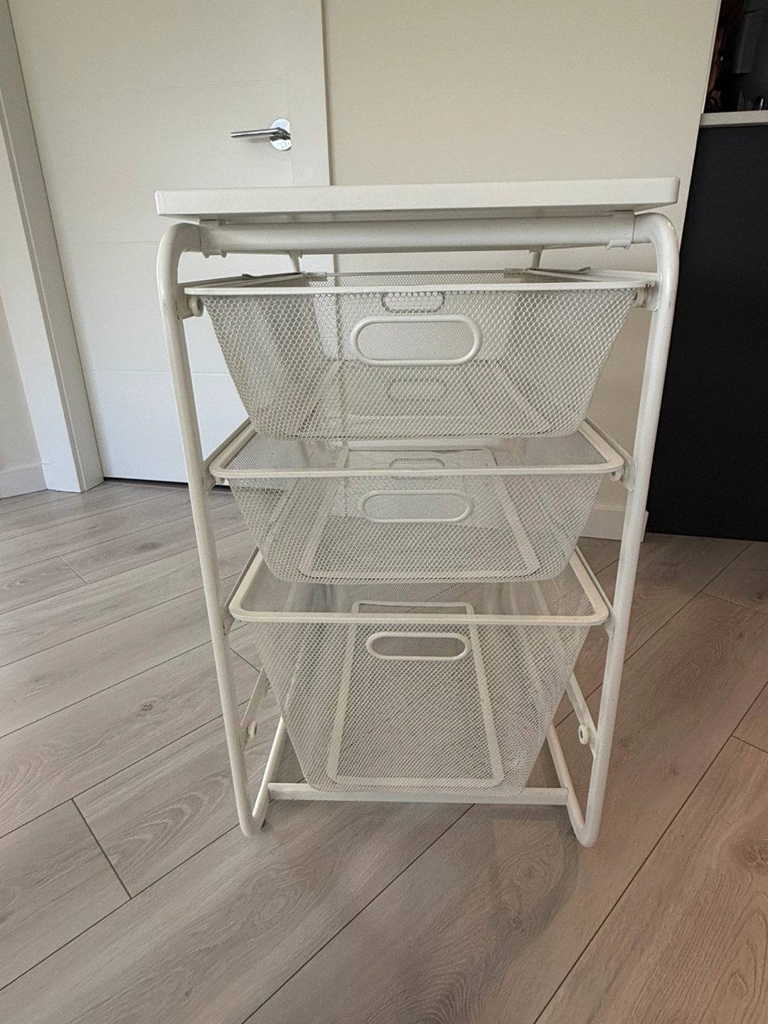 115White metal storage unit with four wire drawers and a top surface. The unit has a sturdy construction. The drawers are easy to slide in and out. Great for organizing and storing items. Two mini dents on the top base but everything else is fine.