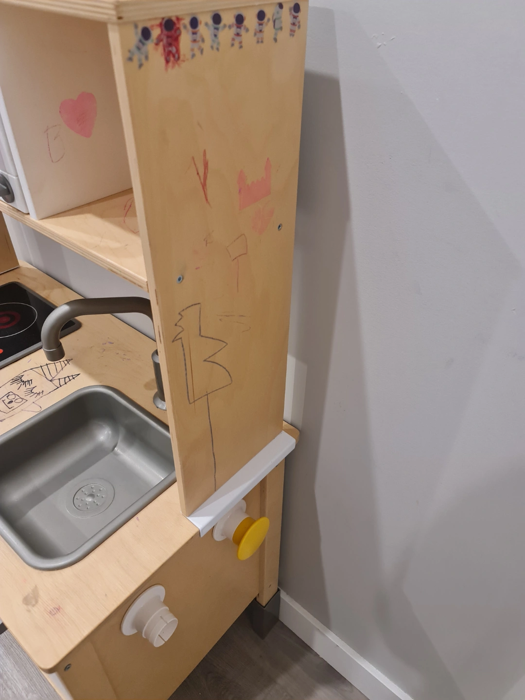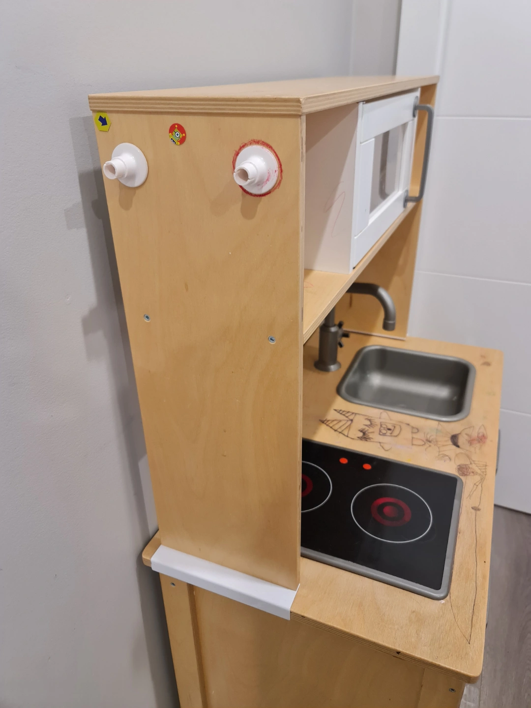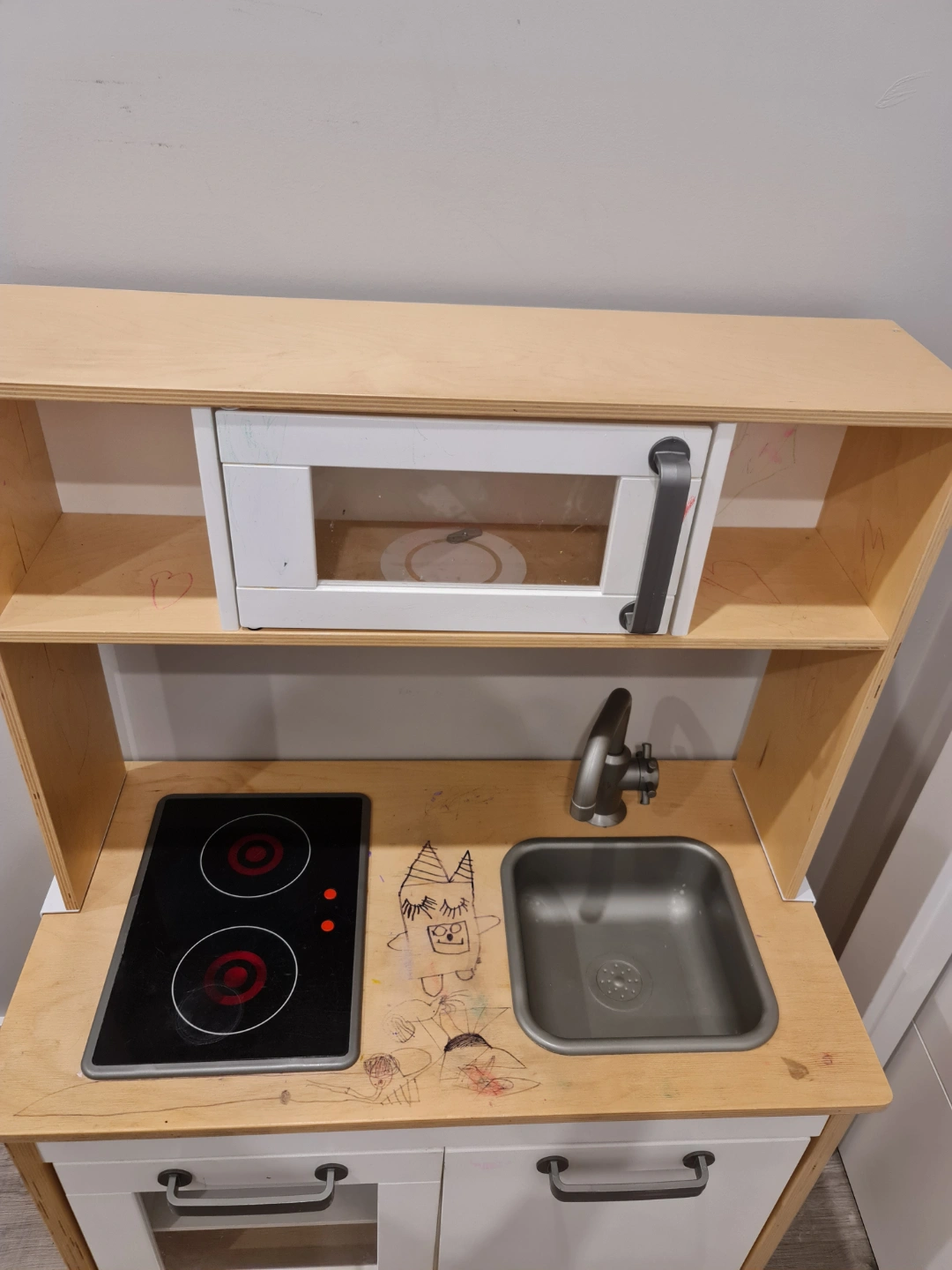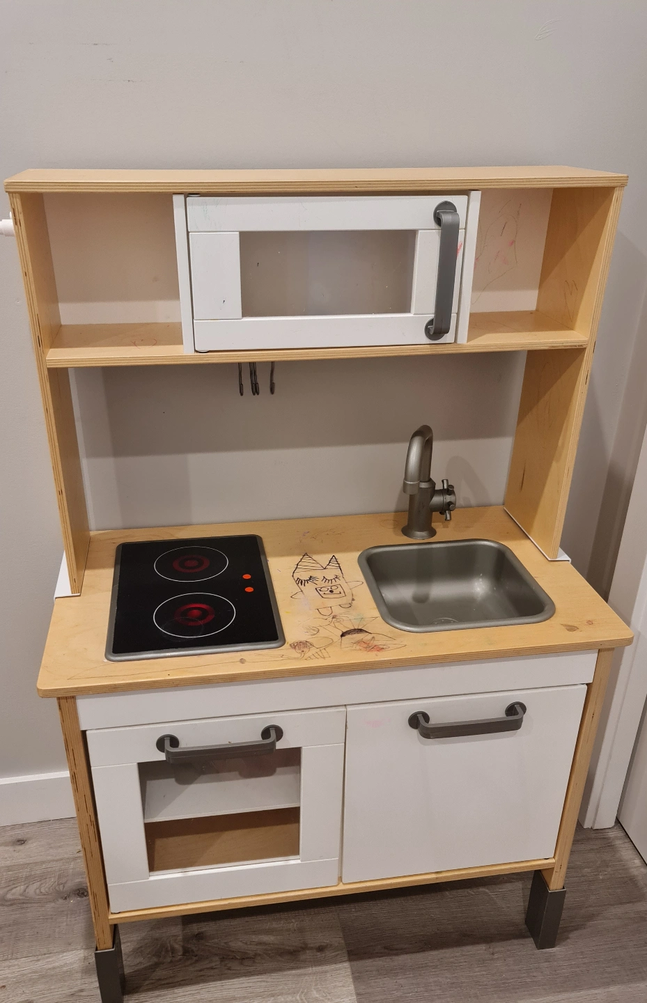 43Wooden kitchen set. Features a sink, stovetop, and microwave. Comes with storage. Perfect for stimulating imagination and creative play.