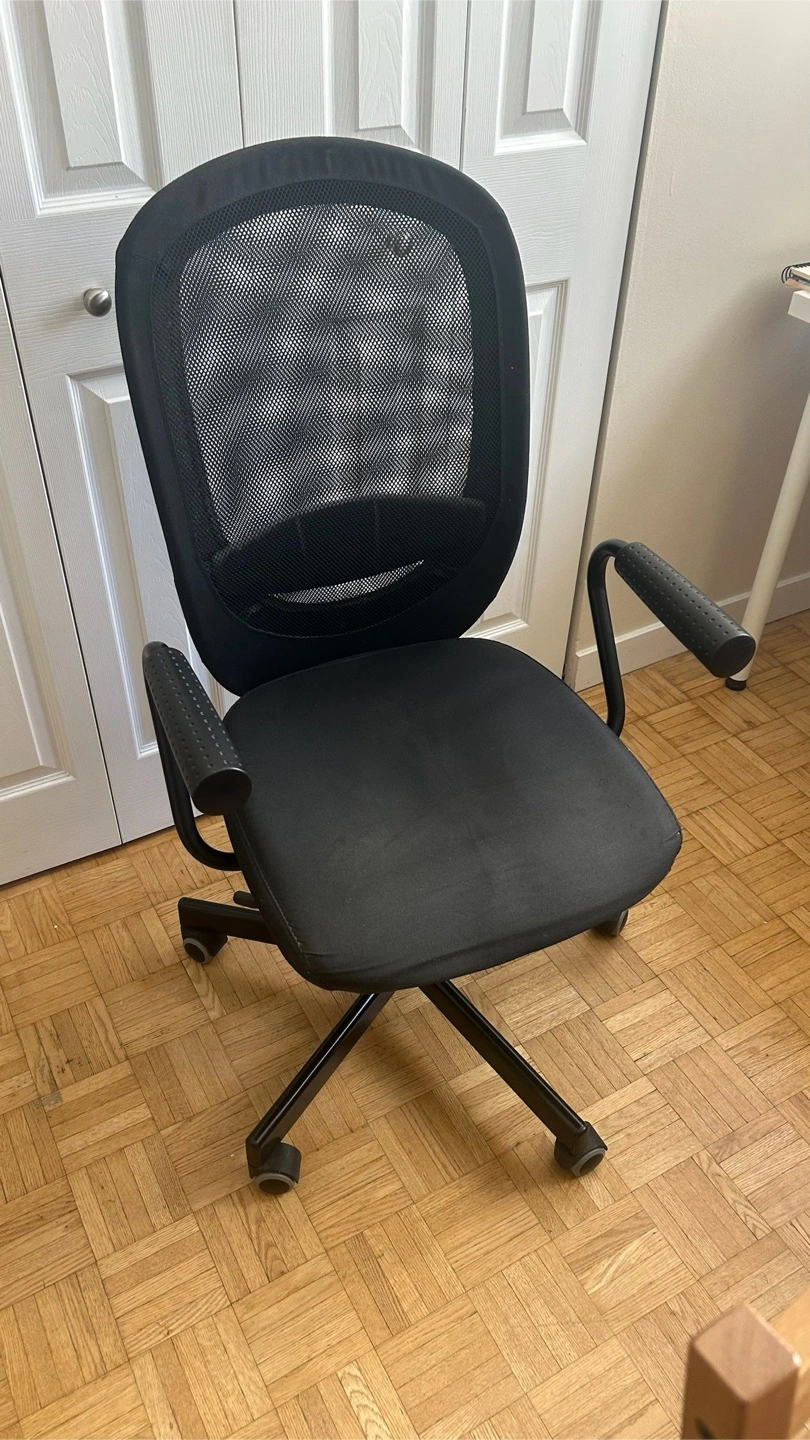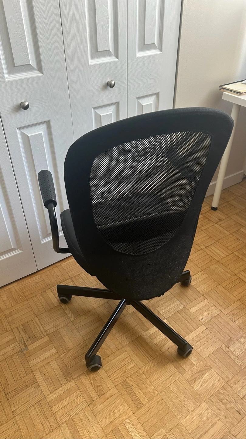 Selling a comfortable black Ikea office chair! It's in great shape and perfect for working from home or studying. The mesh back provides good ventilation, and the adjustable armrests add extra comfort.