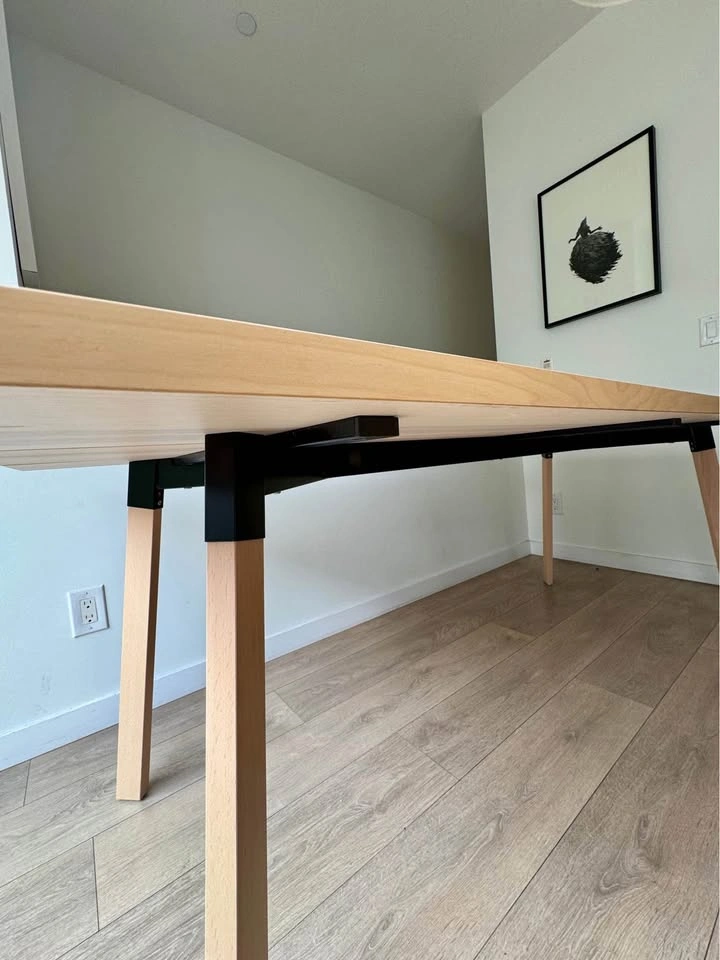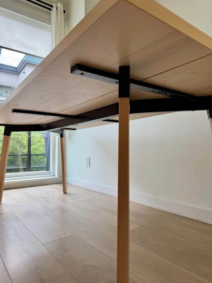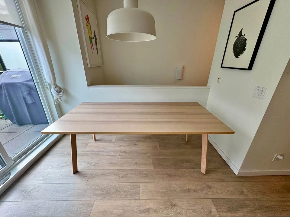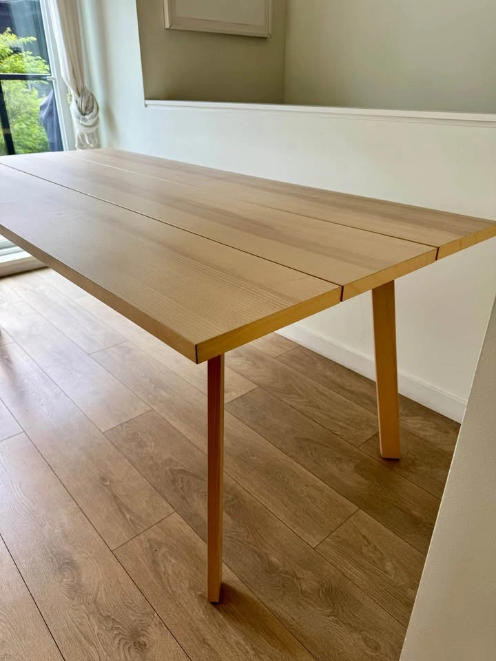 60Used, in mint condition. We are selling because it is too big for our living room. It seats 6 people comfortably but we have seated up to 8 people. YPPERLIG table is a modern version of the traditional Scandinavian plank table. It has a stable metal underframe and 3 planks which comes in a flat-pack, making it easier to bring home. Measurements Length: 200 cm Width: 90 cm Height: 74 cm A slightly wider table with plenty of space for dinners, homework, crafts, and other everyday activities. Solid wood, veneer and steel are durable materials that are easy to keep clean. The table surface in ash veneer and legs in solid birch give a warm, natural feeling to your room. The table top has pre-drilled holes for the underframe which makes assembly easy. The table top is produced with a lightweight construction that requires less material than solid wood and reduces the impact on the environment. Material Top panel: Particleboard, real Ash veneer, Fibreboard, Solid birch, Fibreboard, Tinted clear acrylic lacquer Leg: Solid birch, Tinted clear acrylic lacquer Frame: Steel, Epoxy/polyester powder coating